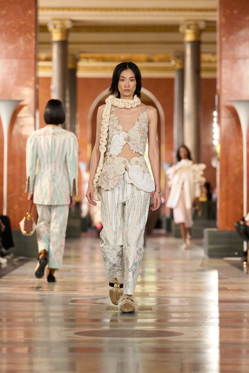 ニコラは今シーズン、親密さと自由を讃えるコレクションを制作。「家」を人生における安らぎの場と捉え、ルームウェアとワードローブの概念を再解釈したという。それは、視点を変え、スタイルを解放する試み。構築的なフォルムはそのままに、ゆったりと流れるようなシルエットの心地よさを感じさせるスタイルが数多く登場した。