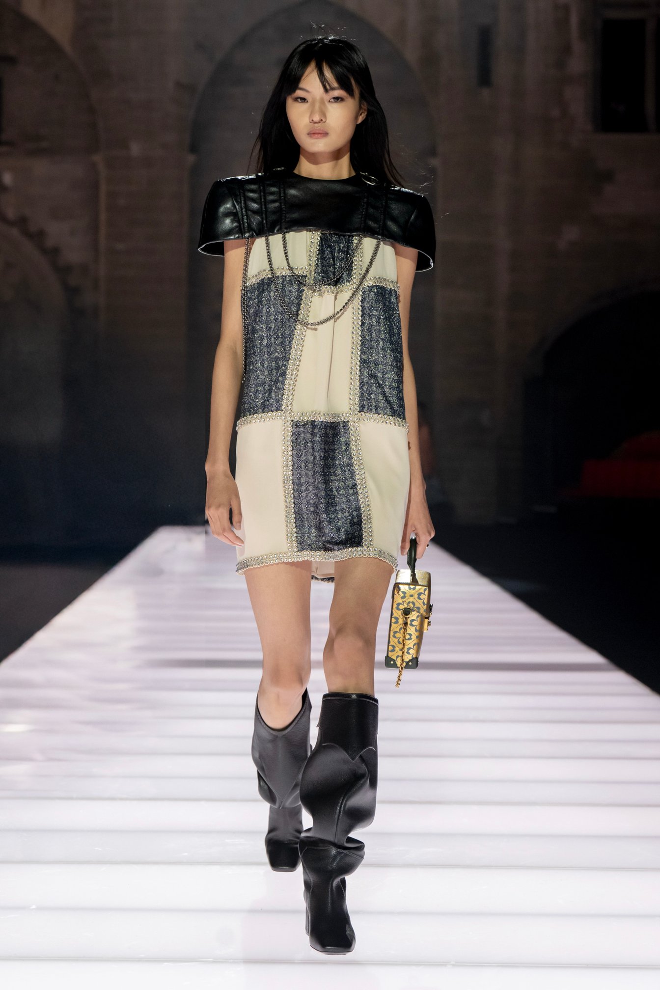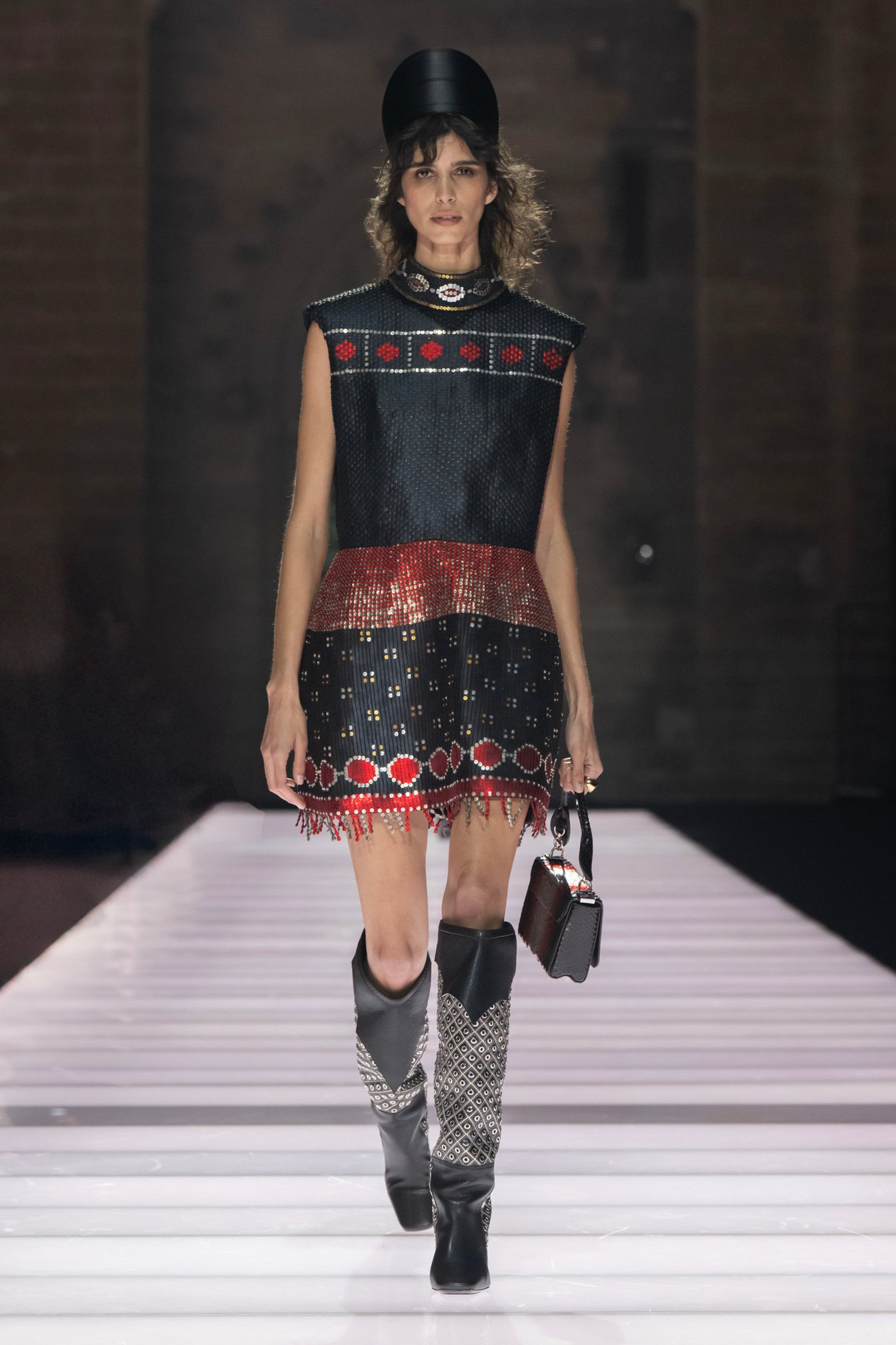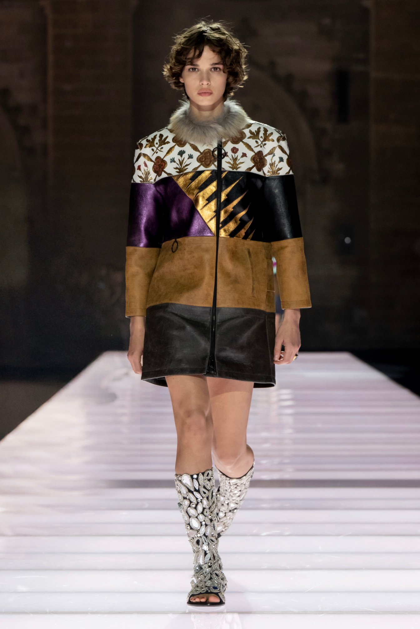 2026年クルーズコレクションは、中世の騎士を思わせるスパングル装飾のミニドレスからスタート。色鮮やかな鎧のような輝きを放った。続いて、マント風に仕立てたAラインのコートドレスや、ジャカードにパールやスパングル、チェーンを配したミニドレスに、ボリュームのあるレザーブーツを合わせたスタイルのモデルが、風を切って力強いウォーキングを見せた。