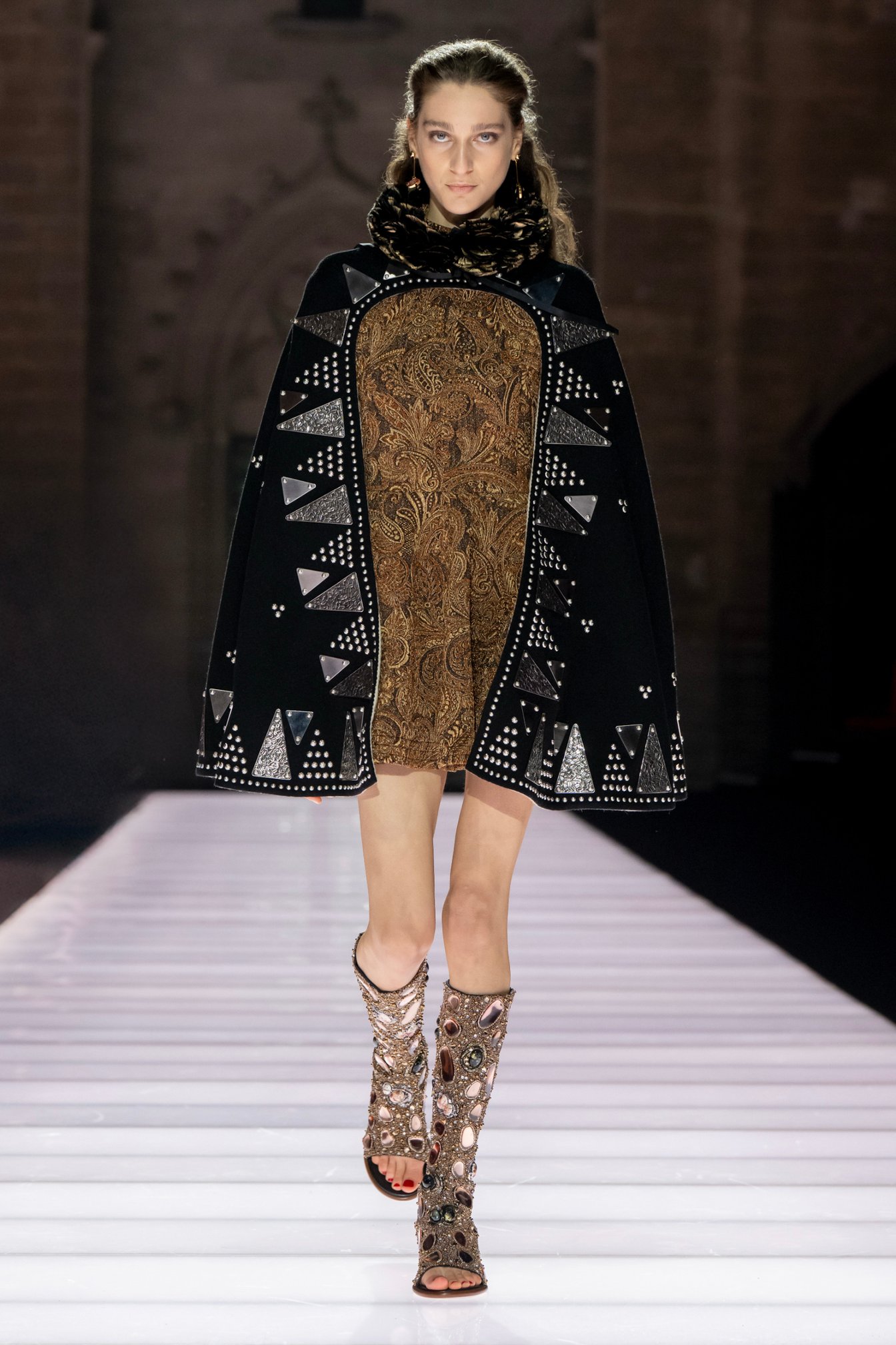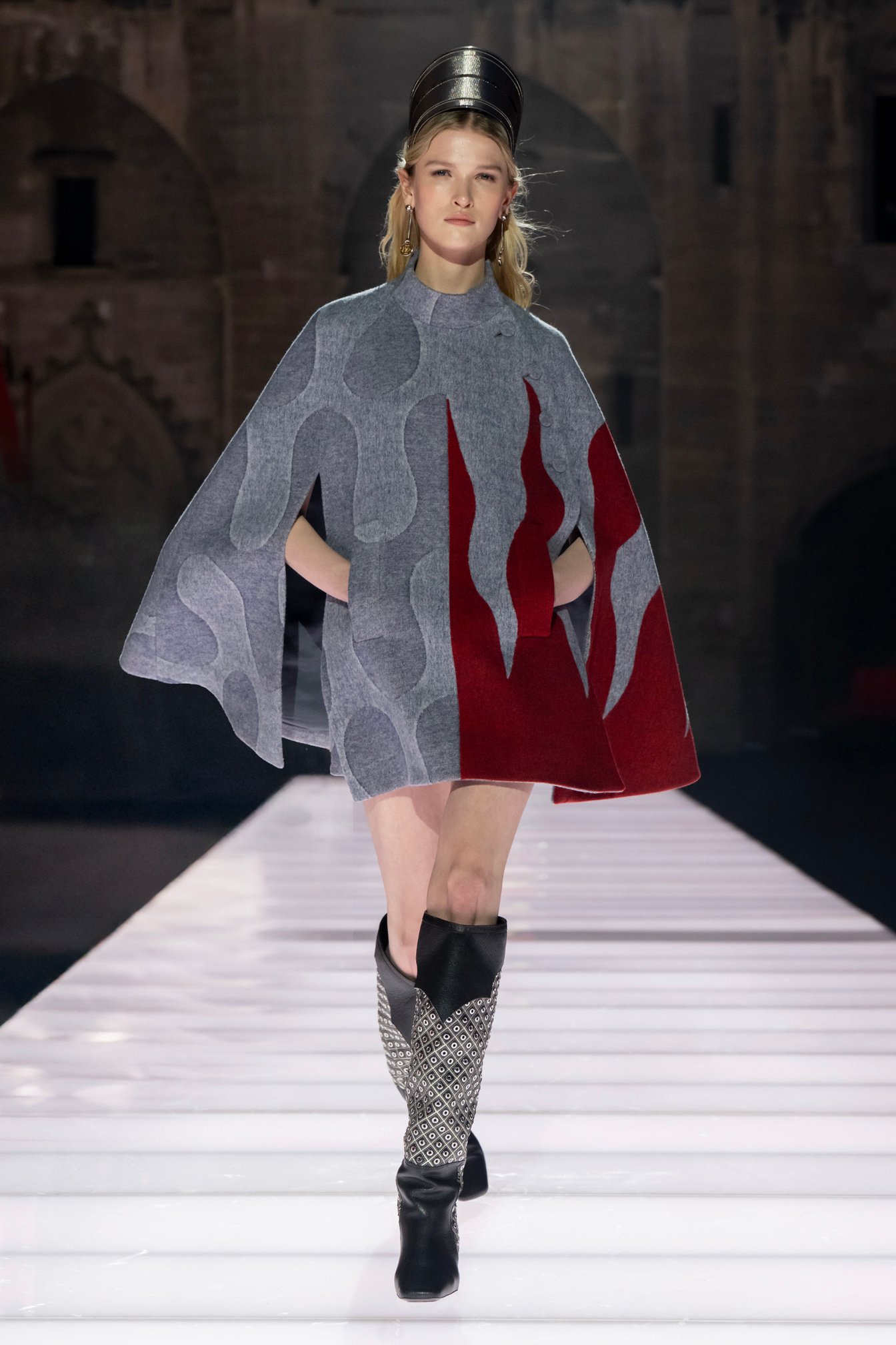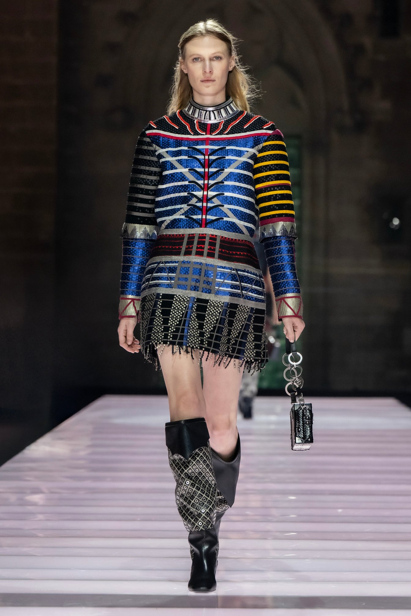 2026年クルーズコレクションは、中世の騎士を思わせるスパングル装飾のミニドレスからスタート。色鮮やかな鎧のような輝きを放った。続いて、マント風に仕立てたAラインのコートドレスや、ジャカードにパールやスパングル、チェーンを配したミニドレスに、ボリュームのあるレザーブーツを合わせたスタイルのモデルが、風を切って力強いウォーキングを見せた。