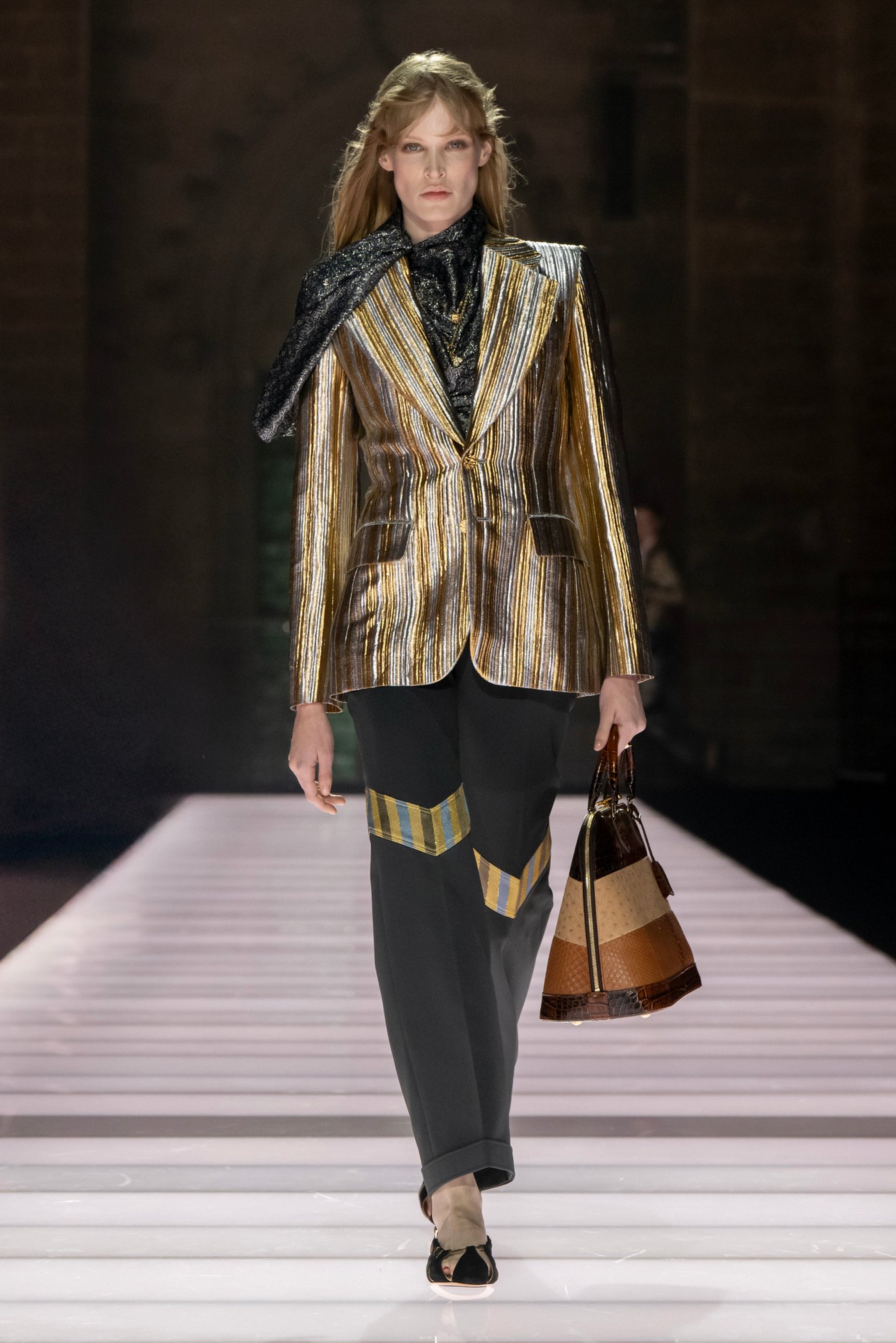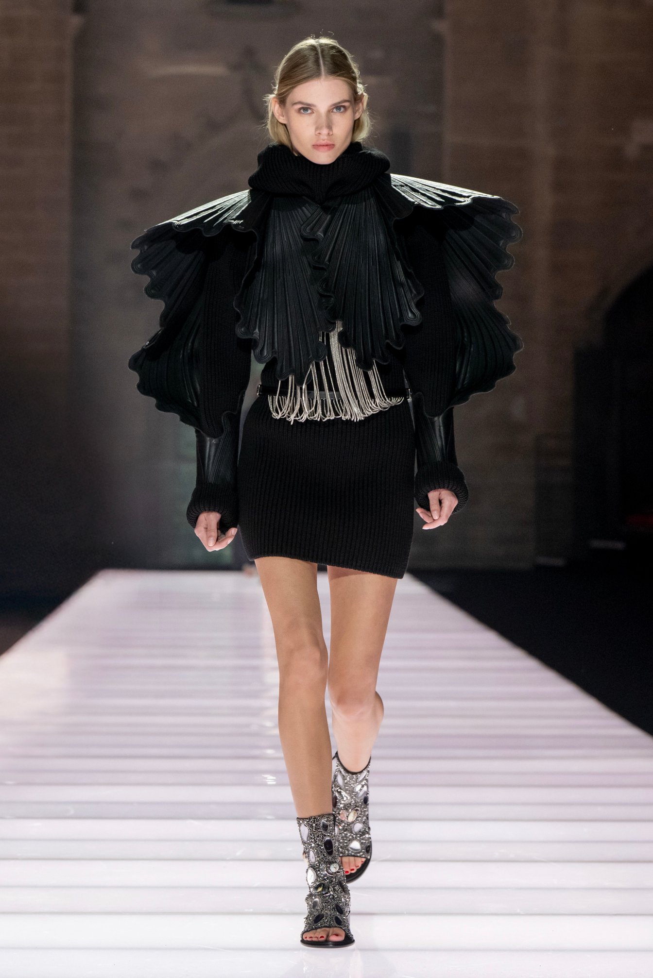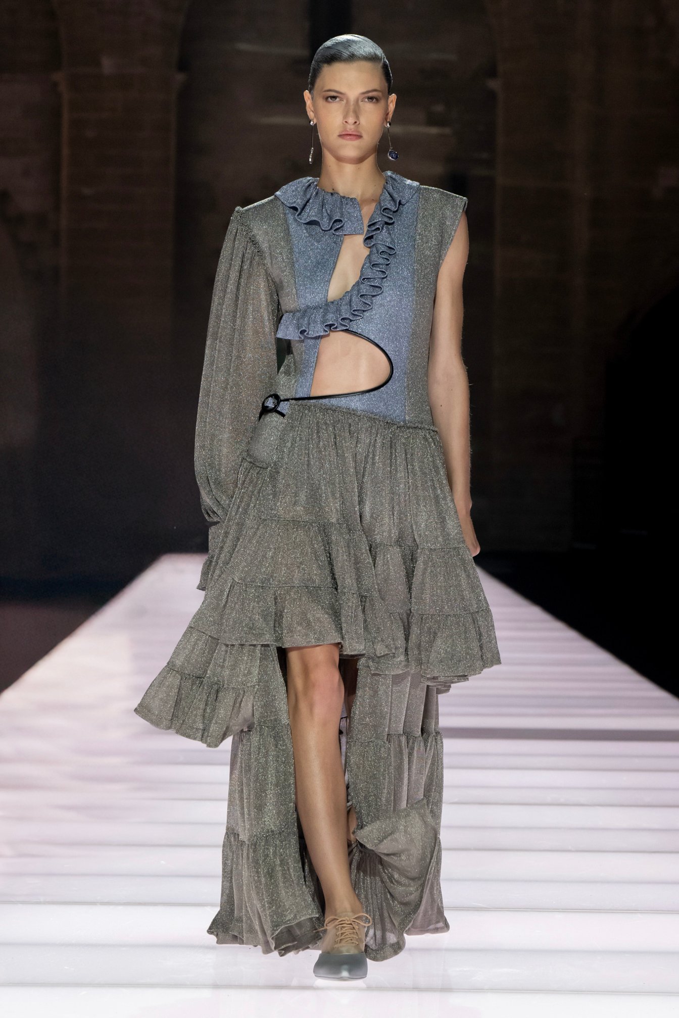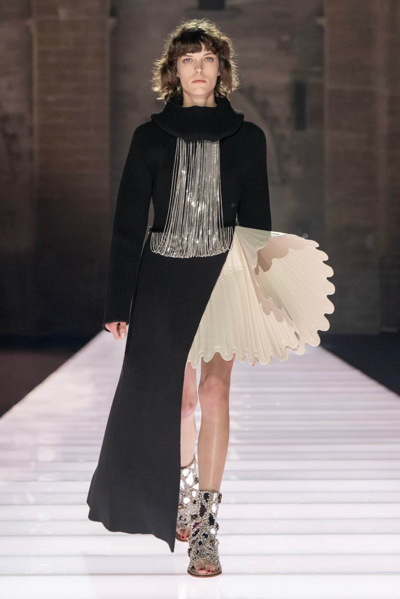 ジェスキエールらしい構築的なシルエットも健在。ラメニットやレースをふんだんに用いたロングドレス、金銀の織り糸が映えるテーラードジャケット、ホログラム調のパンツルック、コンパクトなレザーブルゾンやセットアップなど、光沢を主役にしたワードローブがドラマティックに展開された。