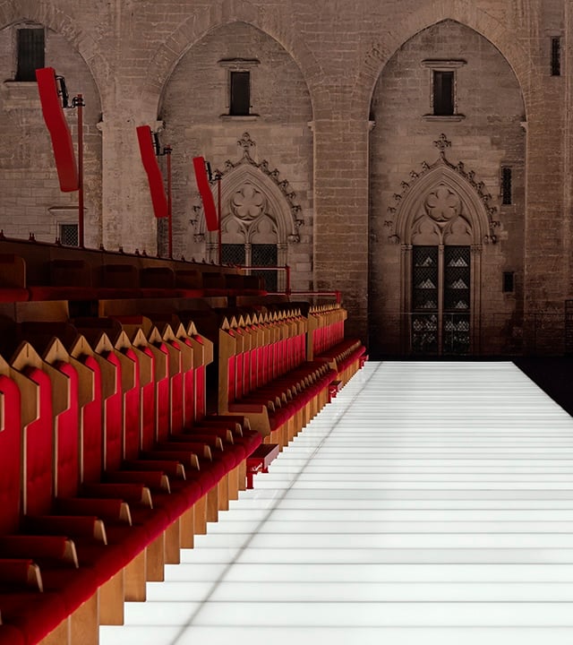 今回のショー会場となったアヴィニョンのパレ・デ・パプは、世界最大級の中世ゴシック様式の宮殿。1309年から1377年までローマ教皇庁が移された場所で、床面積は1万5000平方メートルにおよぶ。現在ではアヴィニョン演劇祭や現代美術の展覧会など、文化イベントの舞台にもなっている。