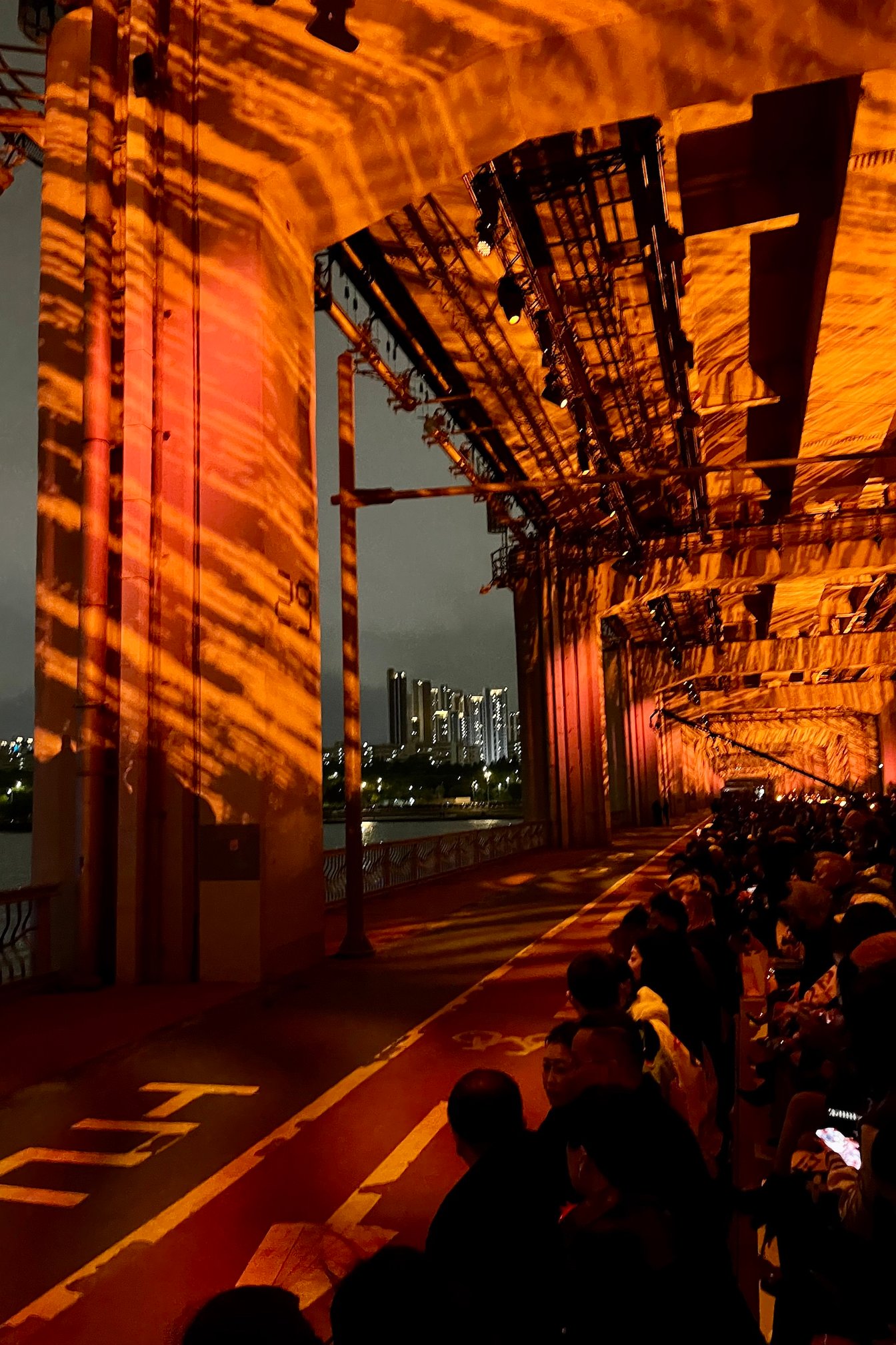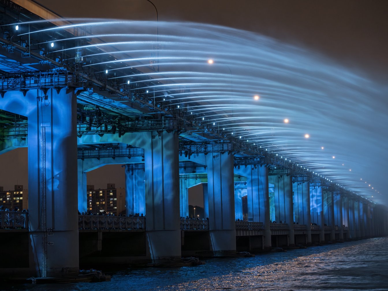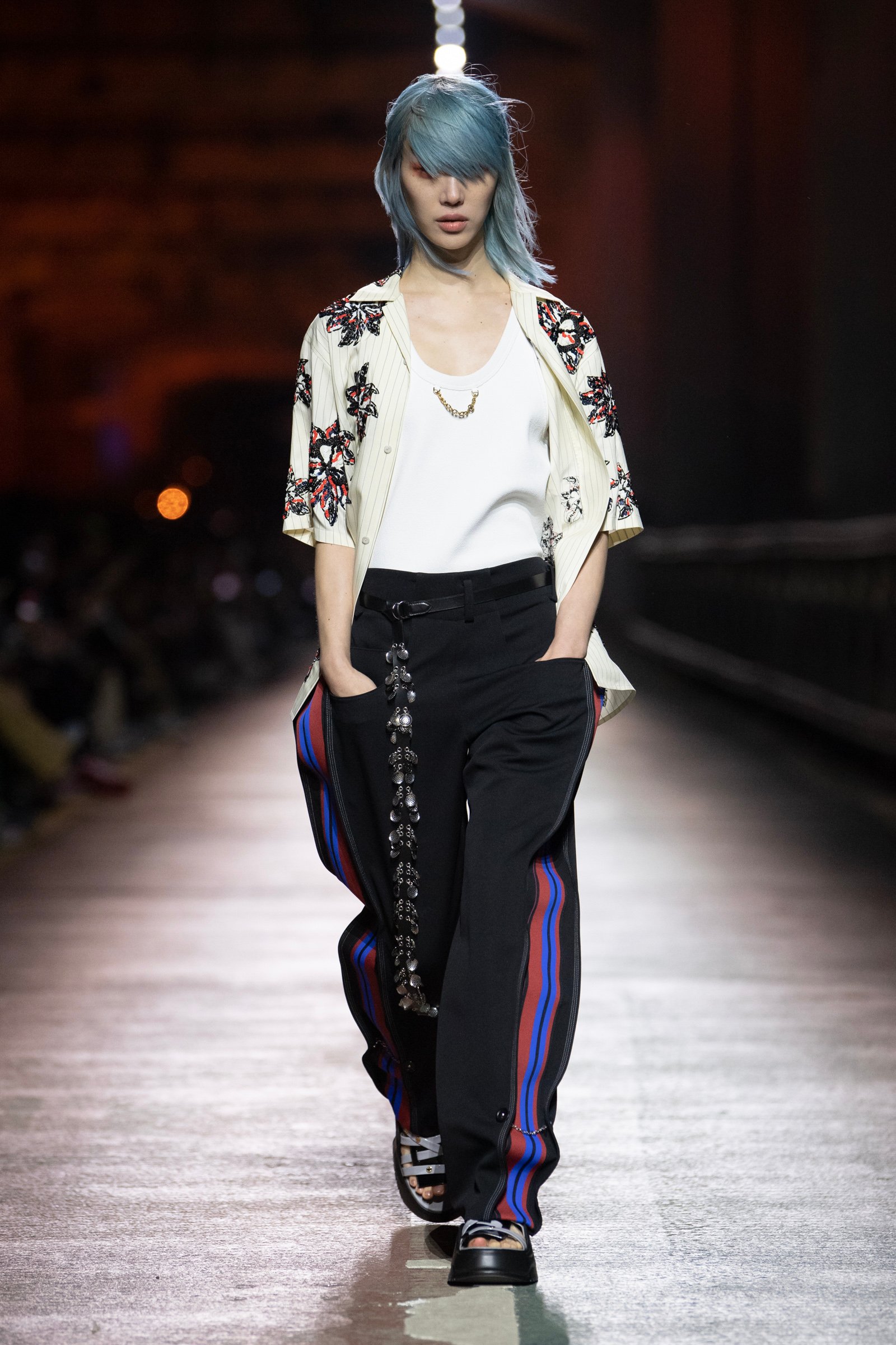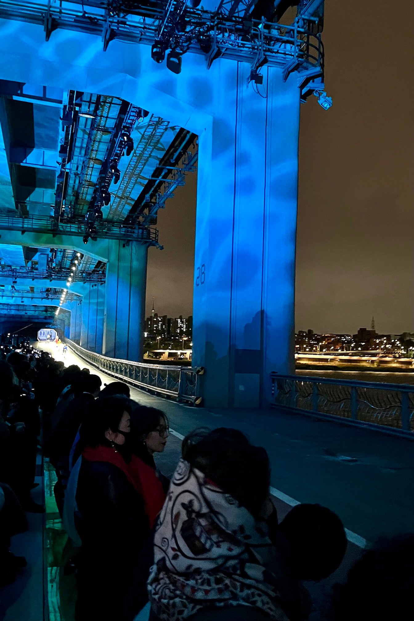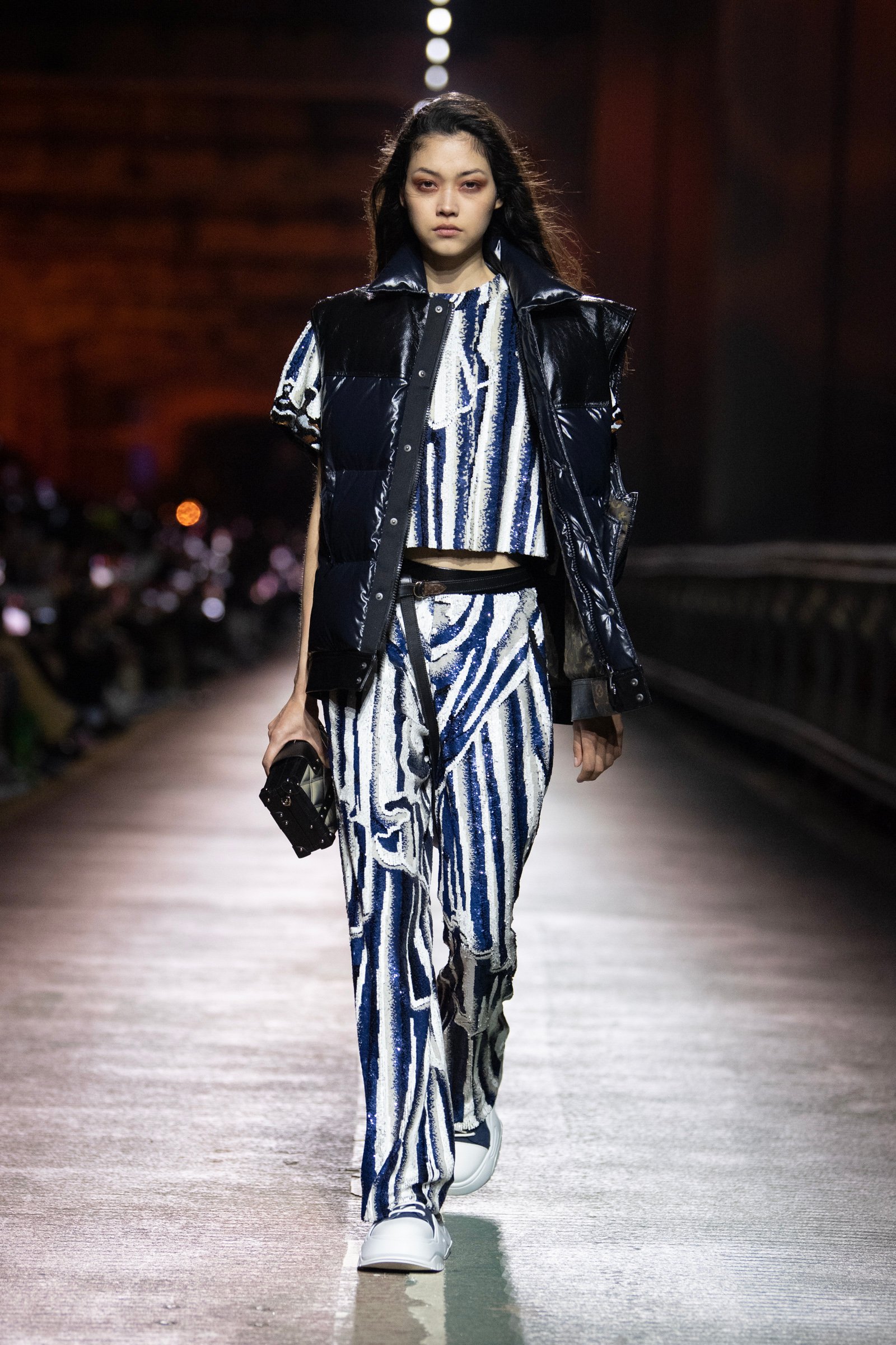 会場となった潜水橋は、ソウルの中心を流れる漢江(ハンガン)に架かる象徴的な橋。上下二段の構造の下側に位置し(上部に架かる橋は盤浦大橋)、ここで大規模なファッションショーが行われるのは1976年の竣工以来初めてとなる。車道に客席を並べ、全長443メートルのランウェイを設置。舞台美術はNetflixオリジナルシリーズ「イカゲーム」で知られるファン・ドンヒョク(Hwang Dong-hyuk)監督がクリエイティブ・アドバイザーとして手掛け、ソウルの夜景を背景に光と水を操りショーを彩った。