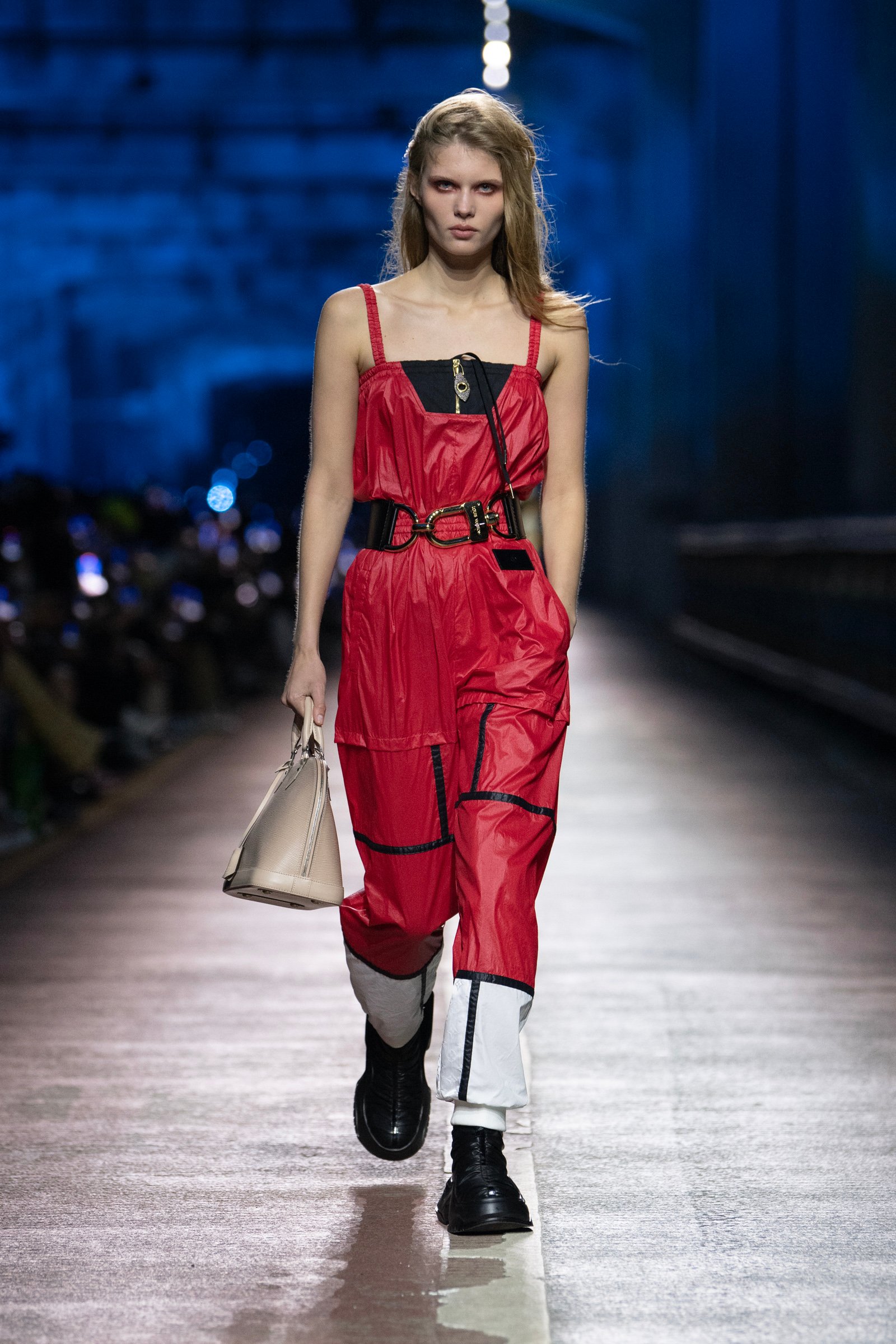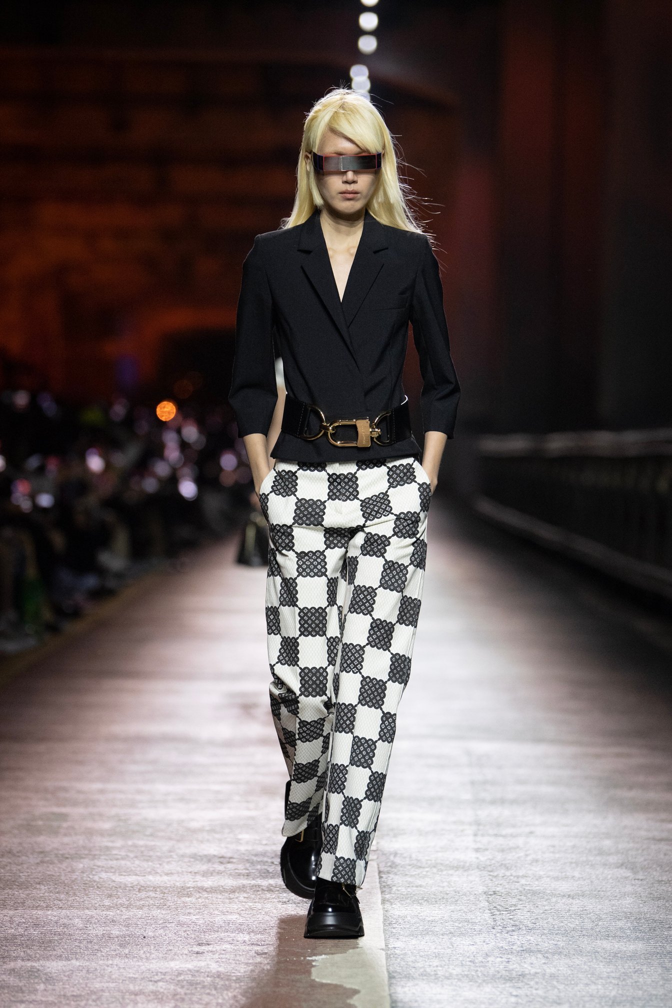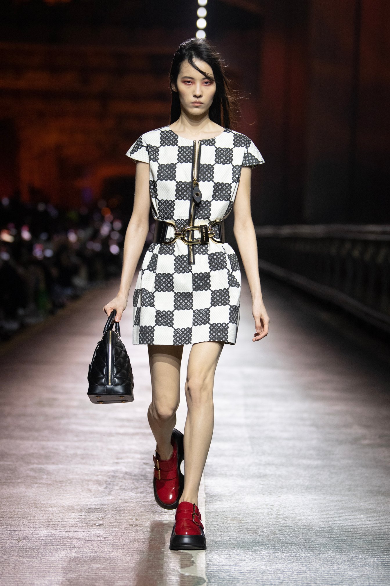 続くルックも、ミニドレスやセットアップといったオーセンティックなアイテムをベースとしながら、アーティスティック・ディレクターのニコラ・ジェスキエール(Nicolas Ghesquière)ならではのフューチャリスティックなアレンジが加わった。ティーザームービーでフィーチャーされたダミエ柄は、新たなパターンでドレスやパンツに応用されている。