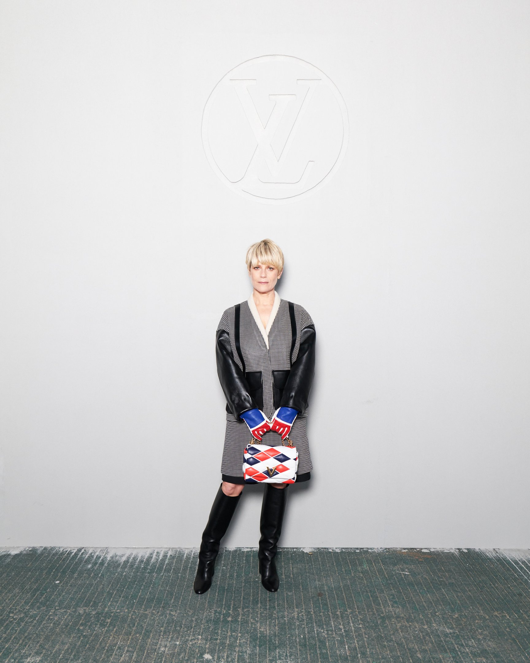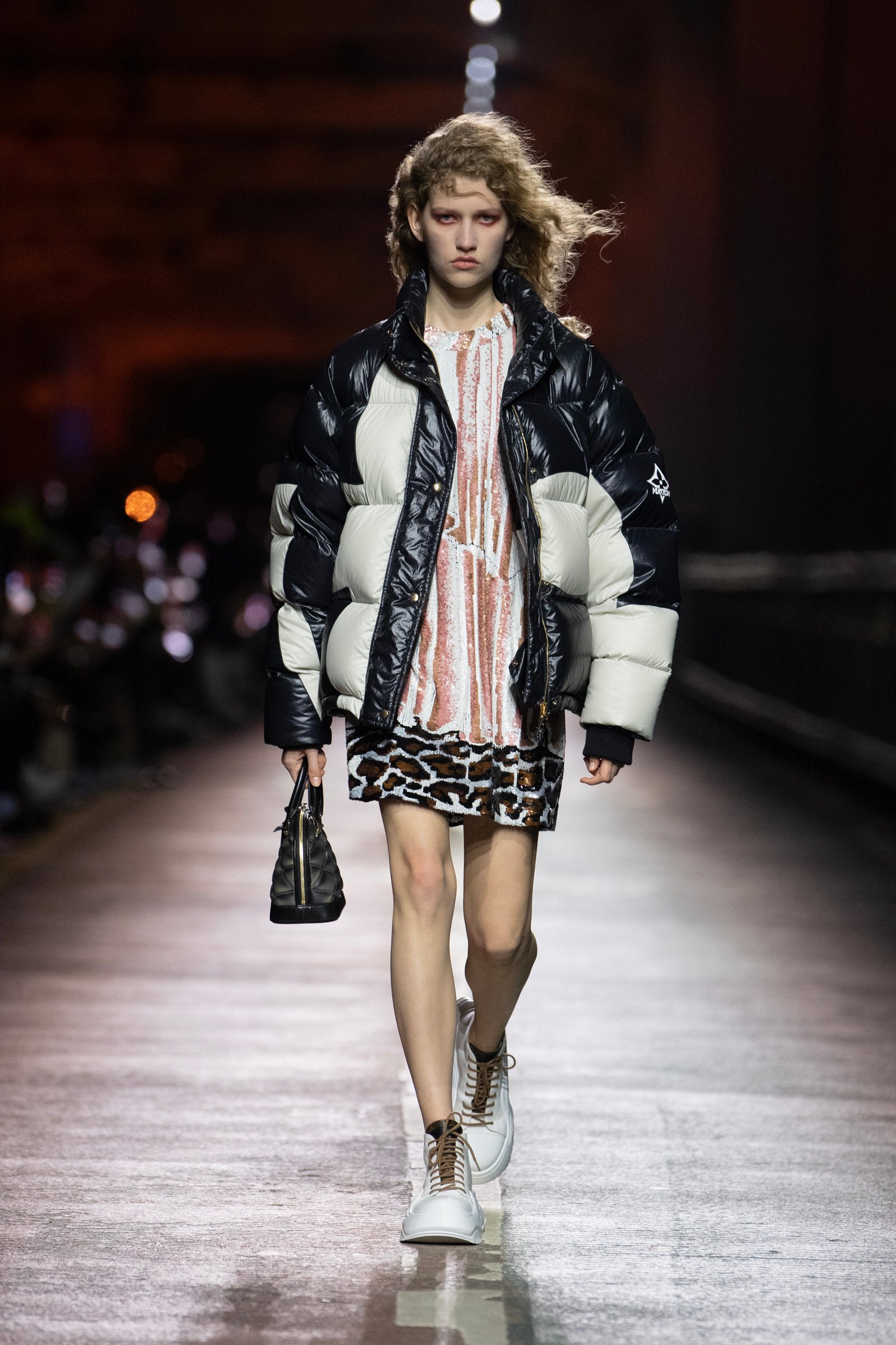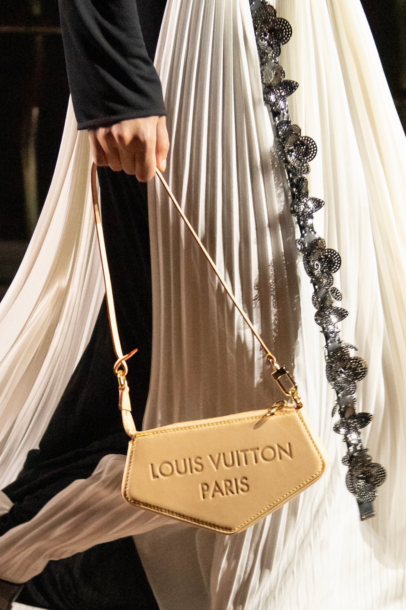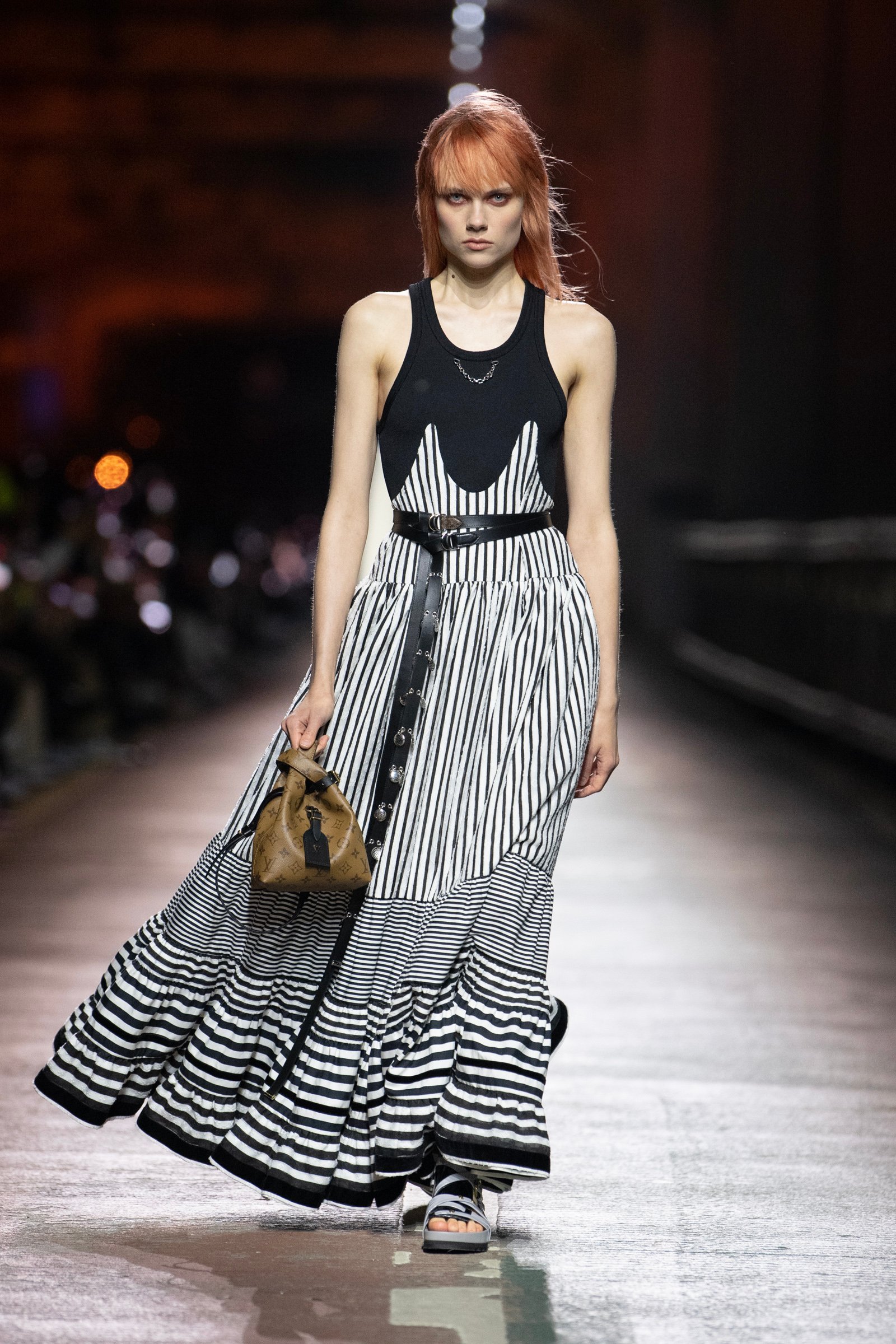続くルックも、ミニドレスやセットアップといったオーセンティックなアイテムをベースとしながら、アーティスティック・ディレクターのニコラ・ジェスキエール(Nicolas Ghesquière)ならではのフューチャリスティックなアレンジが加わった。ティーザームービーでフィーチャーされたダミエ柄は、新たなパターンでドレスやパンツに応用されている。