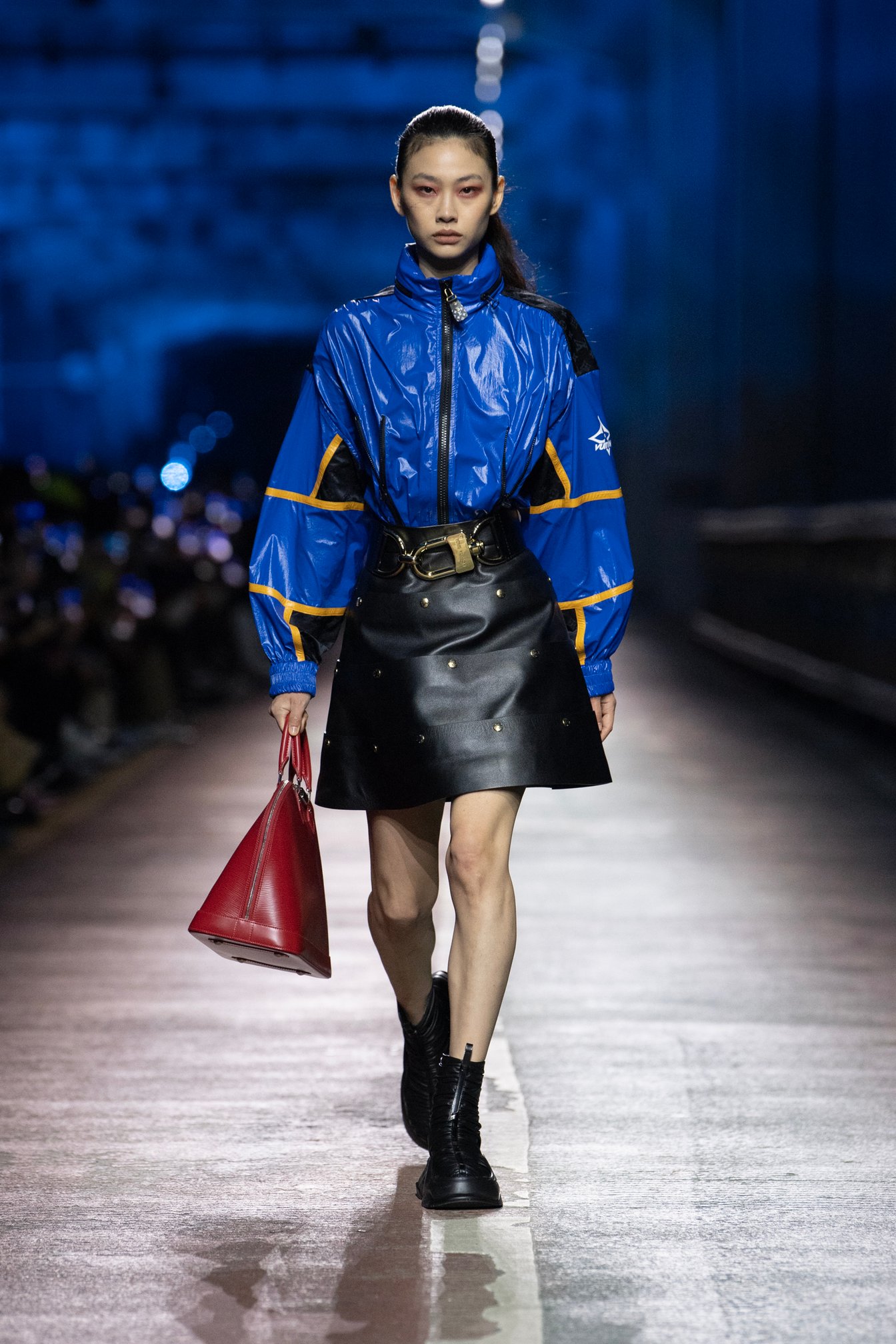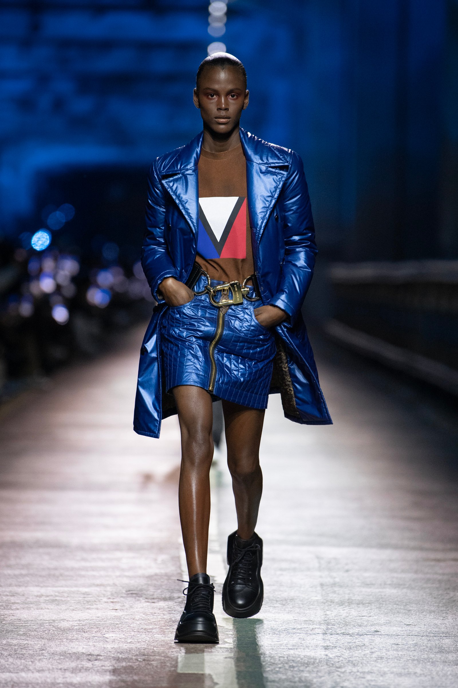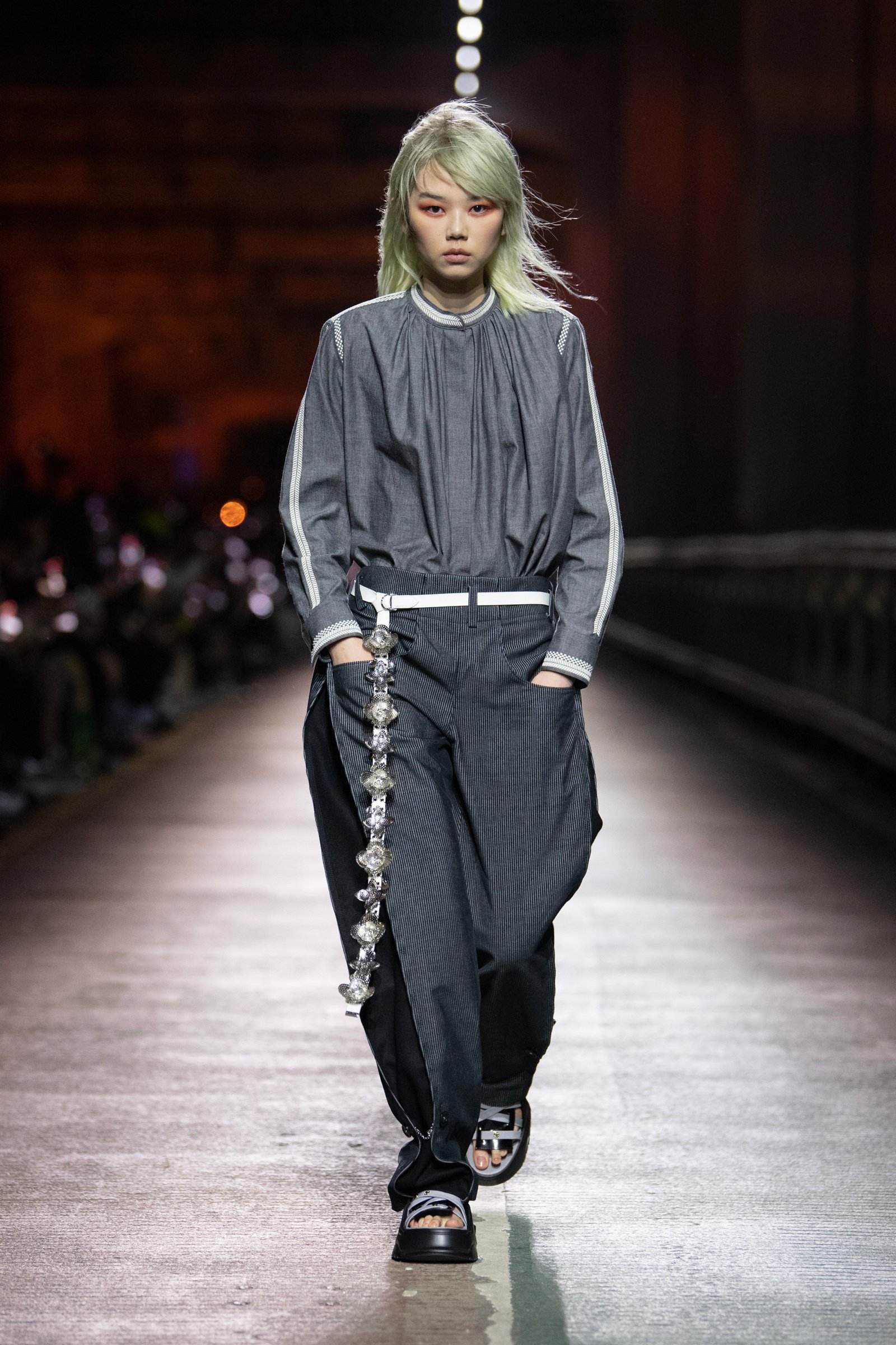 ショーが始まると会場がブルーの光で染まり、観客を異空間に誘う。船室を思わせるトンネルからモデルが登場し、強い横風を受けながらも力強くウォーキングした。ファーストルックを務めたのはメゾンのアンバサダーでイカゲームにも出演したチョン・ホヨン(Jung Hoyeon)。濡れたような艶を放つブルーのブルゾンが会場演出と呼応する。ベルトによるウエストマークは今シーズンの特徴のひとつで、デフォルメされた金具がアクセントに。