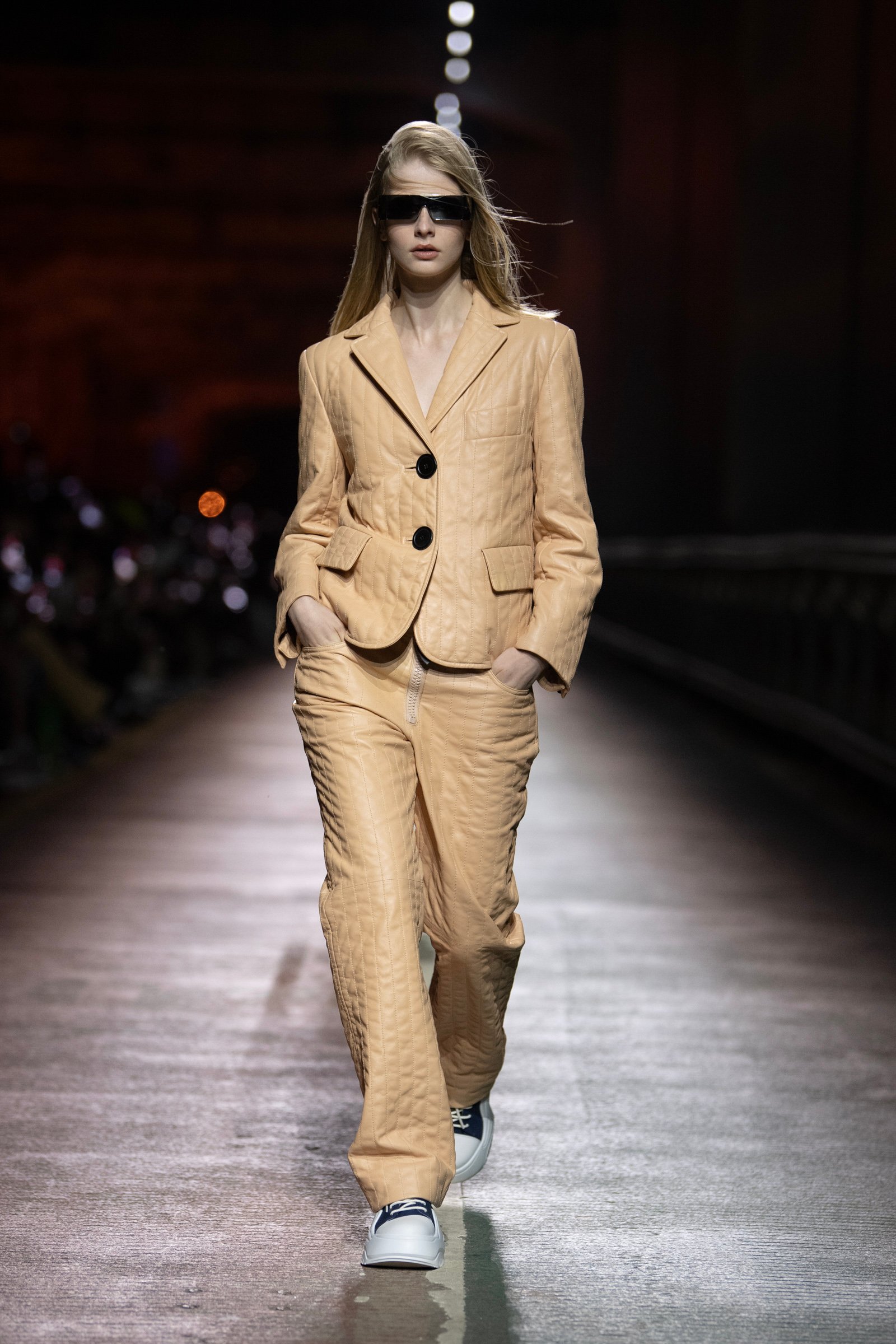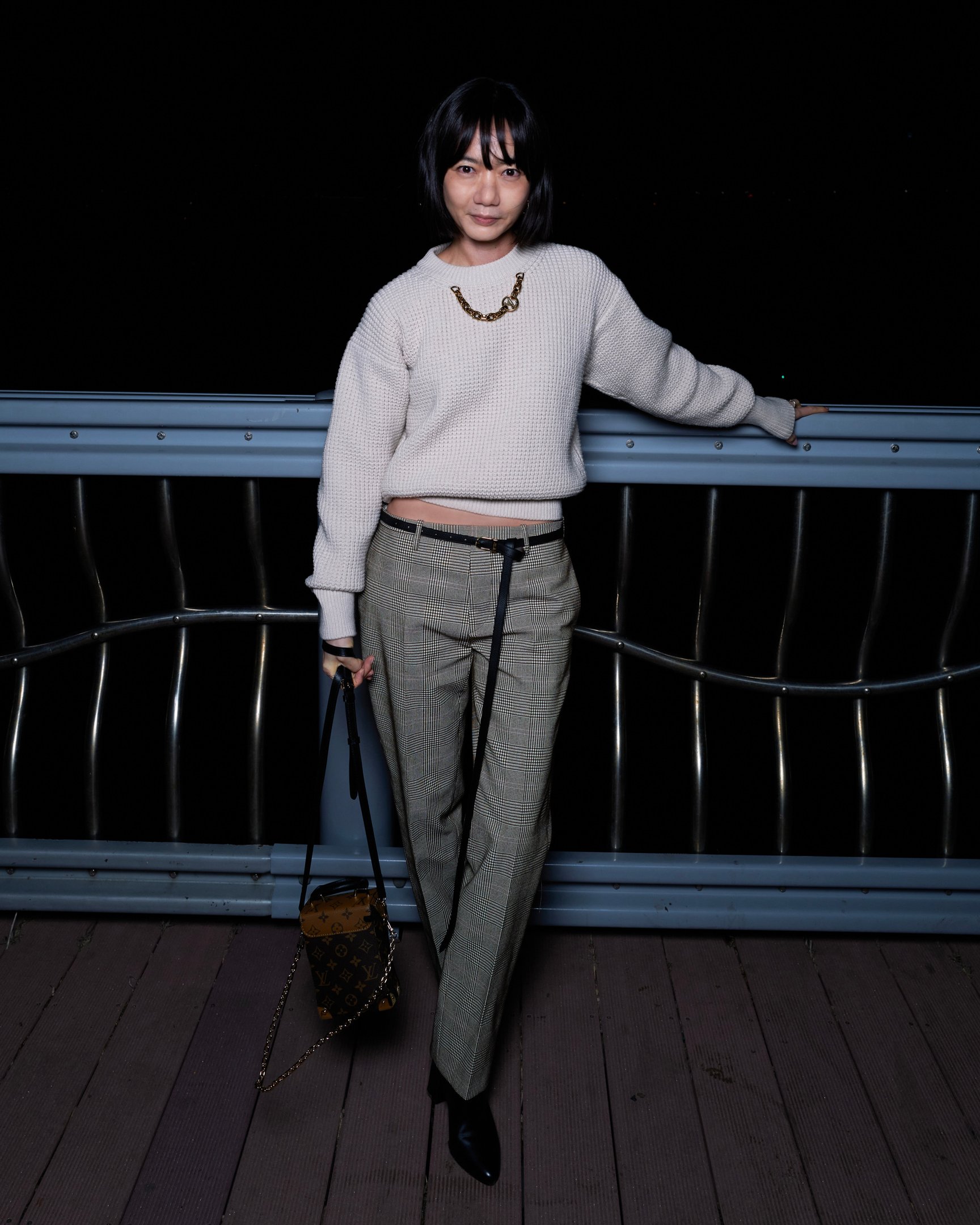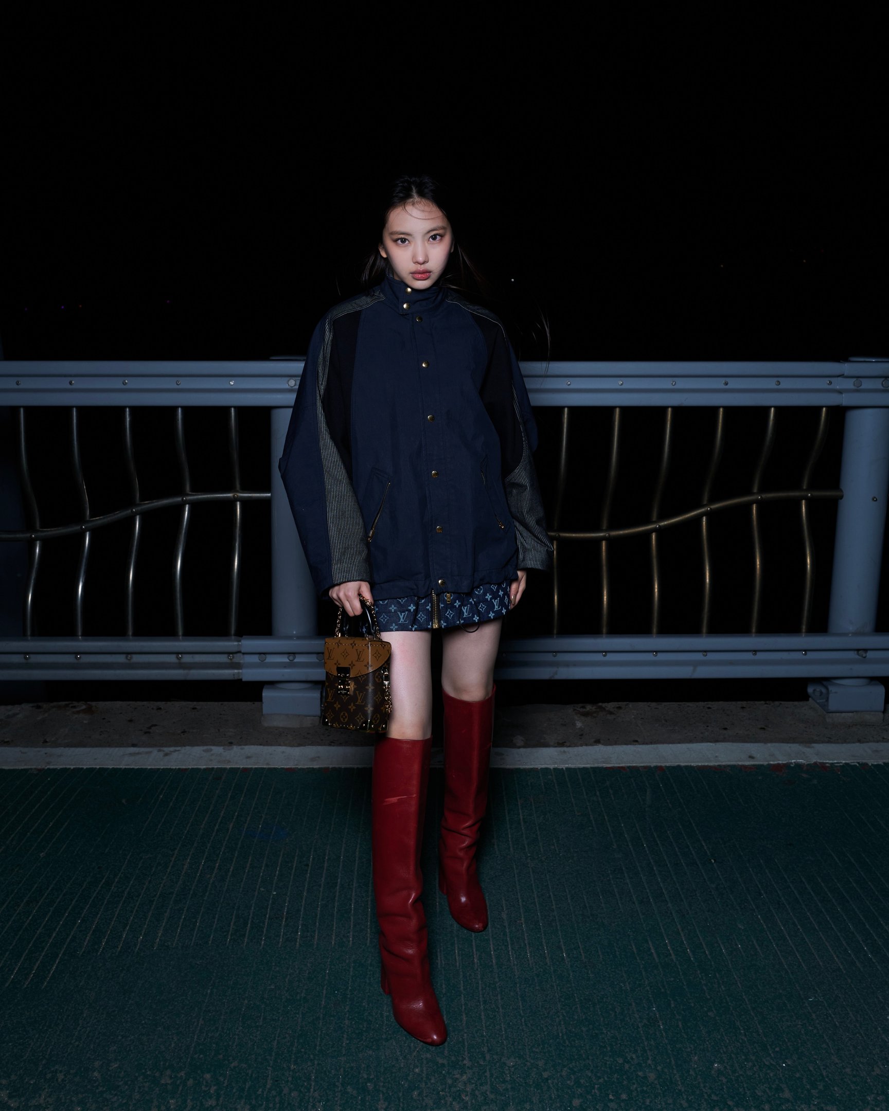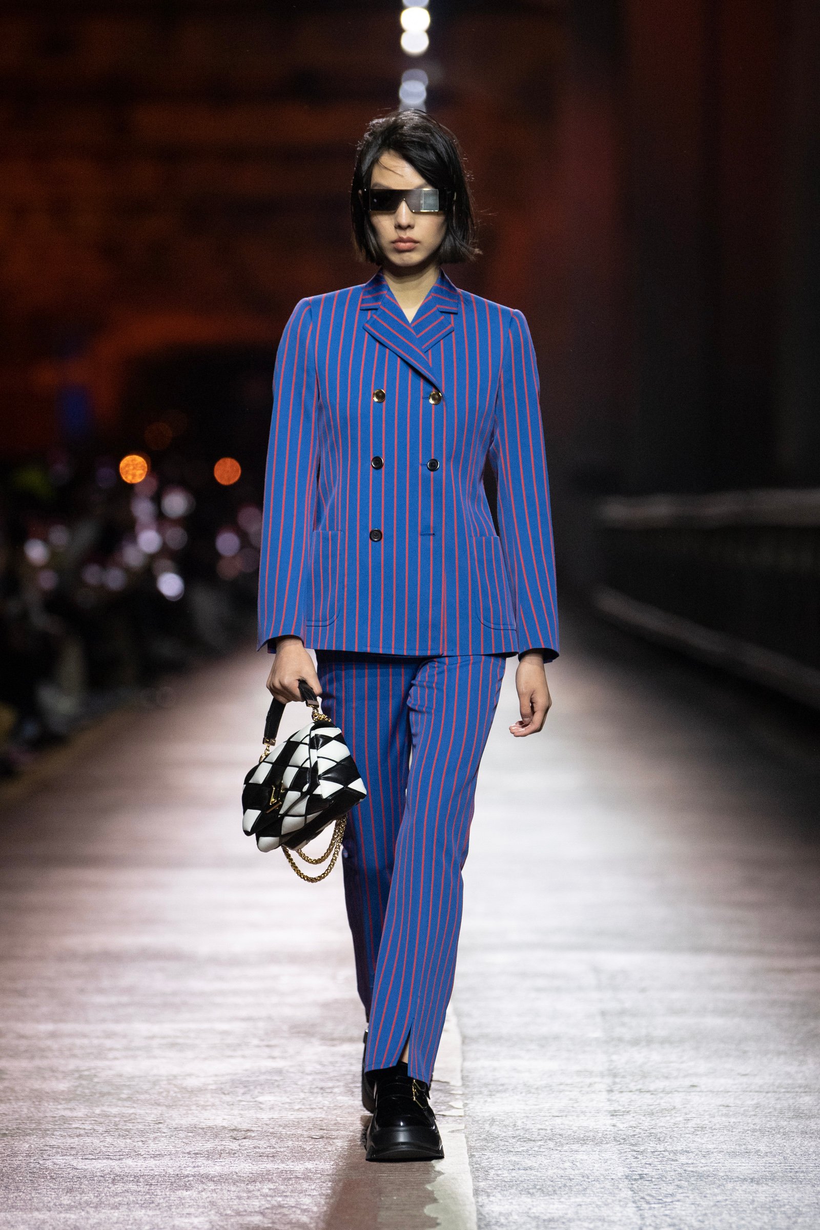 ショーが始まると会場がブルーの光で染まり、観客を異空間に誘う。船室を思わせるトンネルからモデルが登場し、強い横風を受けながらも力強くウォーキングした。ファーストルックを務めたのはメゾンのアンバサダーでイカゲームにも出演したチョン・ホヨン(Jung Hoyeon)。濡れたような艶を放つブルーのブルゾンが会場演出と呼応する。ベルトによるウエストマークは今シーズンの特徴のひとつで、デフォルメされた金具がアクセントに。