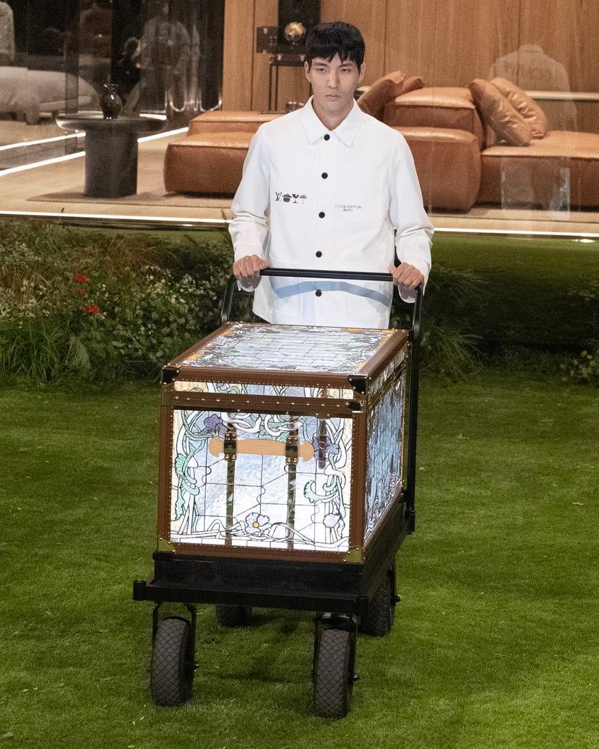 メゾンの歴史を刻むトランクは今回、アニエールに位置するヴィトン家のステンドグラスをモチーフにデザイン。ショーの開催地が「フォンダシオン ルイ・ヴィトン」の敷地であったことも、"ホーム"を印象付けた。