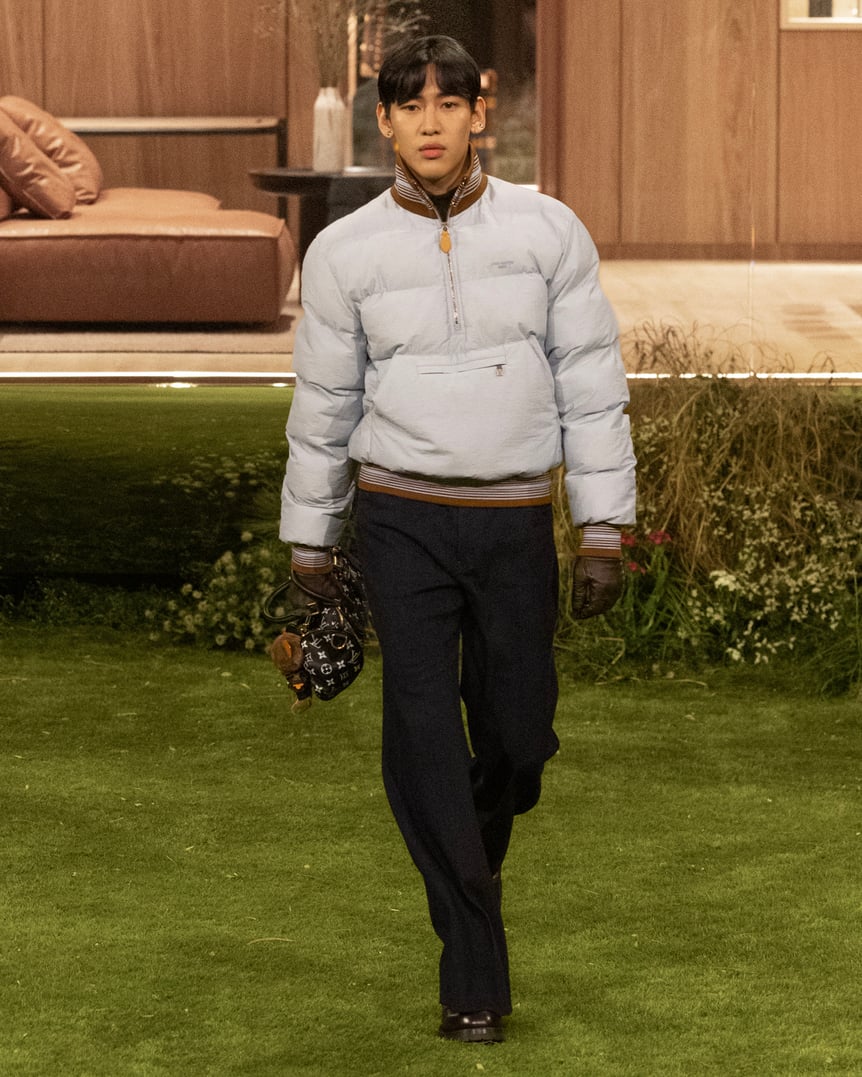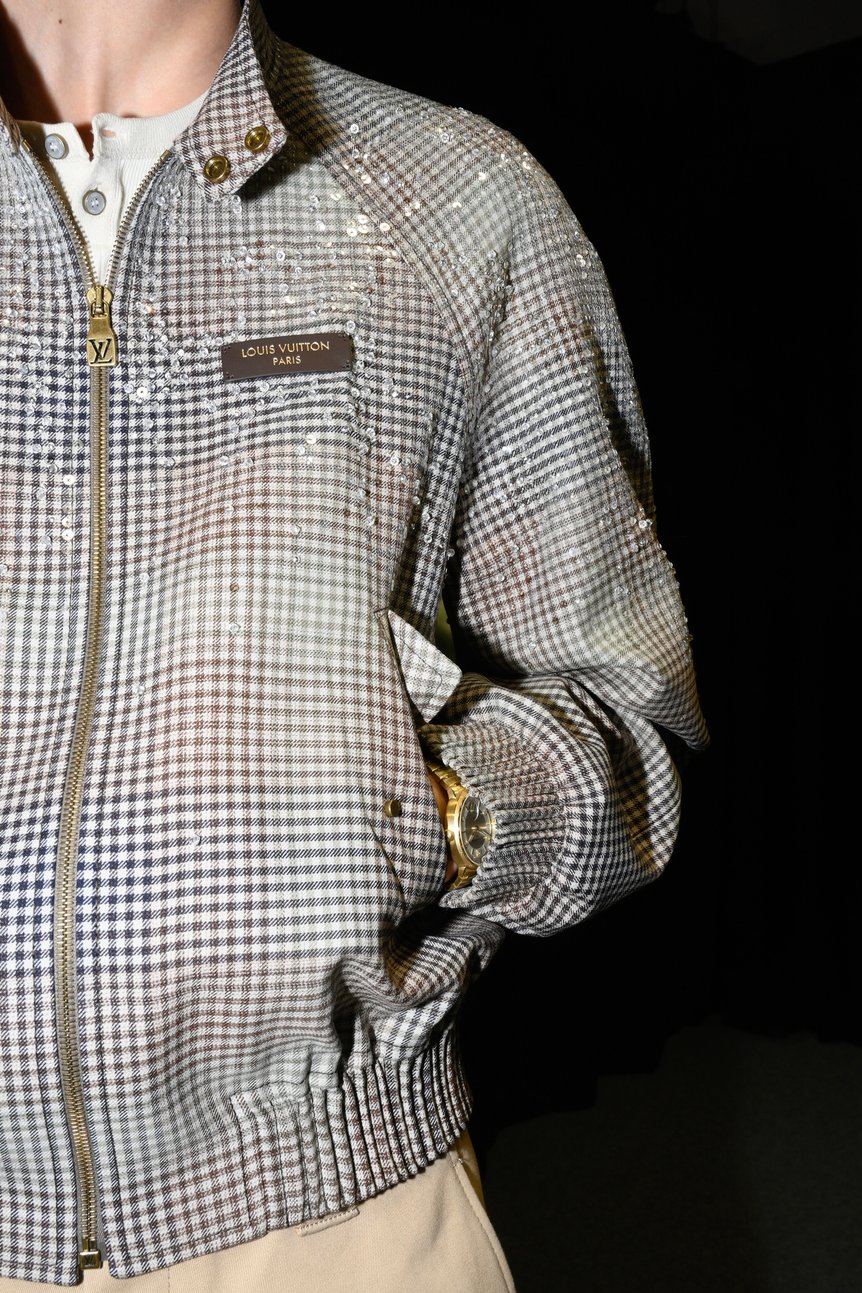「TIMELESS」のテーマの下、コレクション全体を通じて顕著だったのは革新的な素材開発だ。「タイムレス・テキスタイル」と称し、機能性、耐久性、技術的卓越性を追求。光に反射する糸、体温調節機能を持つインナー、独特なシワが身体に沿うアルミニウム入りのテキスタイルなど、機能性とテクスチャーは多岐にわたる。モノグラムのジャケットやバッグに用いた「LVシルク-ナイロン」は、シルクとリサイクルナイロンの混紡により、撥水性とレザーのような光沢をたたえる。また、クリスタルの刺繍や樹脂の粒など、雨滴を浴びたかのような加工を随所に施した。最新のテクノロジーを駆使しながら手仕事と融合し、新たな時代のクラフトマンシップを提示している。