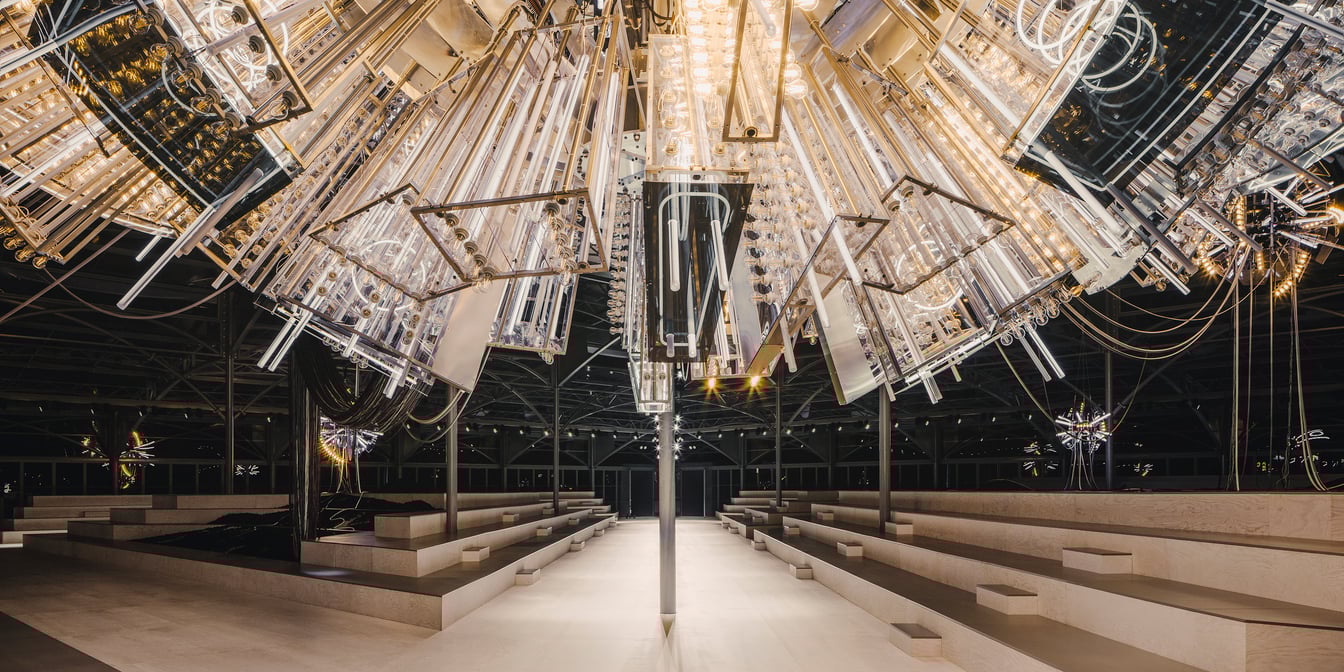 ショー会場は、ルーヴル美術館の中庭クール・カレ。10年前のファーストコレクションを発表したメモリアルな場所であり、それ以降も何度もショーを開催してきた、ニコラとルイ・ヴィトンの双方にとって特別な場所である。空間美術はアーティストのフィリップ・パレーノ(Philippe Parreno)とプロダクション兼デザイナー、ジェームズ・チンランド(James Chinlund)が手がけた。特設された透明な施設は、スレート、鉱物、ガラスで未来的な温室のように装飾され、超新星爆発のような照明は煌々と輝き、周囲を照らす。