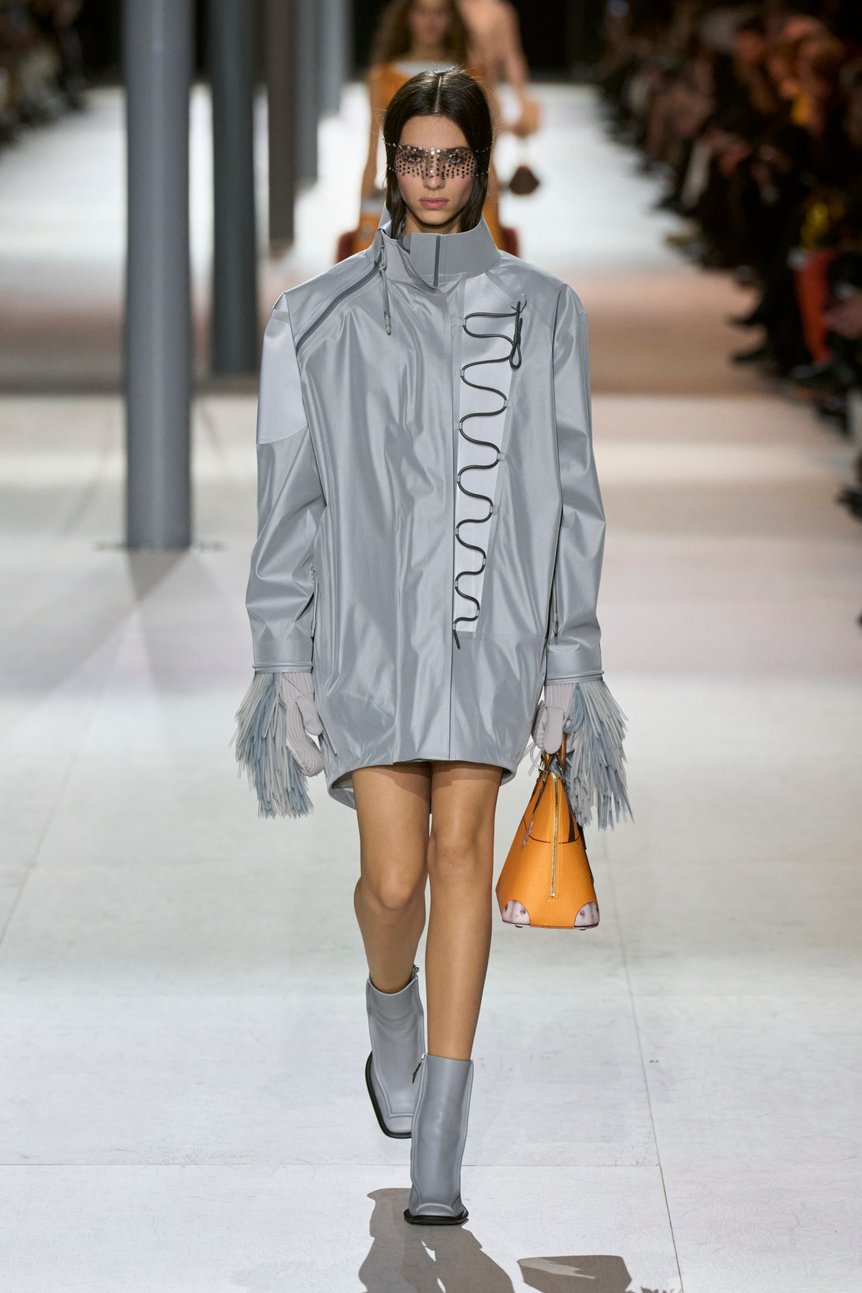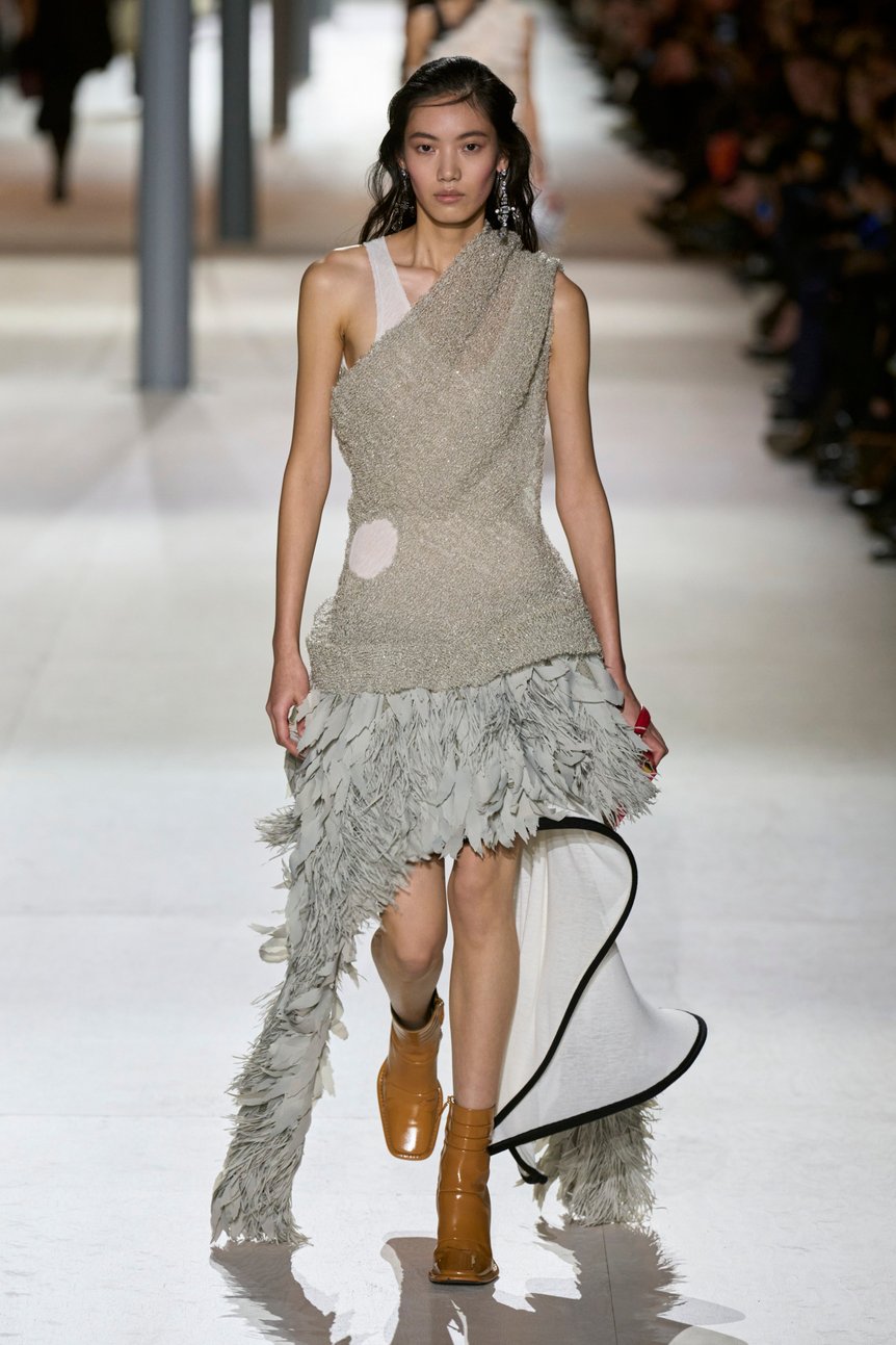 スポーティーなパーカにスクエアトゥのブーツを履き、袖からはフリンジ付きのグローブを覗かせた近未来的なファーストルックは、『イカゲーム』で一躍脚光を浴び、ブランドのアンバサダーである俳優のチョン・ホヨン。ここ数シーズンで何度もランウェイを歩き、ブランドの顔として定着している。