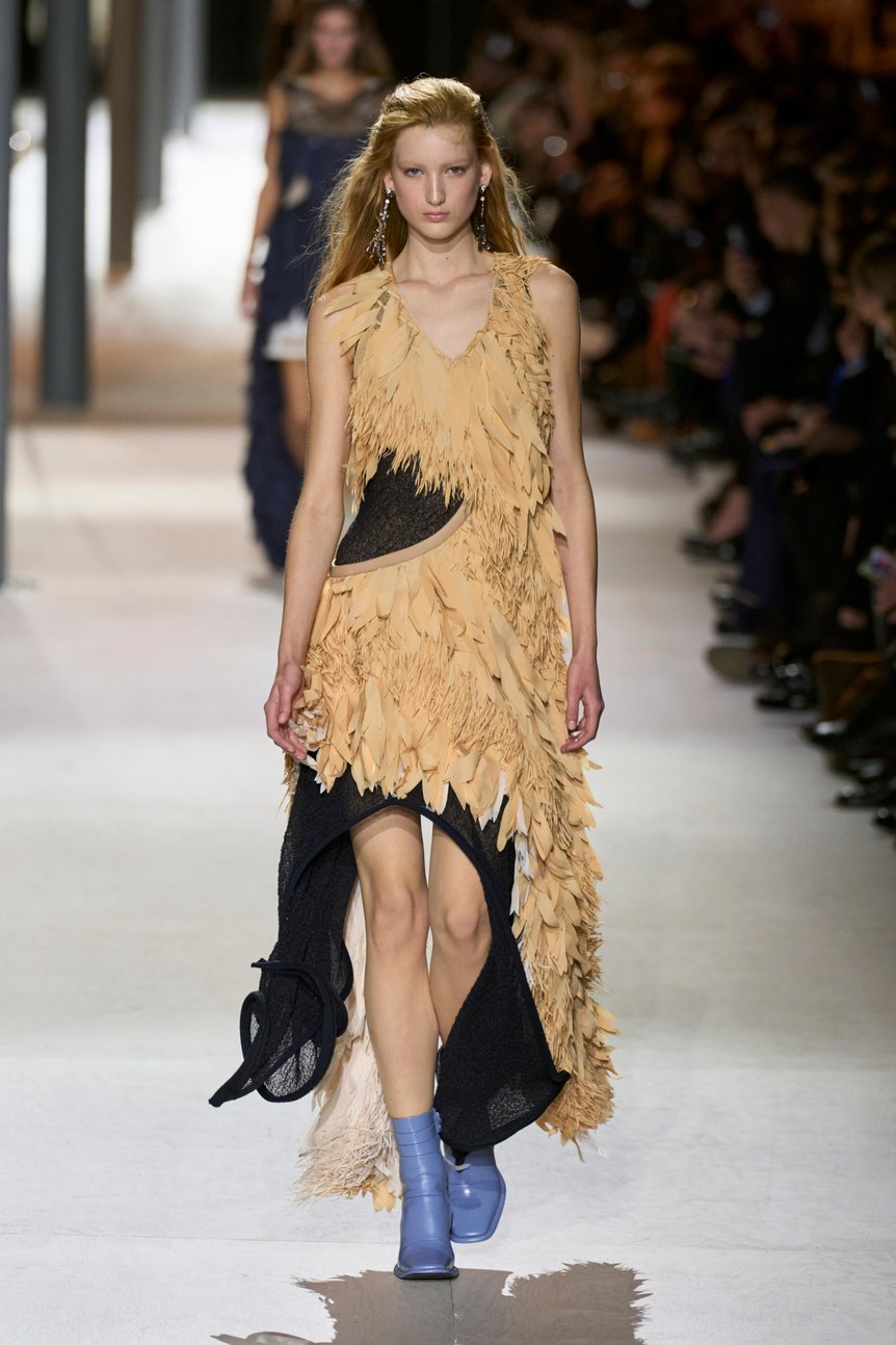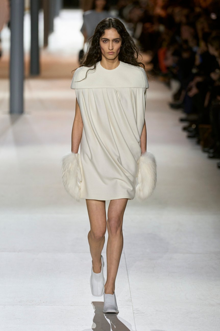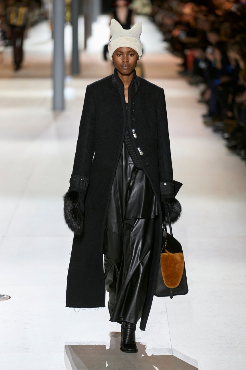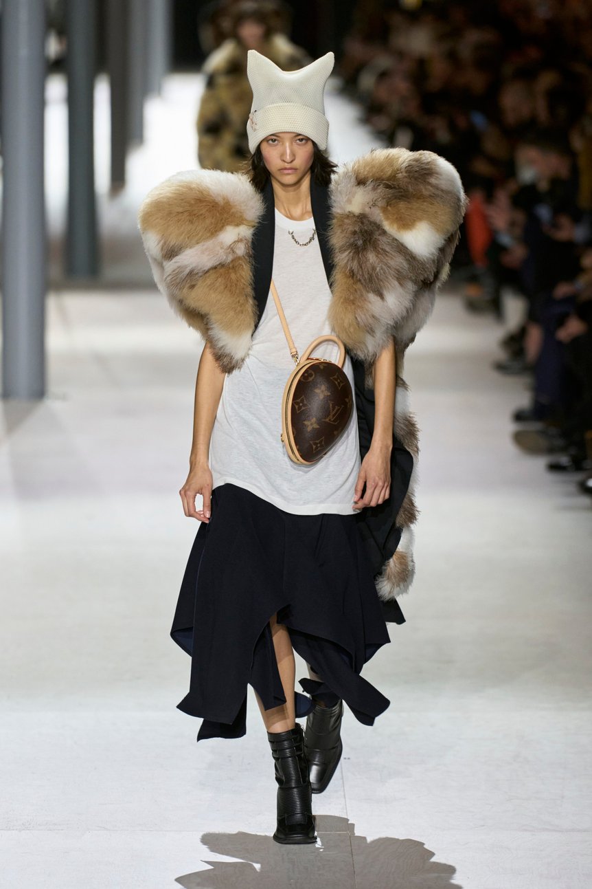 また、多くのルックに登場したフリンジとファーのグローブや動物の耳の形をしたビーニーなど、童的な可愛さをキャッチーに取り込みながら、最後はアシンメトリーのドレスでしっかりとエレガントにショーを締め括った。