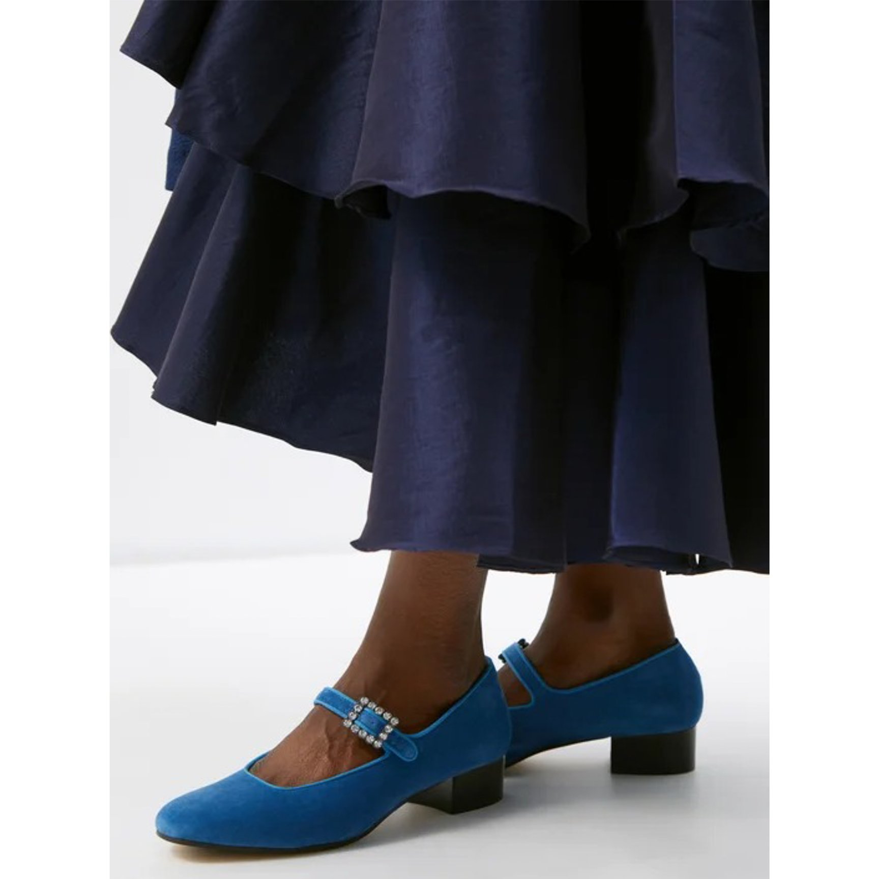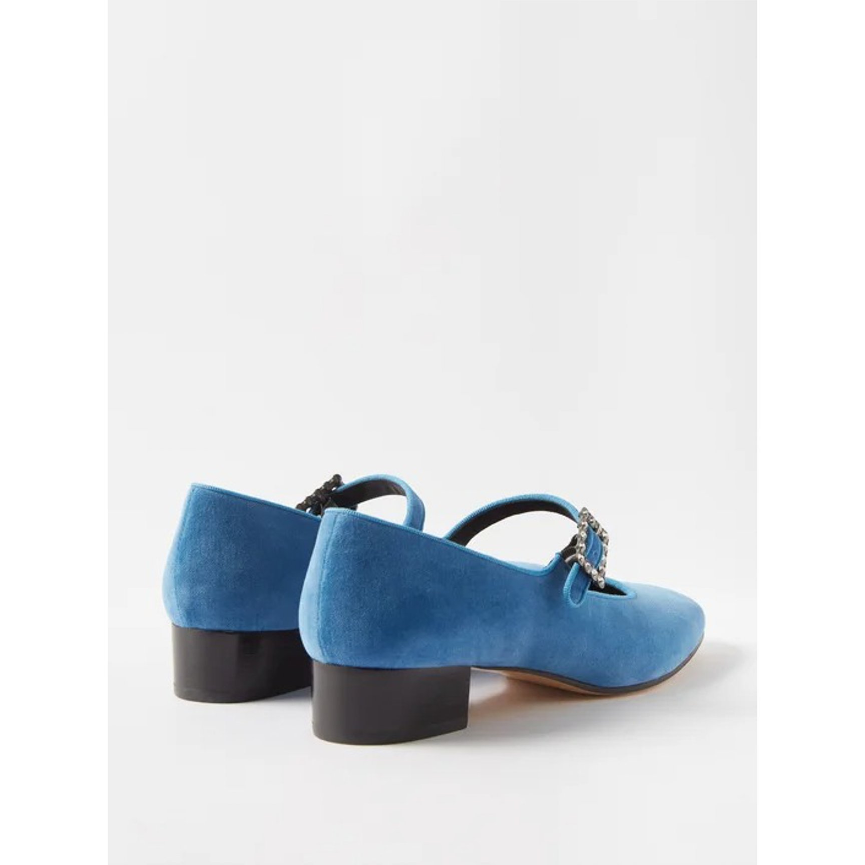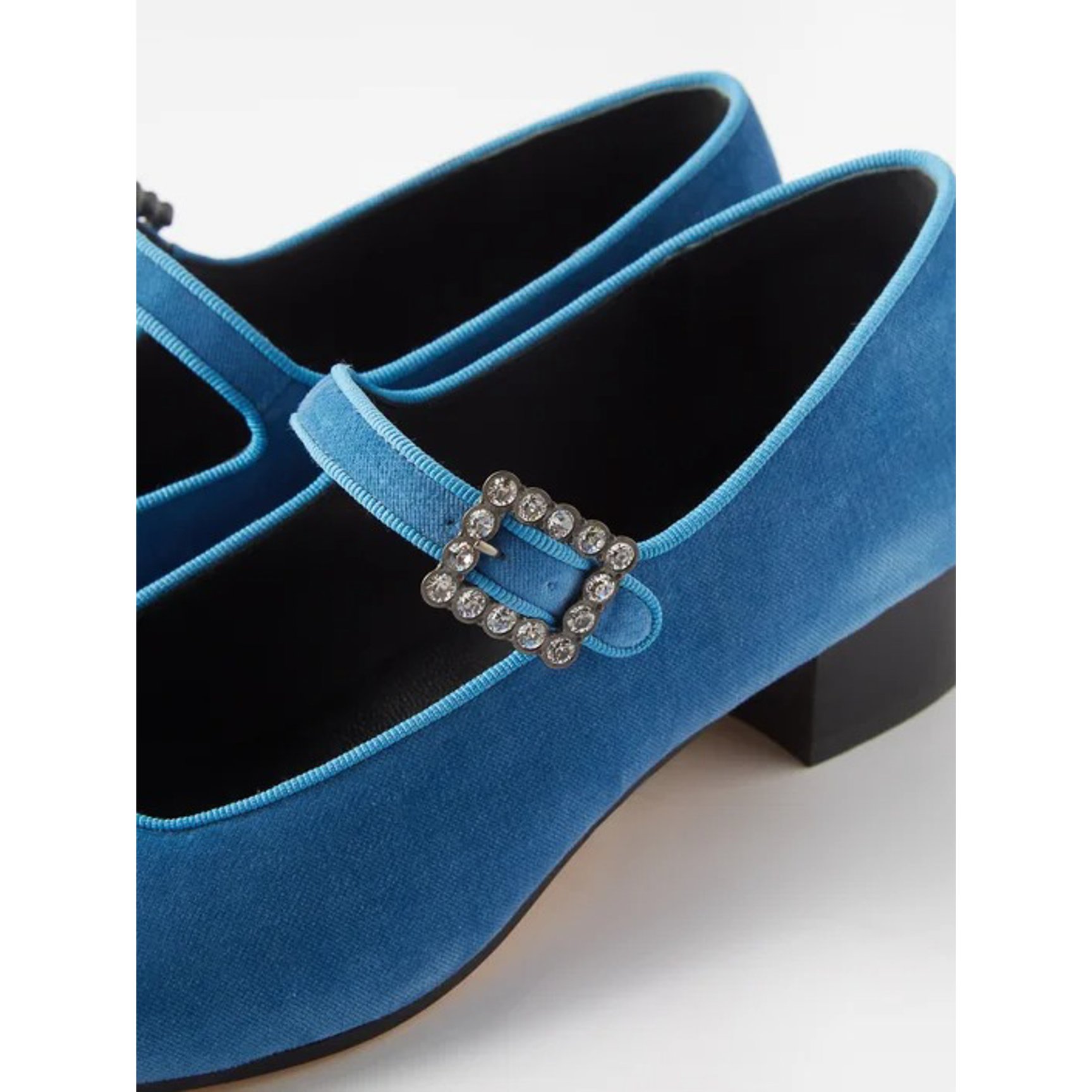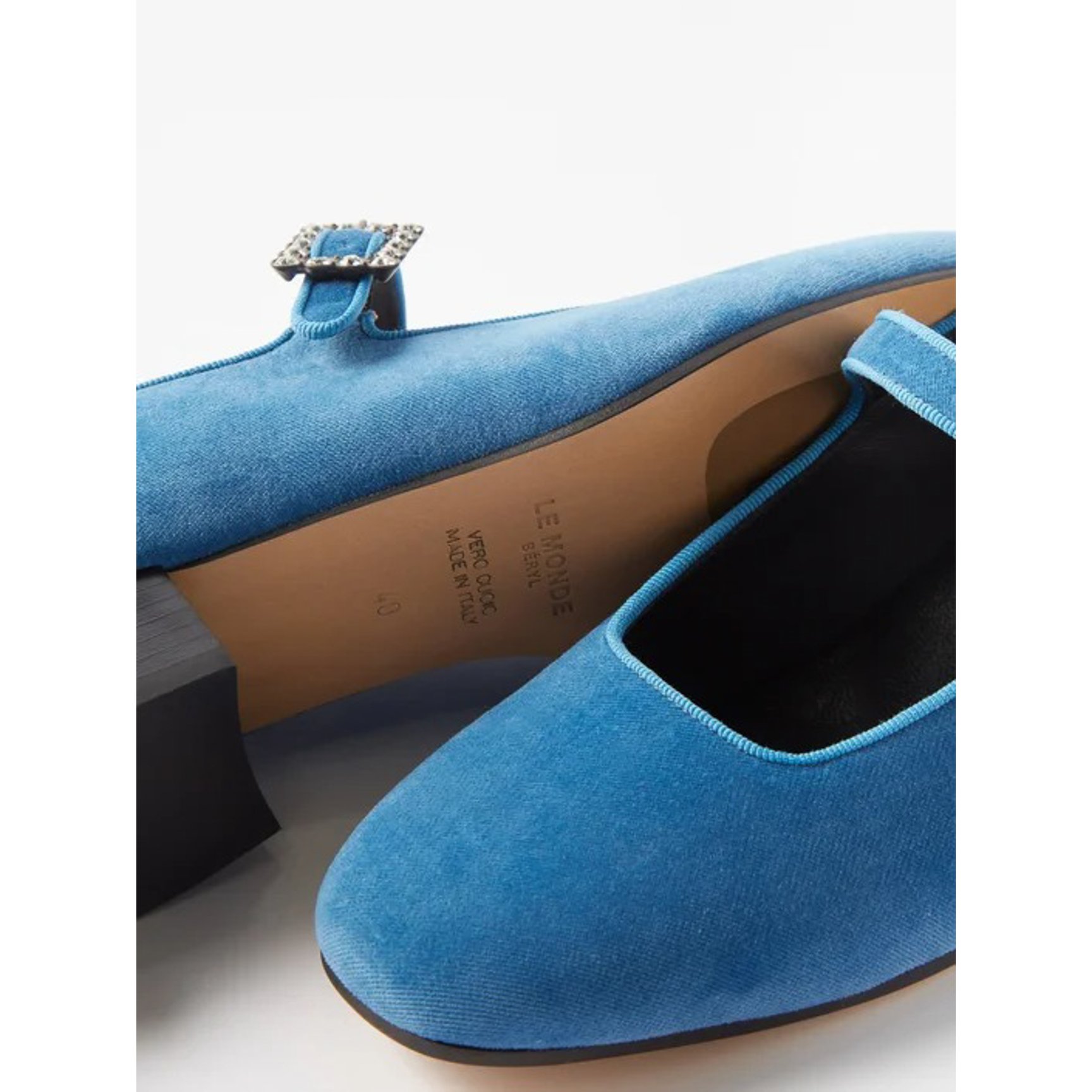 「ル・モンド・ベリル(LE MONDE BERYL)」のメリージェーンパンプスは、ブルーのベルベットを採用した上質感のある佇まい。きらりと輝くクリスタルバックルが足元を照らします。程よい高さのヒールがより女性らしい雰囲気へ導いてくれます。