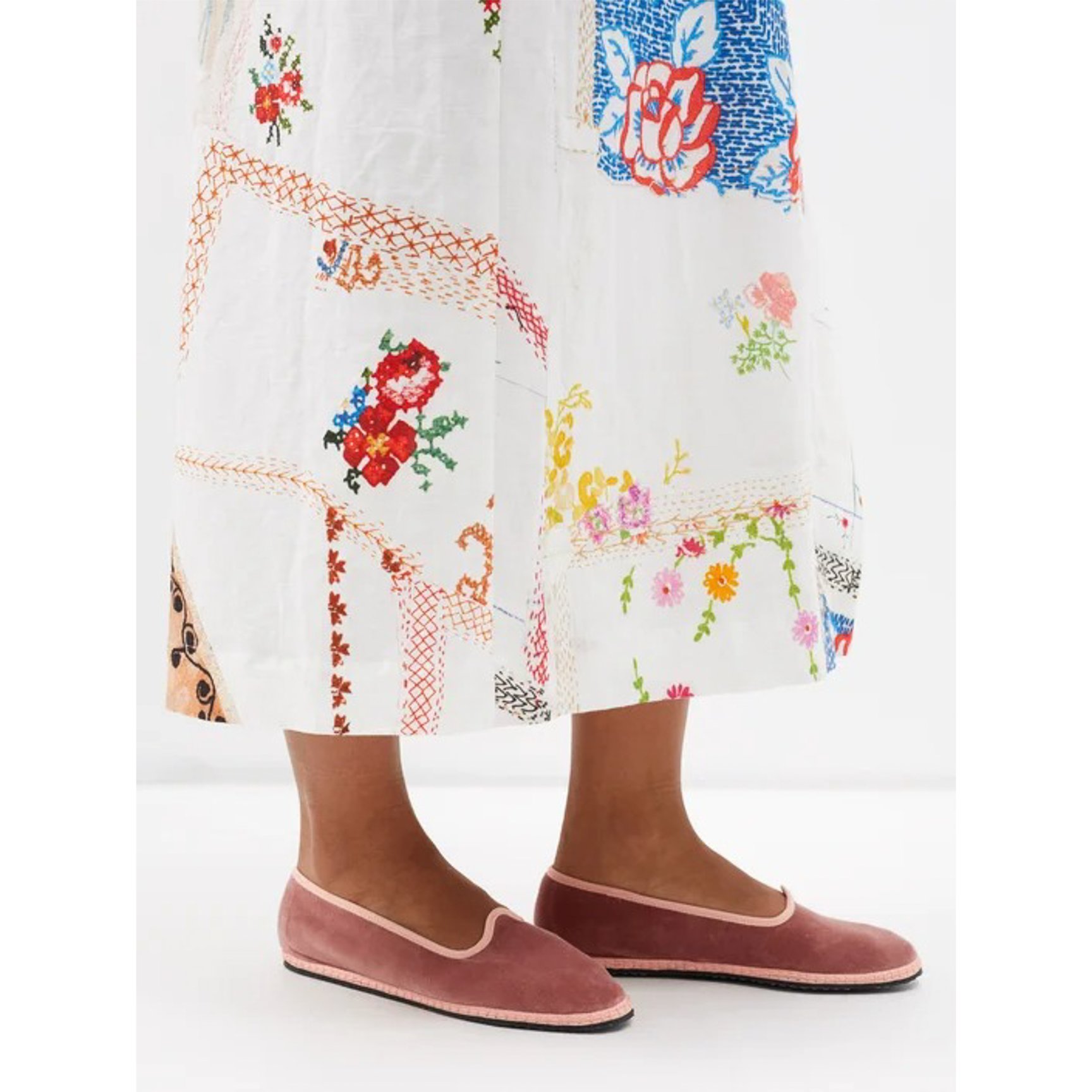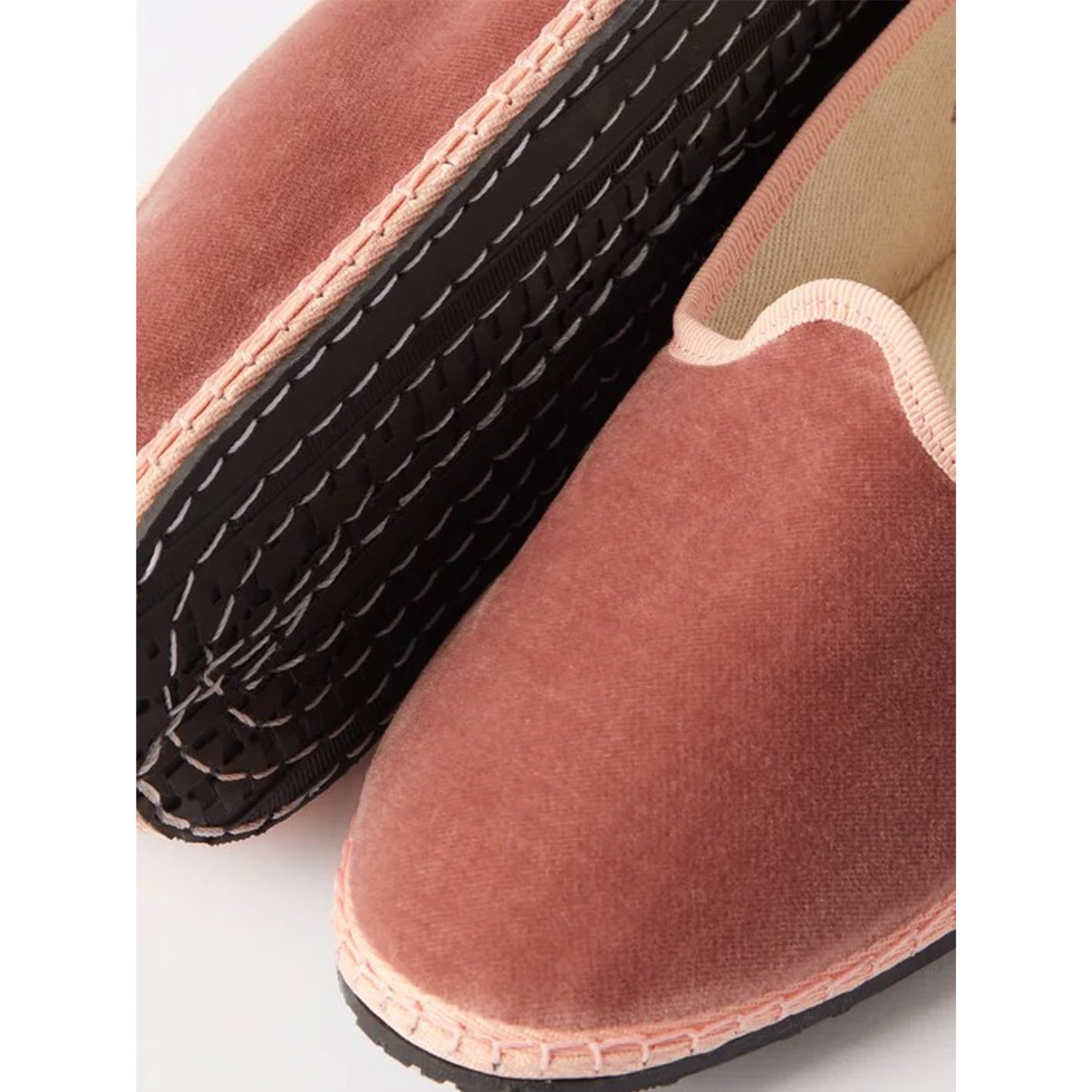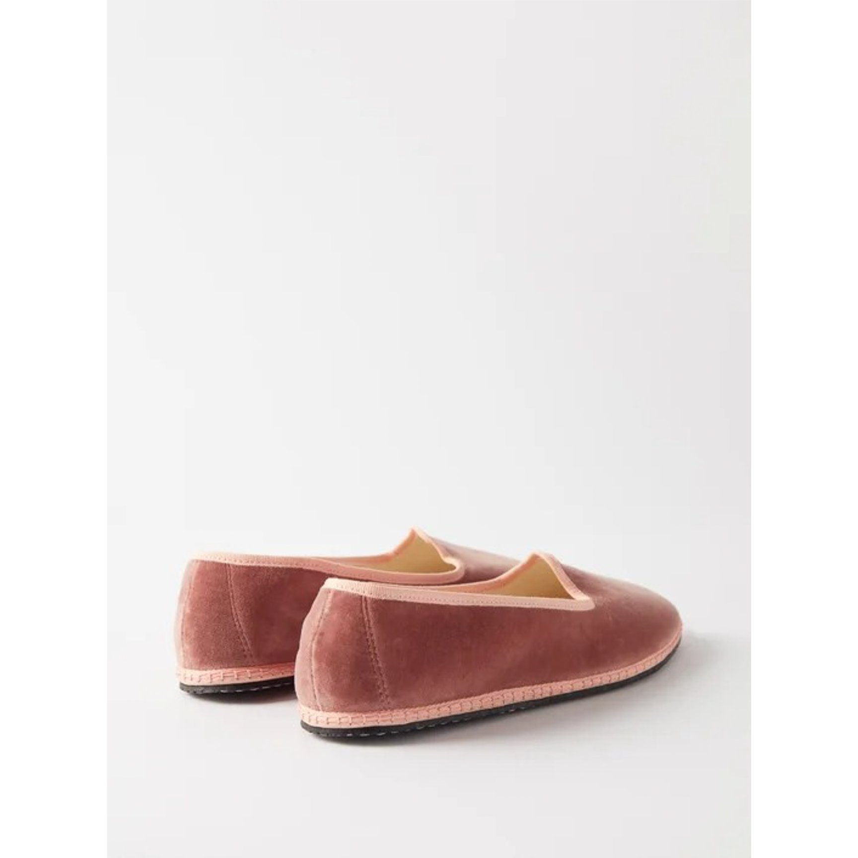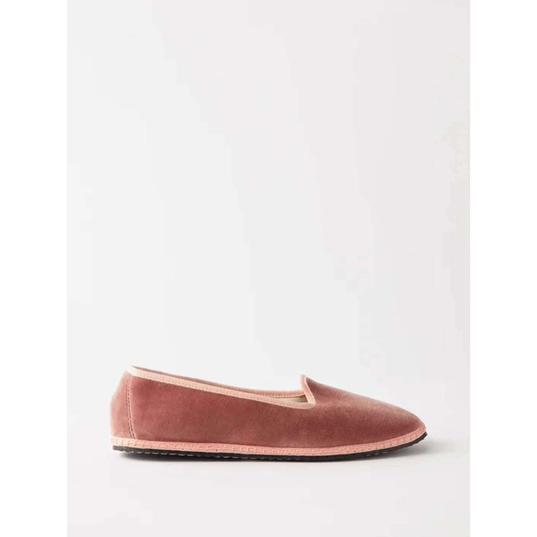 「ヴィビ・ヴェネツィア(Vibi Venezia)」の愛らしいダスティピンクのベルベットバックレスシューズ。デニムなどのカジュアルなパンツスタイルに合わせて、足元の可愛さを引き立てるのもおすすめ。