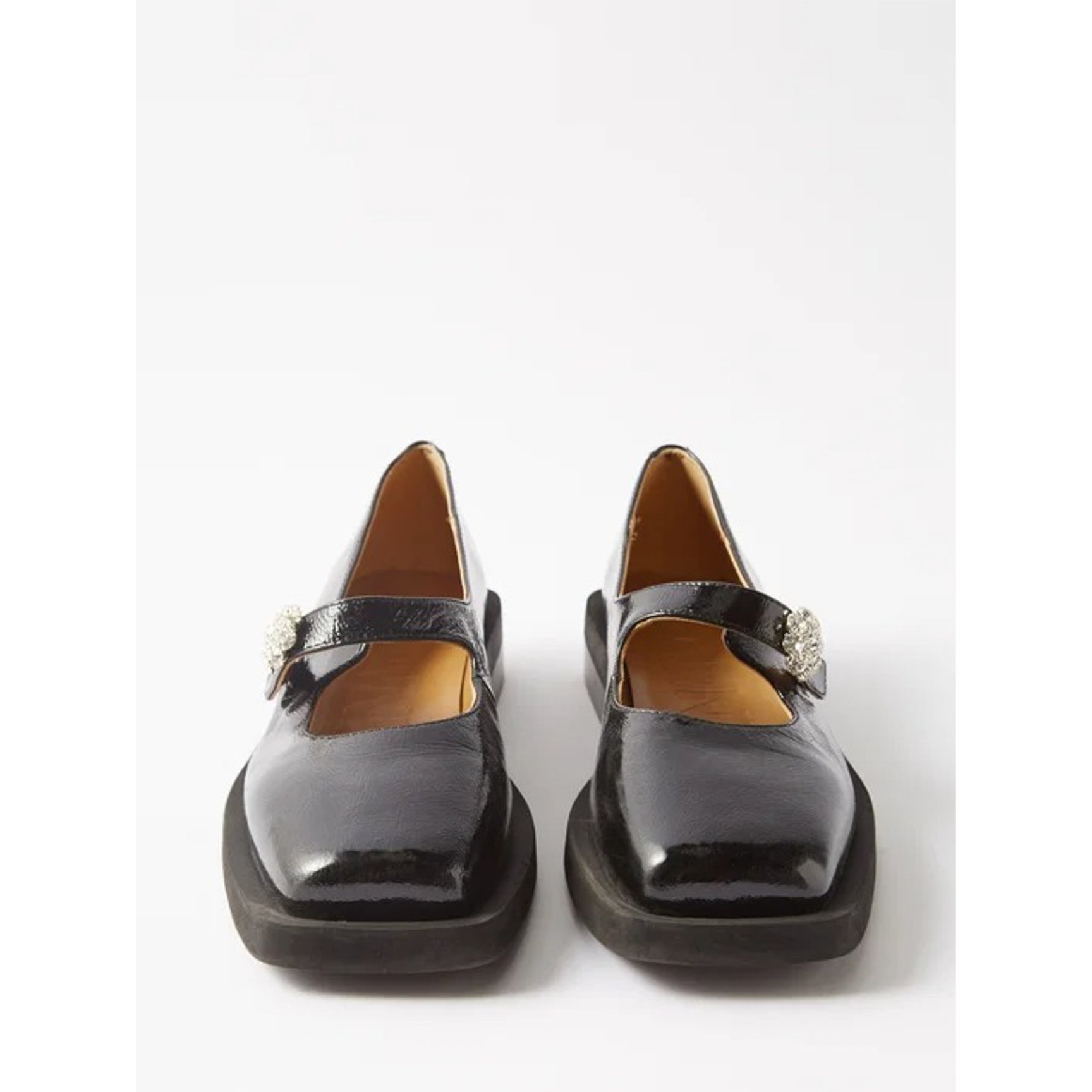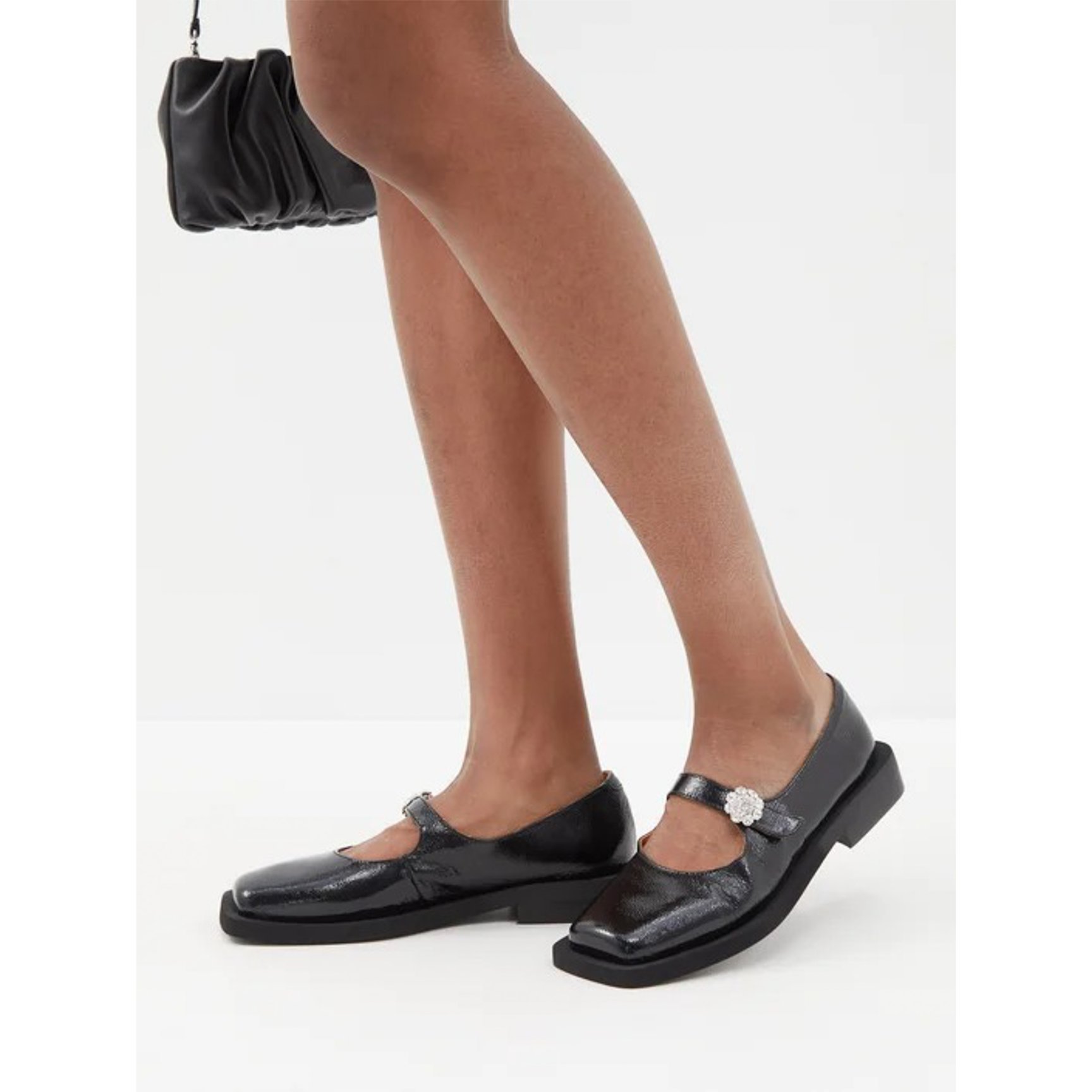 「ガニー(GANNI)」のメリージェーンローファーは、オーバーサイズのスクエアトゥと、ストラップに施されたフラワーディテールのクリスタルボタンが特徴。光沢感のあるパテントレザーが足元を華やかに彩ります。