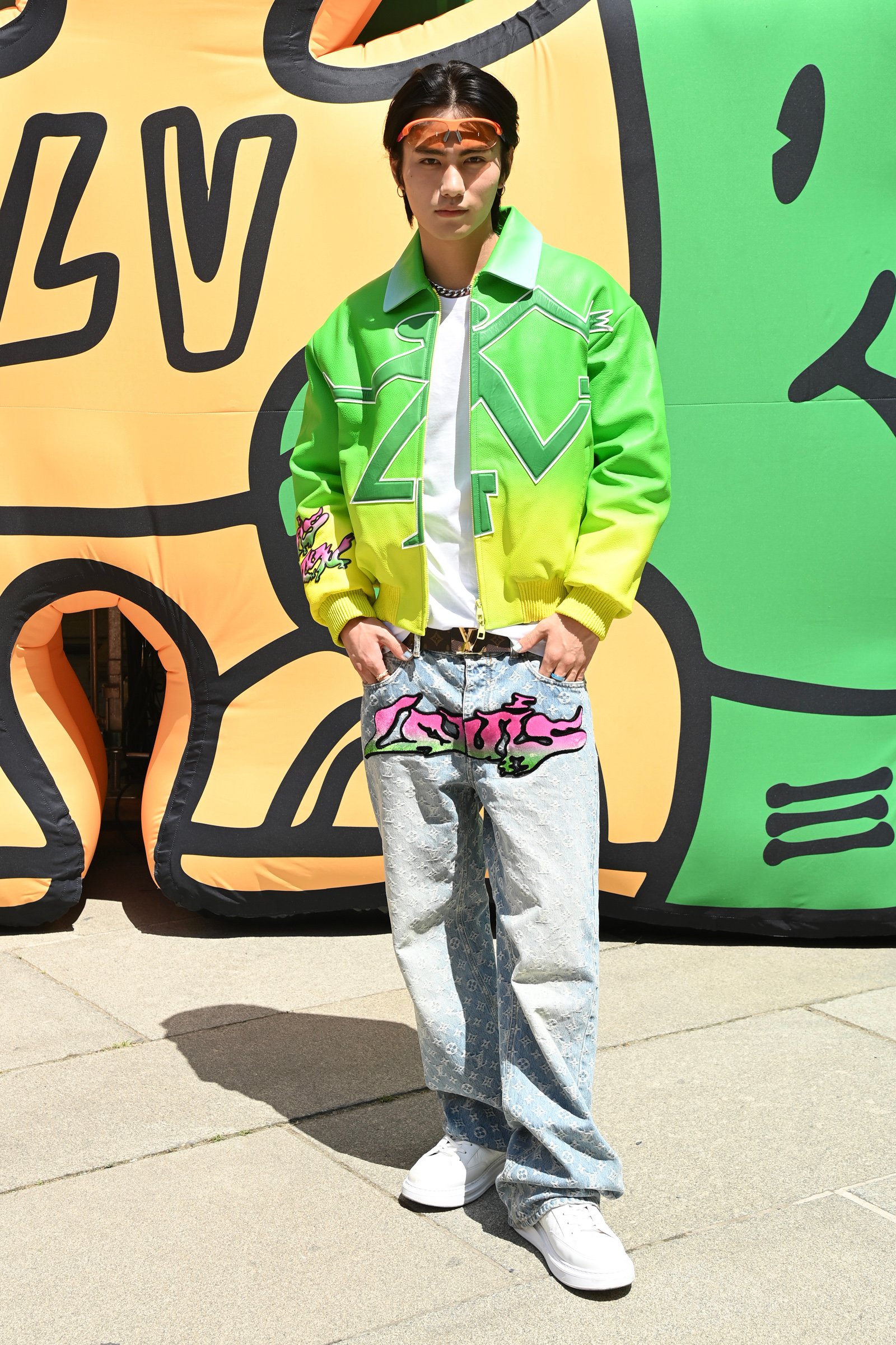 スーツやシャツ、パンツの裾をハサミで切ったようなジグザグやモノグラムキャンバスのエプロン、時空を超えてきたかのように歪んだデザインのバイカージャケット、絞りで淡いタイダイに染め上げたモノグラム柄のシャツとパンツ、絵の具で重ね塗りしたような柄もルイ・ヴィトンのクラフツマンシップを以て具現化。メゾンの心臓部である「イマジネーション」が生まれる原点として、誰しもが経験する子ども時代の胸の高鳴りやファンタジックな空想が詰め込まれている。