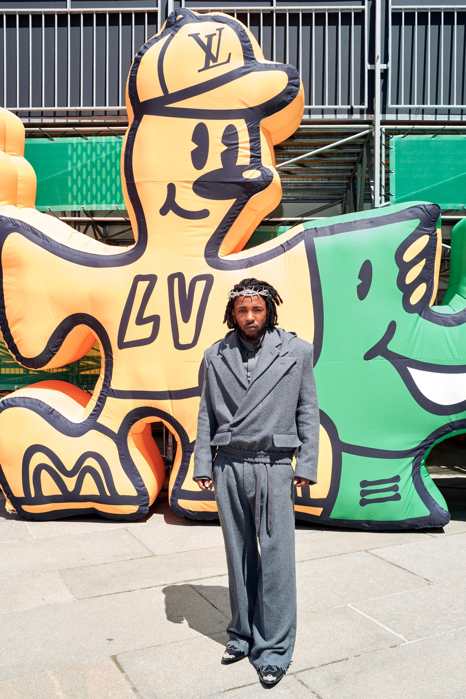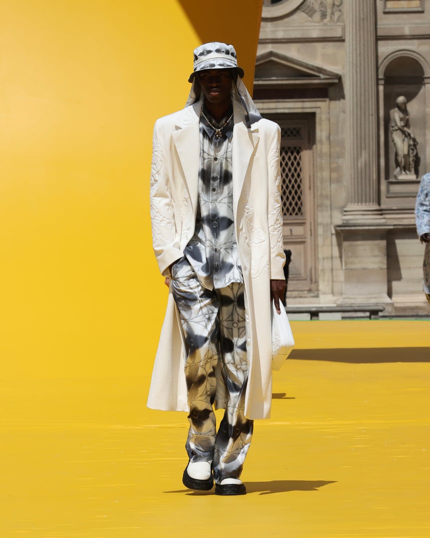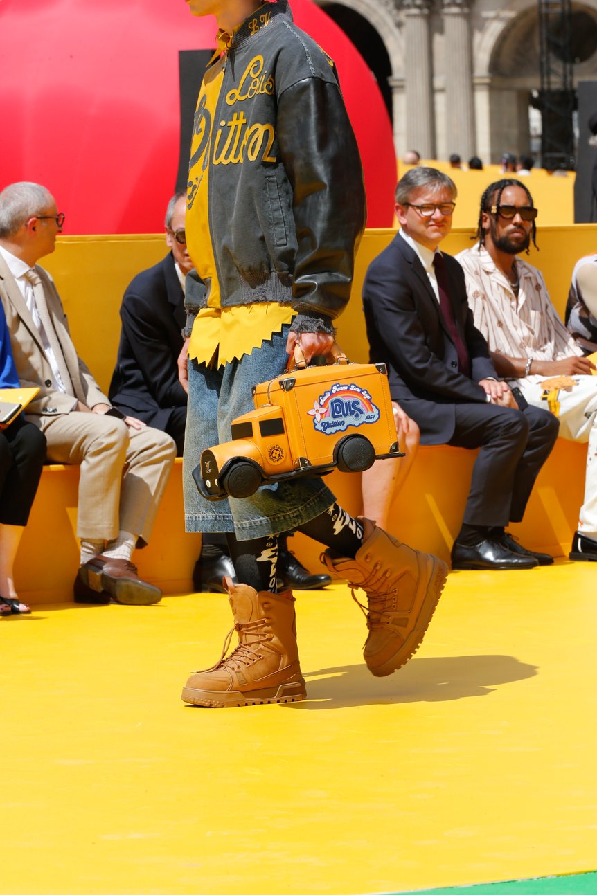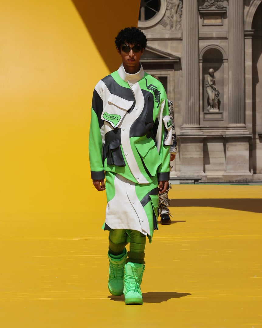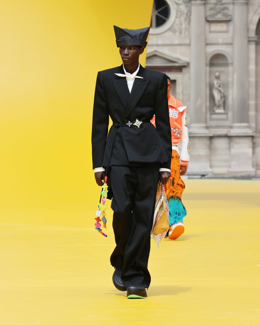 コレクションの会場となったルーヴルの中庭 クール・カレには、拡大されたプレイグラウンドが出現。イエローのレーンのようなセットがランウェイと化し、軽快なリズムを刻むマーチングバンドの演奏とパフォーマンスでショーの幕が開いた。ショー中は観客に混ざってフロントローに座ったケンドリック・ラマー(Kendrick Lamar)が、昨年急逝した故ヴァージル・アブロー(Virgil Abloh)に呼びかけるように「How many miles away VIRGIRL」「Long Live VIRGIRL」などのフレーズを織り交ぜながらラップを披露する中、モデルがウォーキング。