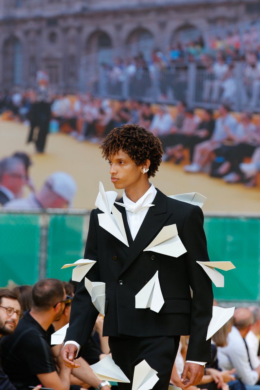 コレクションはヴァージルがこれまで継続して取り組み、最後に手掛けたコレクションとなった2022年秋冬シーズンにも共通する、子どもの視点や感性から描いた世界がベースに。折り紙で折ったハットや飛行機、カートゥーンのプリントやビーズの飾り、ハサミやペンチといったツールボックスの工具、トラックのおもちゃなど"子どもの遊び"を彷彿とさせるモチーフが随所に取り入れられた。