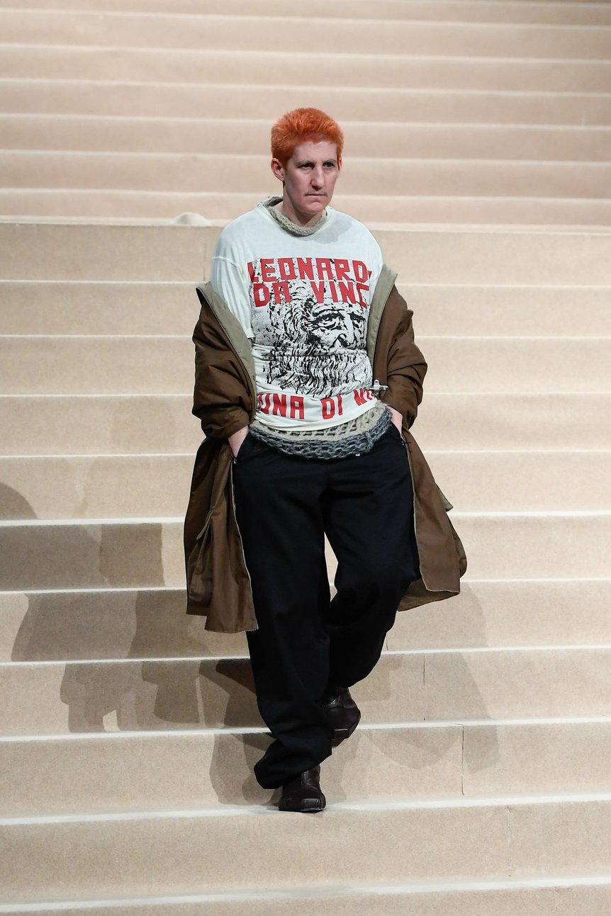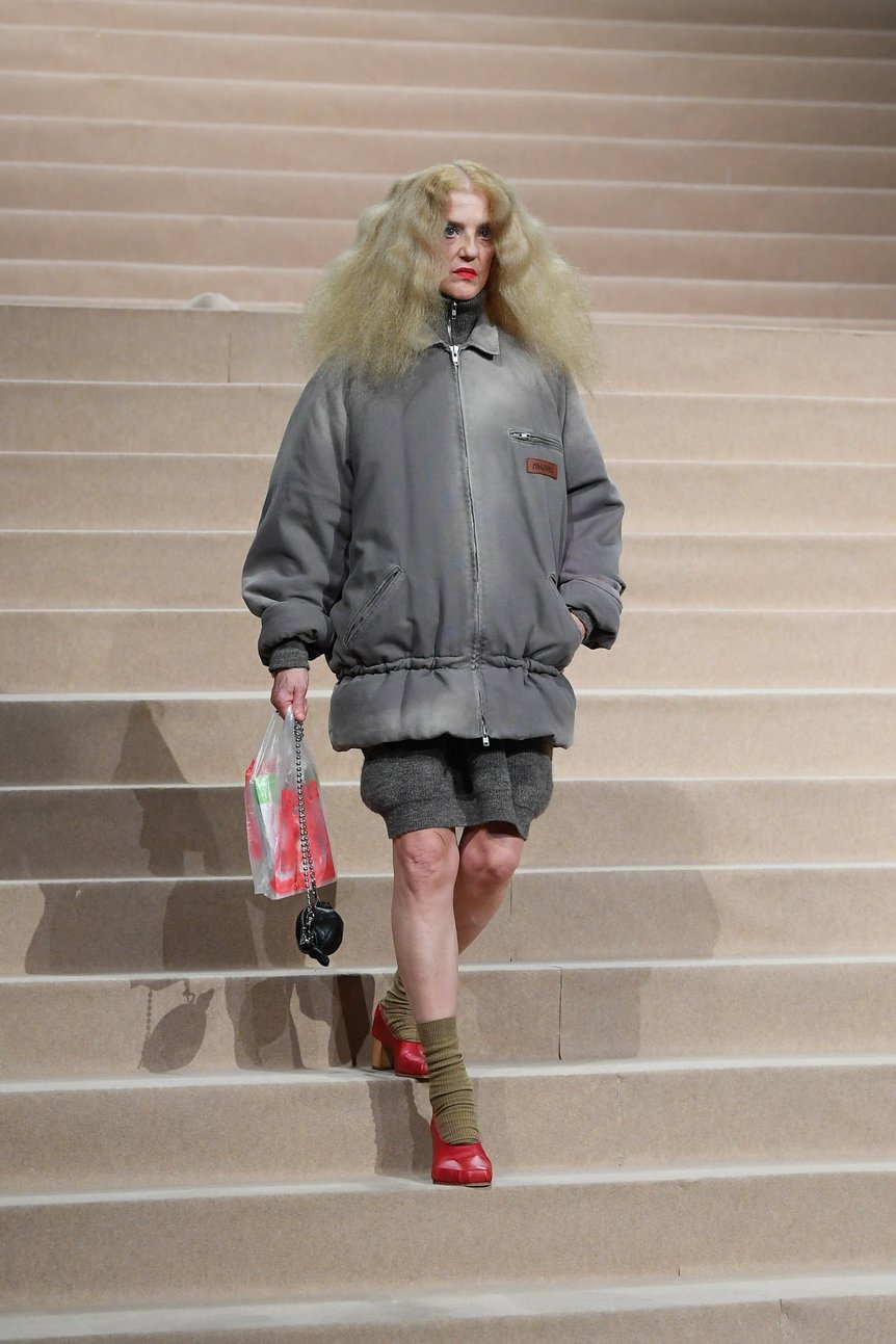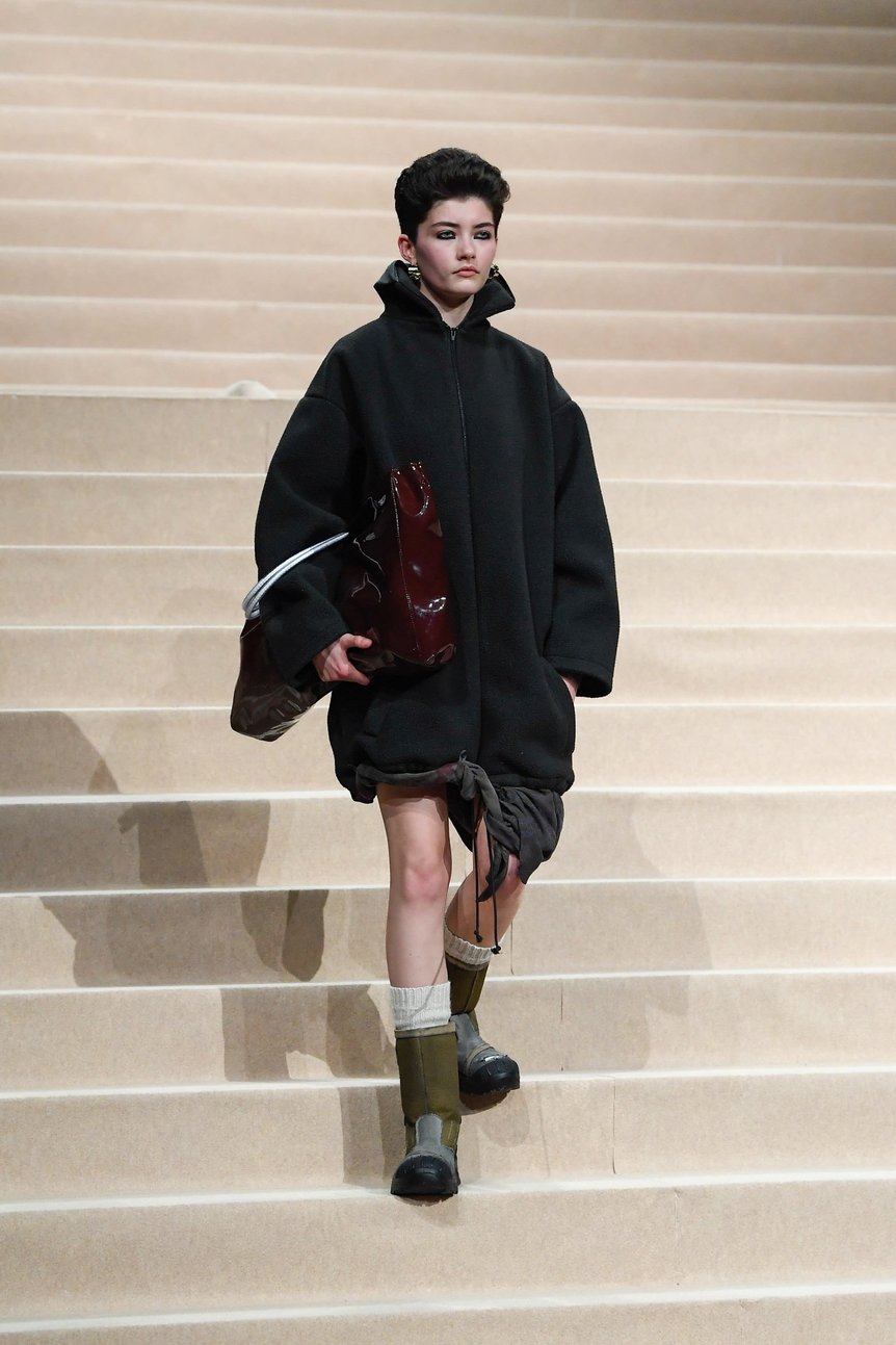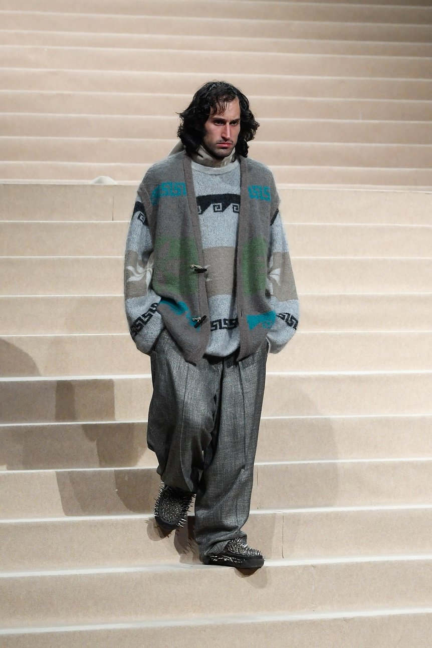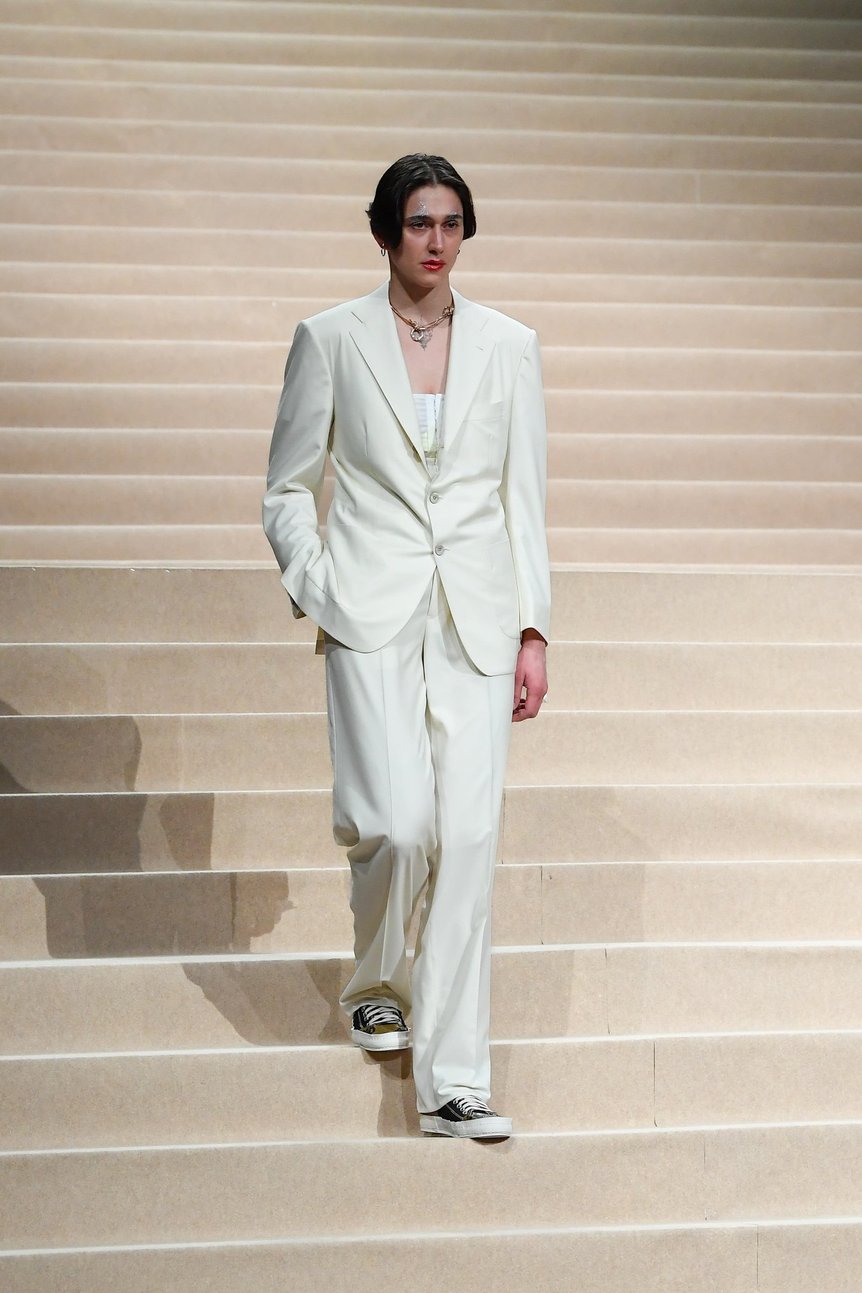 取材に対し、ルカ・マリアーノは「ボディエクスチェンジ」というキーワードを挙げ、クラシックという概念を独自の方法で探求したという2024年秋冬コレクションは、コンテンポラリーな身体とクラシックな服のユニゾンを目指した。世界最高峰のスーツブランド「キートン(Kiton)」とコラボレーション製作したスーツを、おじさん風の野暮ったさを残したパンツに象徴されるマリアーノの得意の解釈で編集し、着崩すことで「ださい」と「イケてる」を紙一重で綱渡りする。「相反する概念の一体化」という彼の言葉は、男性と女性、クラシックとモダン、ラグジュアリーとヴァルガ(下品)といった対象にまで及び、レズビアン詩人のパトリツィア・カヴァッリ(Patrizia Cavalli)が着用していたセーターから着想を得たり、ビニール袋と色褪せたブルゾンの組み合わせた浮浪者のようなスタイル、体のラインを美しくみせるようウエストを絞ったジャケットと裾がたっぷりと余ったスラックスなど、対の概念の中間をとるわけでもないスタイリングの妙によりテイストをジャン=ジャック・ルソーの「一般意志」のような上位概念として昇華させている。言葉の一新には、名前のないこのテイストも含まれるのだろう。