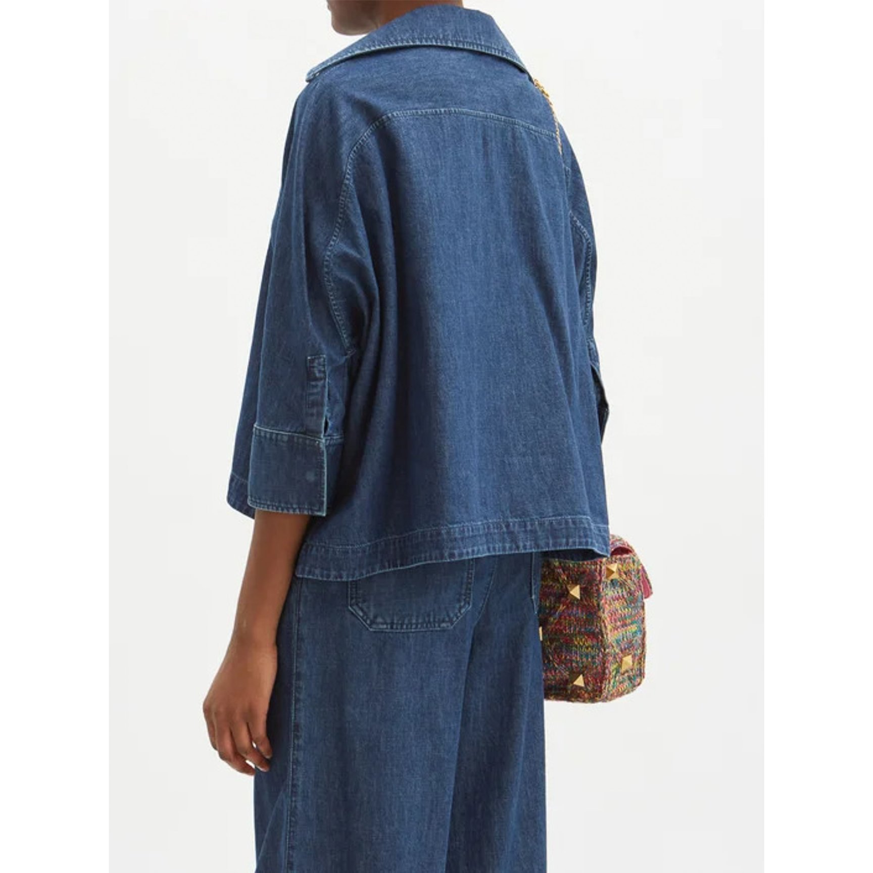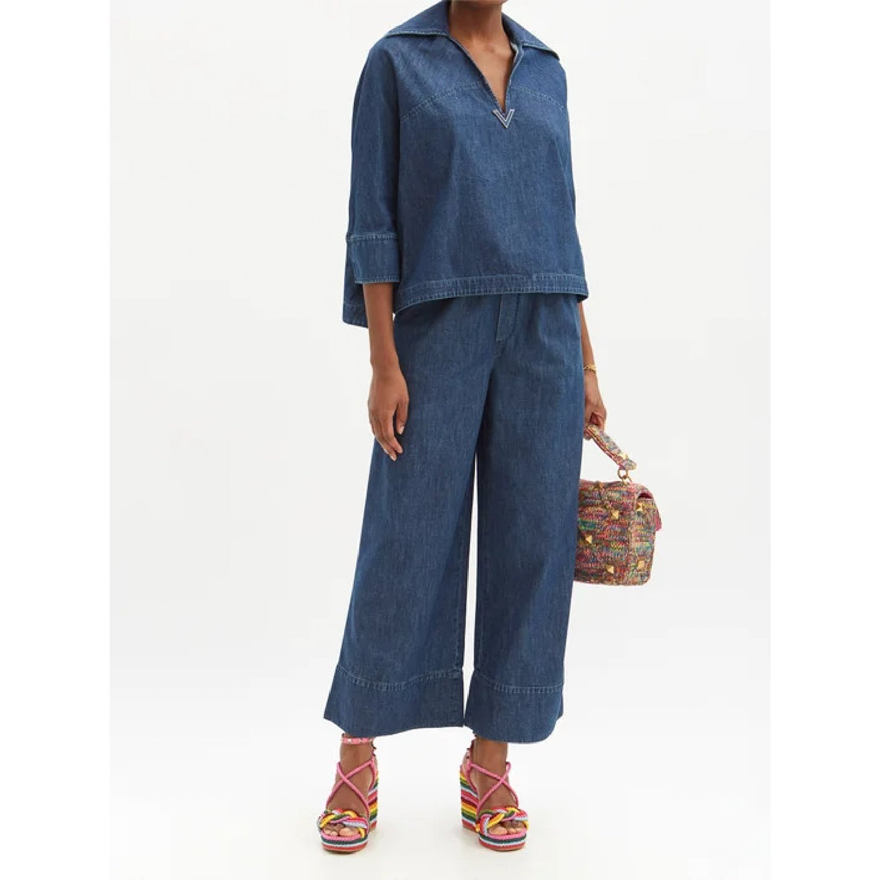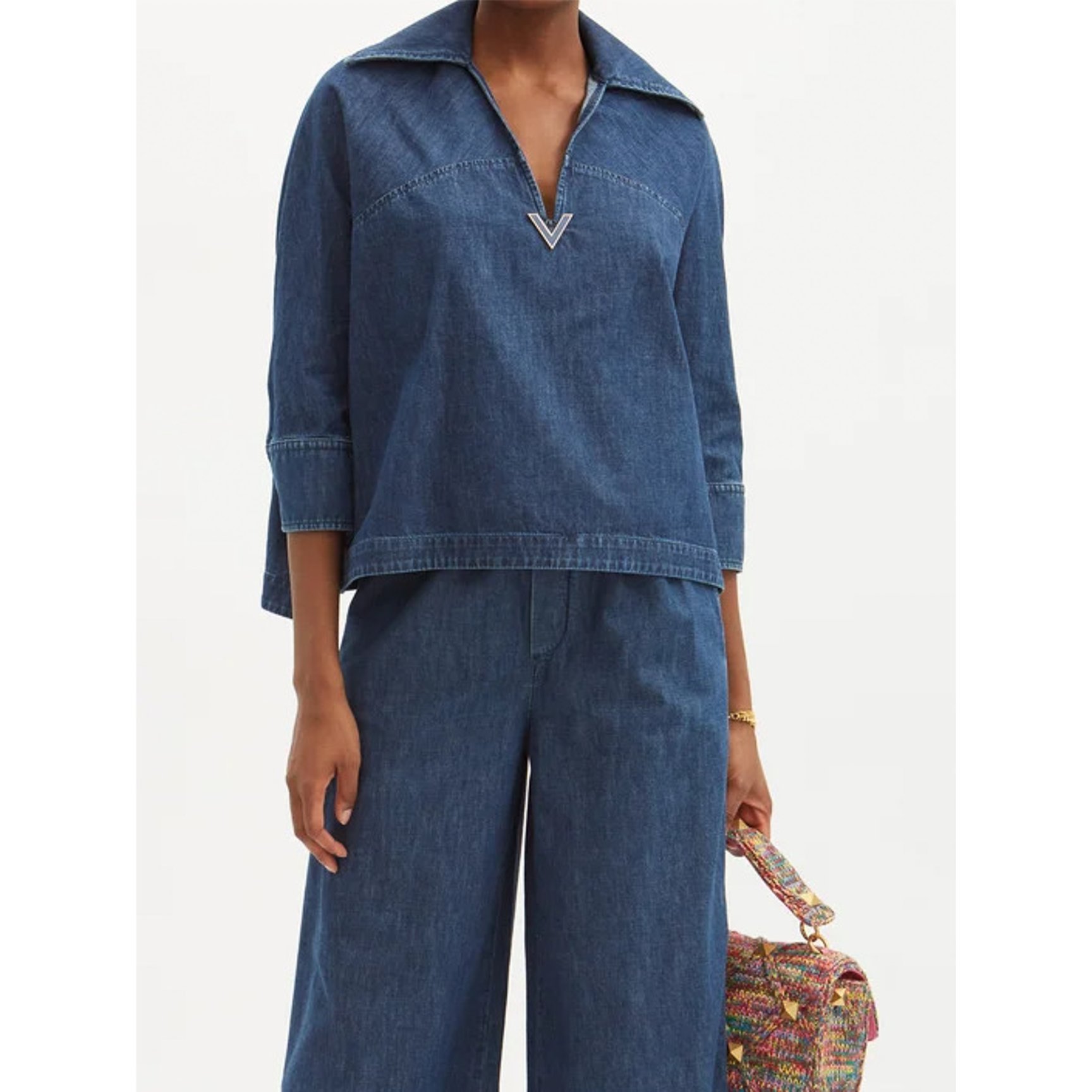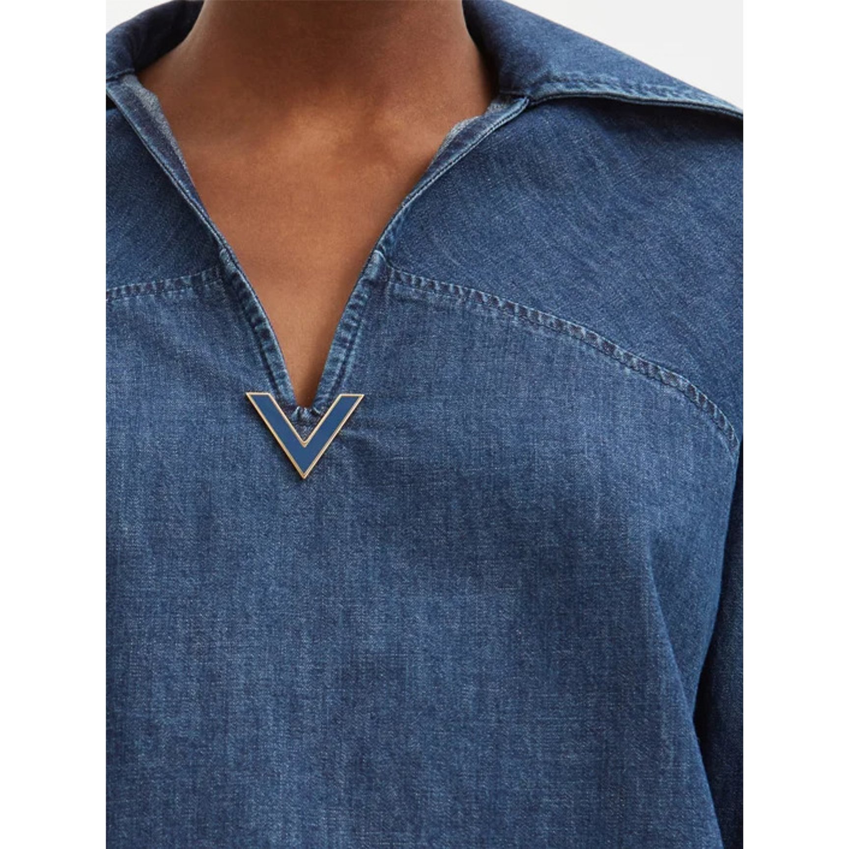 デニムのカジュアルな印象を覆すような、エレガントな佇まいのブラウス。胸元には、1960年代に考案された「ヴァレンティノ(VALENTINO)」のシグネチャーロゴも。ブルーのエナメルでモダンにアップデートした「V」プレートが、さり気ないアクセントを添えています。