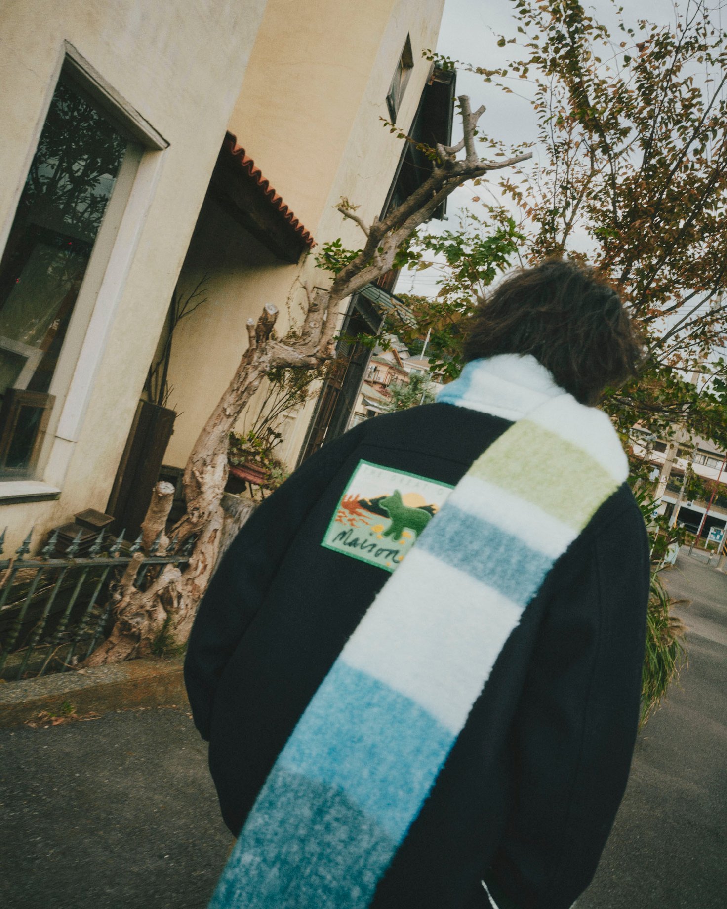 久々の休日。つい慣れで早く目が覚めてしまったし、気になっていたカフェにでも散歩しようかな。そんな朝には、冬の日を一緒に歩くために取っておいたふわふわのマフラーを取り出してみよう。お気に入りのブラックジャケットの背中に潜むキツネちゃんと色を合わせたブルーのマフラーに、くたっとしたフォルムが愛らしいオレンジのハンドバッグを合わせたら、カラフルな冬のはじまりだ。
