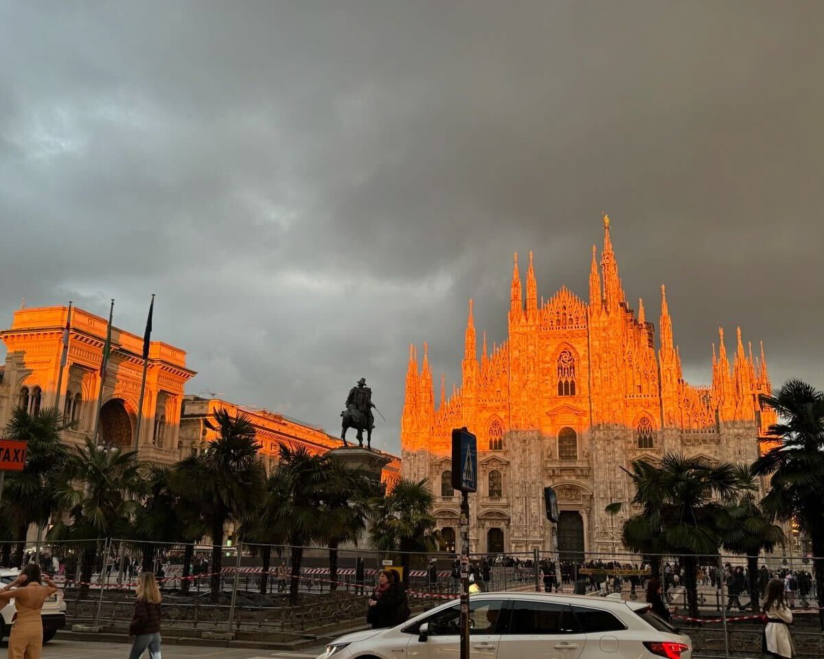 そして旅の最後、︎︎︎日が落ちてくる“最高の時間”に訪れたかったのがミラノの王道観光スポット「ドゥオーモ大聖堂広場」。約500年をかけて建設された世界最大級のゴシック建築は圧巻です。滝沢さんも荘厳な雰囲気に触れ、尖塔や彫刻の繊細な装飾に心を奪われたそう。