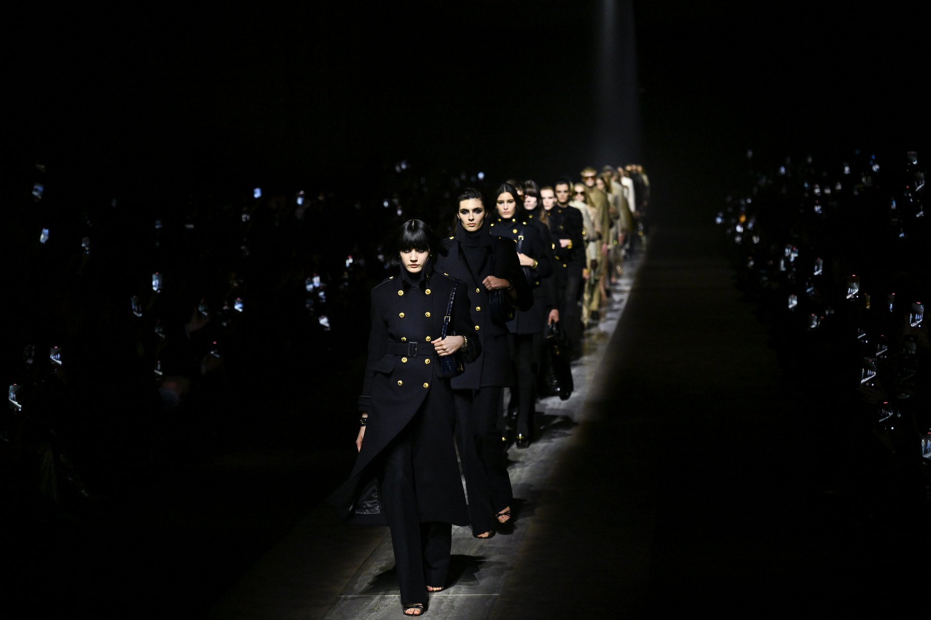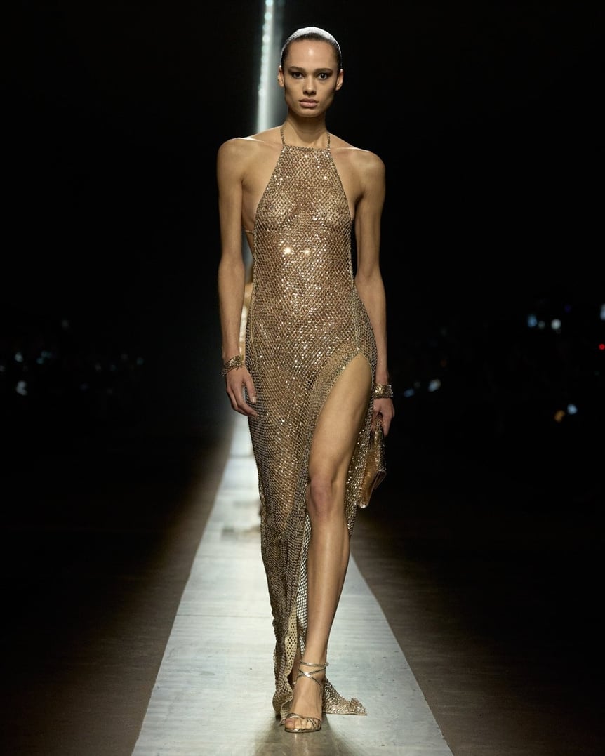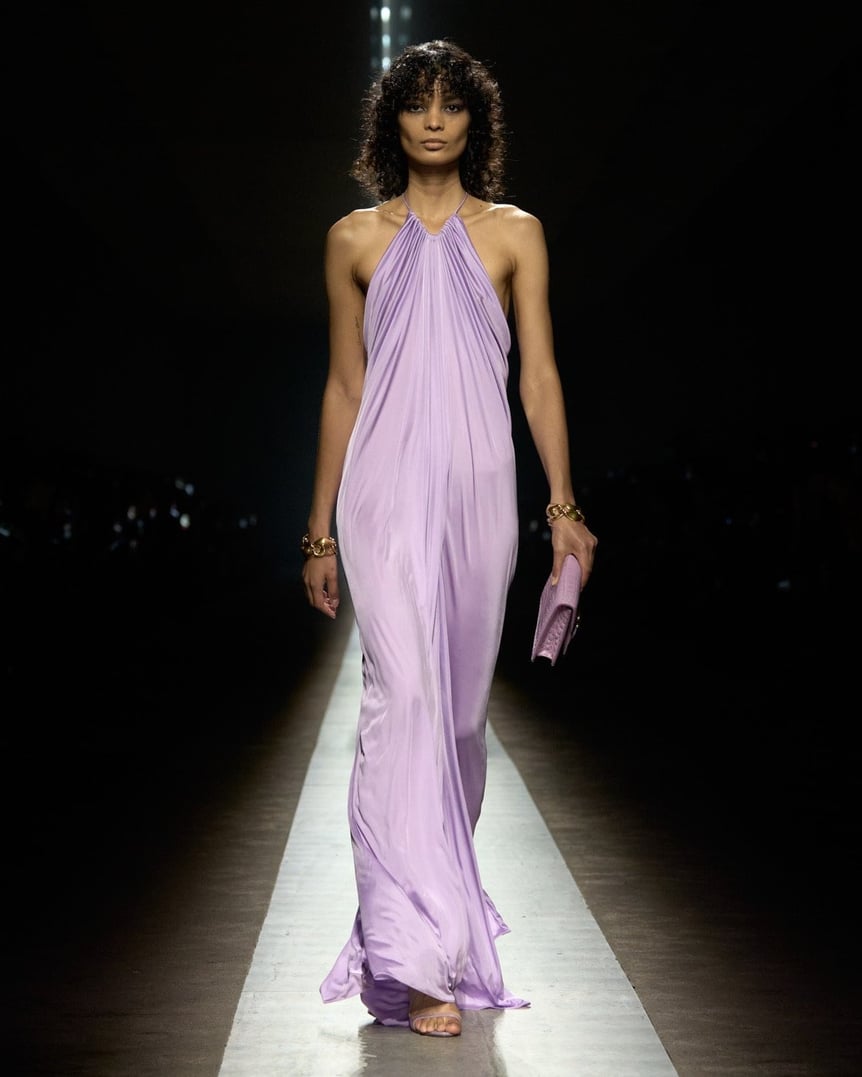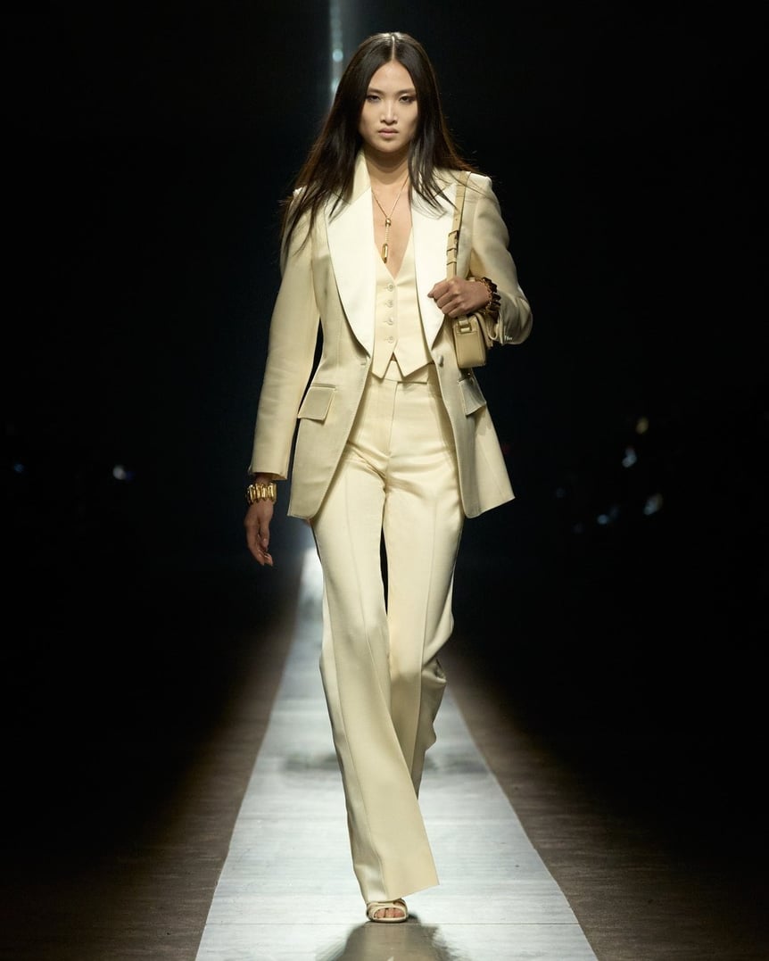 今回のランウェイでは、ブランドの創業者でデザイナーのトム・フォード(Tom Ford)の後を継ぐピーター・ホーキングス(Peter Hawkings)による2度目のコレクションがお披露目されました。フランスの歌手フランソワーズ・アルディ(Françoise Hardy)や、ドイツ出身の写真家ヘルムート・ニュートン(Helmut Newton)の写真集「ポーラウーマン」のポートレートなどからインスパイア。3ピーススーツやフリンジ、メッシュを効かせたドレス、マニッシュなブラックのコートといったアイテムが登場。力強い“トム・フォード ウーマン”、そしてウィメンズとリンクするメンズルックが目を引きました。