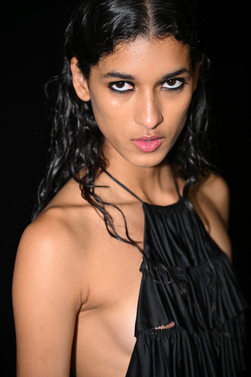 「ショーの前、数ヶ月にわたってピーターと何度も話し合い、写真を送りあったりしてイメージを共有していきました。前日の照明テストをした後は、ショーにおけるエナジーやダイナミズム、動きとメイクの調和についても話しました。ショーのメイクアップでは、目に宿る力がとても重要。だから、ひとつは艶やかなブラックに引き込まれるようなアイシャドウ、下まぶたまで縁取るようなディファイン(強調)をポイントにしました。そしてもうひとつ、スモーキーなアイのバリエーションも取り入れています。ただ、ブラックのアイメイクをしたのではなく、モデルがトム・フォードの服を着て、完璧にフィットする姿を見せてくれるように、私たちのアイデアをモデルにフィットできるよう、一人ひとりに合うメイクのバリエーションを割り当てていったんです」