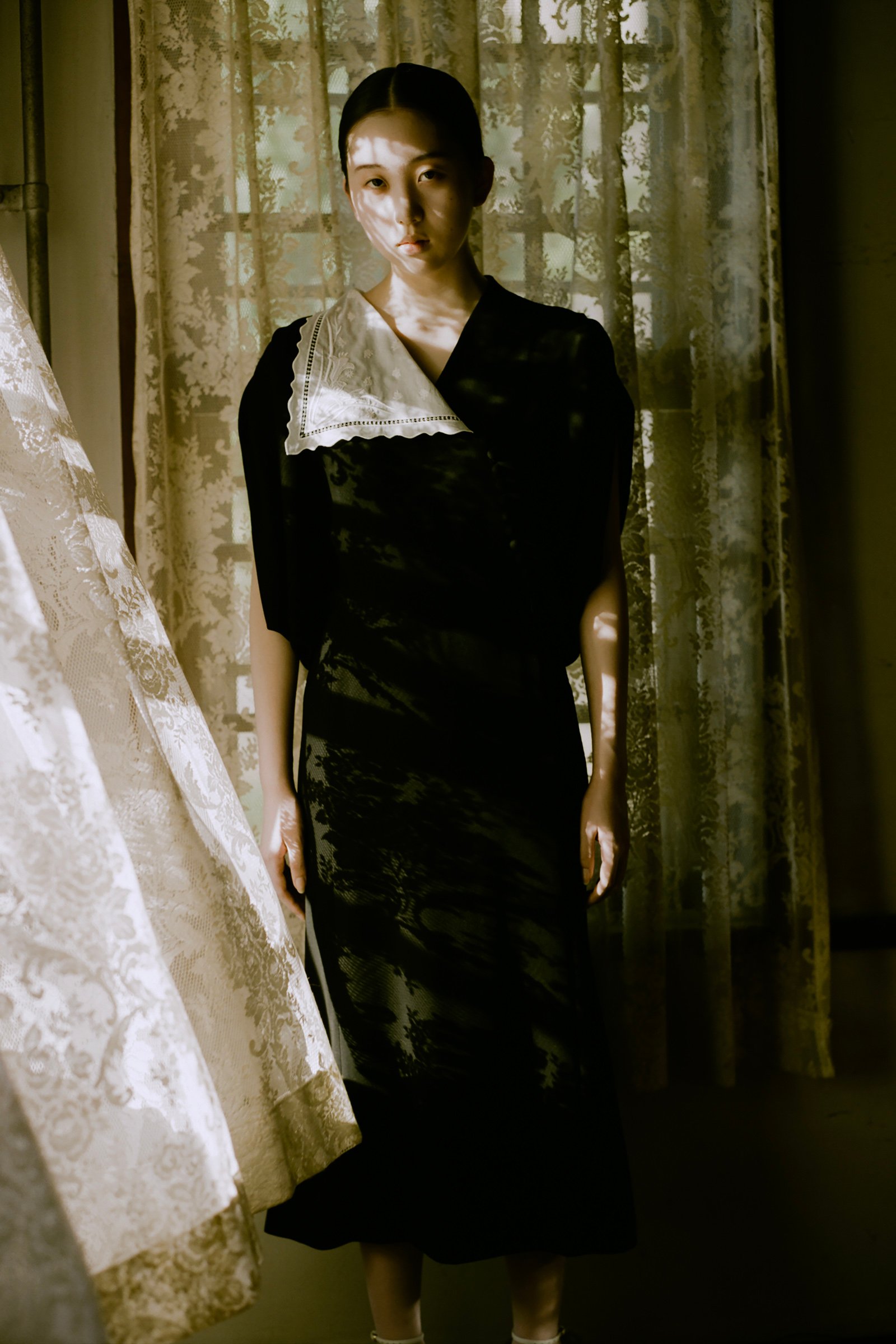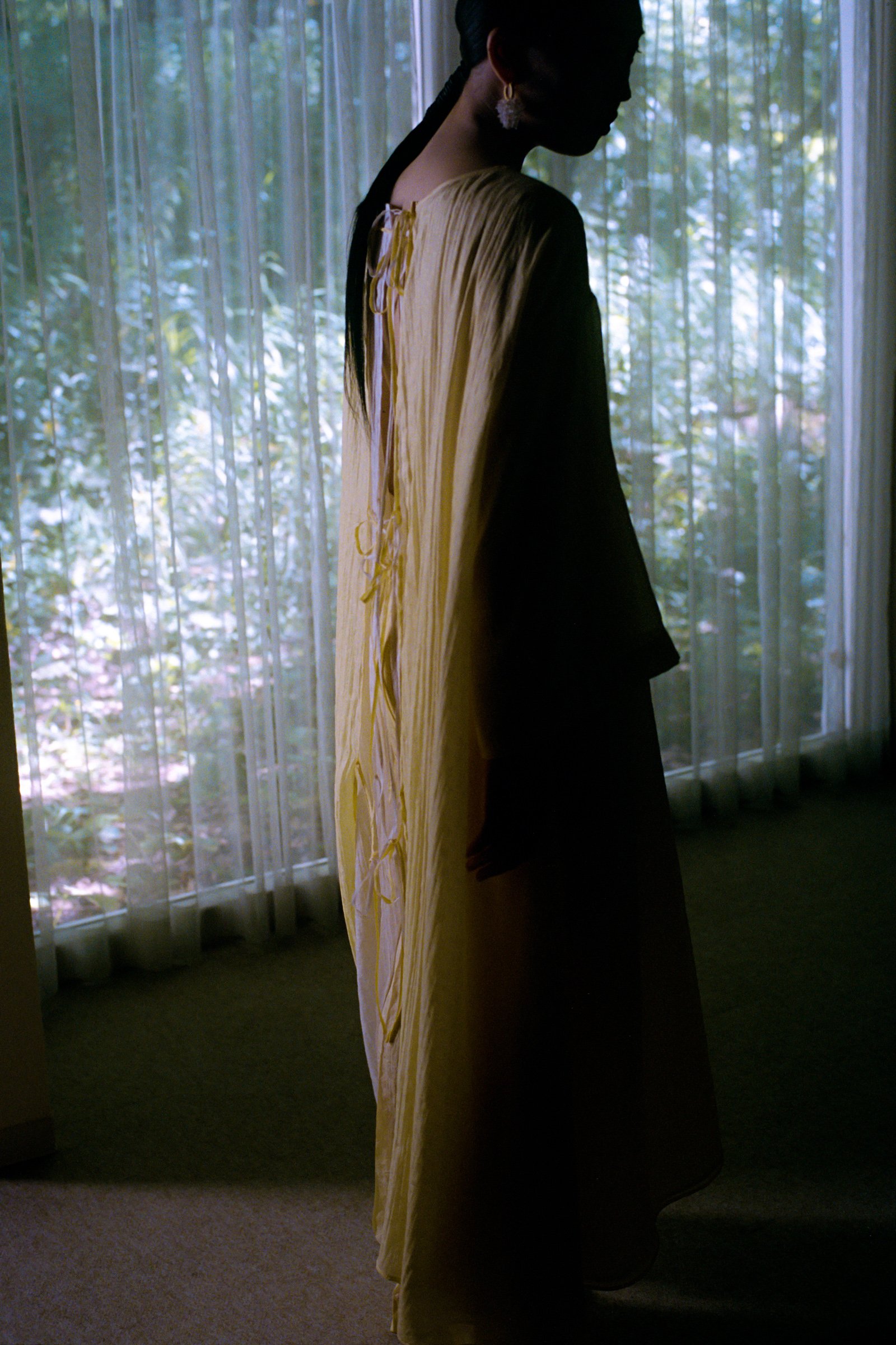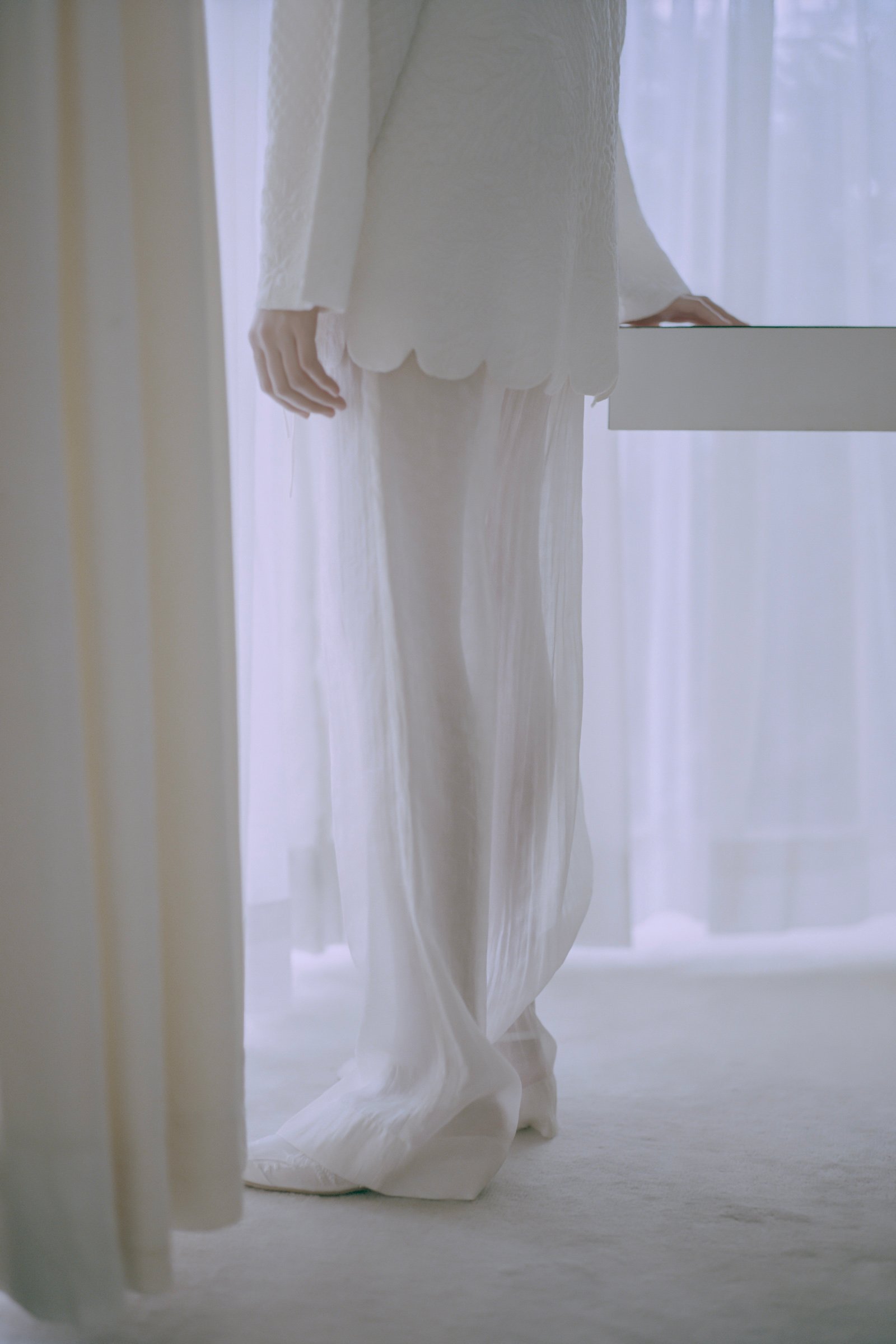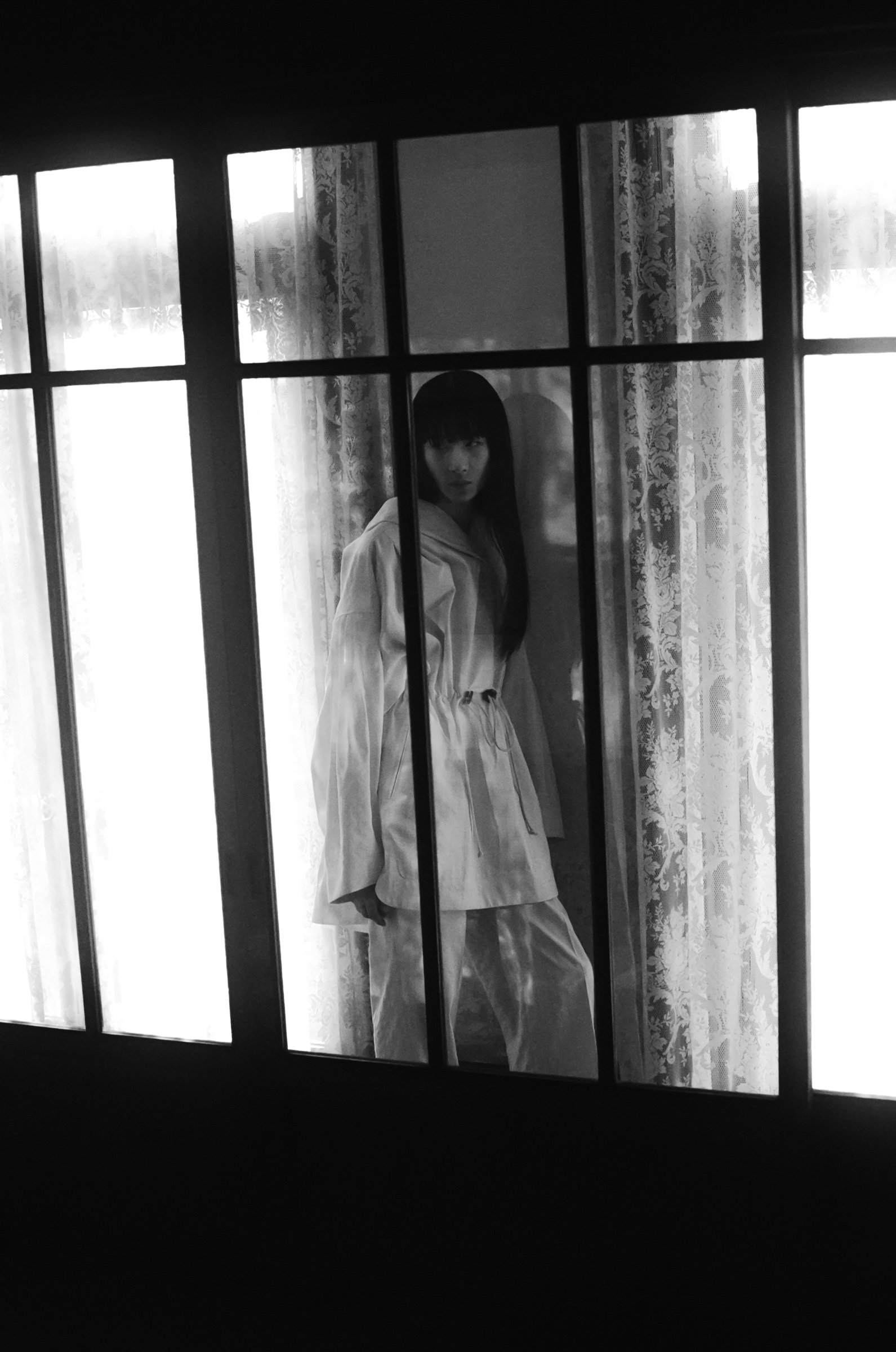 穏やかな時間が流れる中、毎日部屋の中から眺めていたのは、窓と窓から見える景色。窓と対話したり、買い物の帰り道に誰かの家の窓を眺めて想いを馳せたり。生活に根付くカーテンを窓に掛ける感覚でファブリックを選び、またカーテンをドレスのように身体に巻き付けるなど、子どもの頃に戻ったかのような純粋な気持ちでコレクション制作に臨むことができたという。