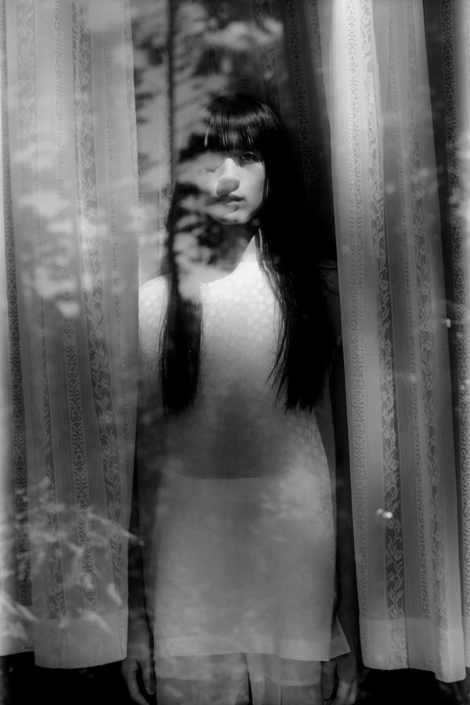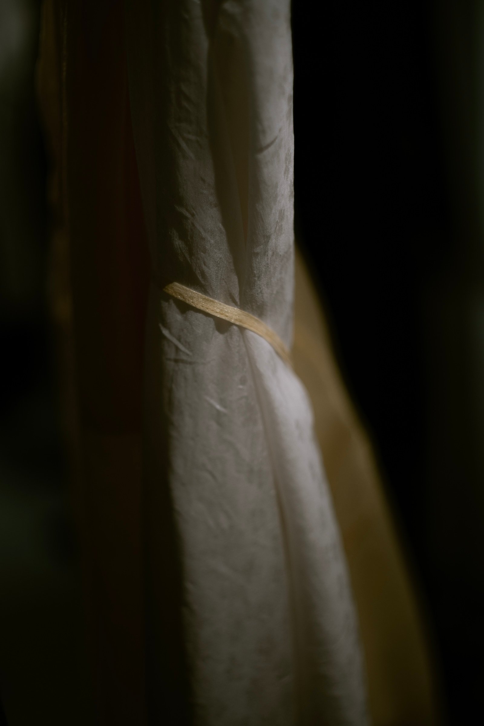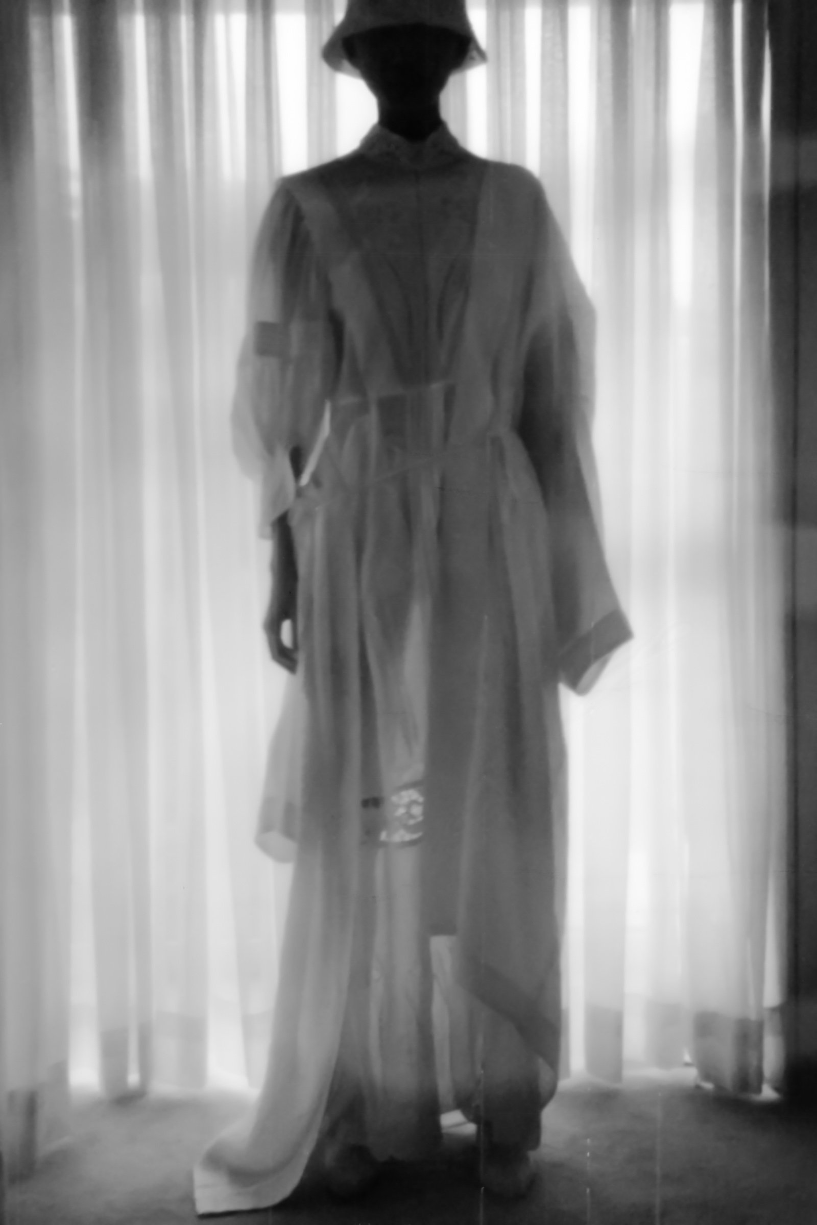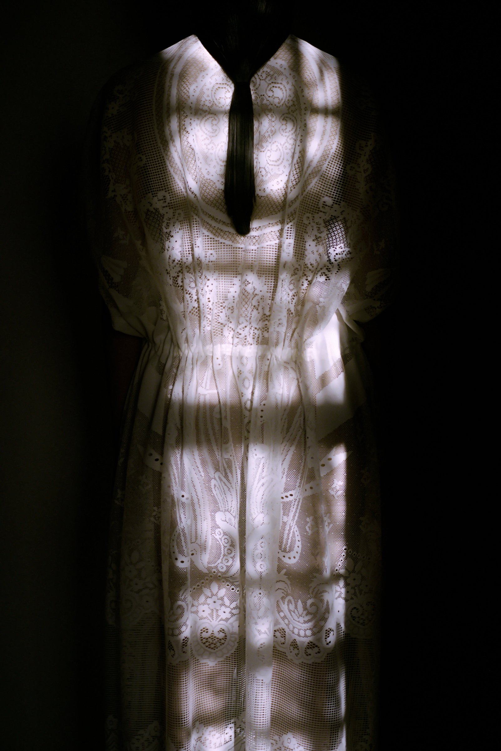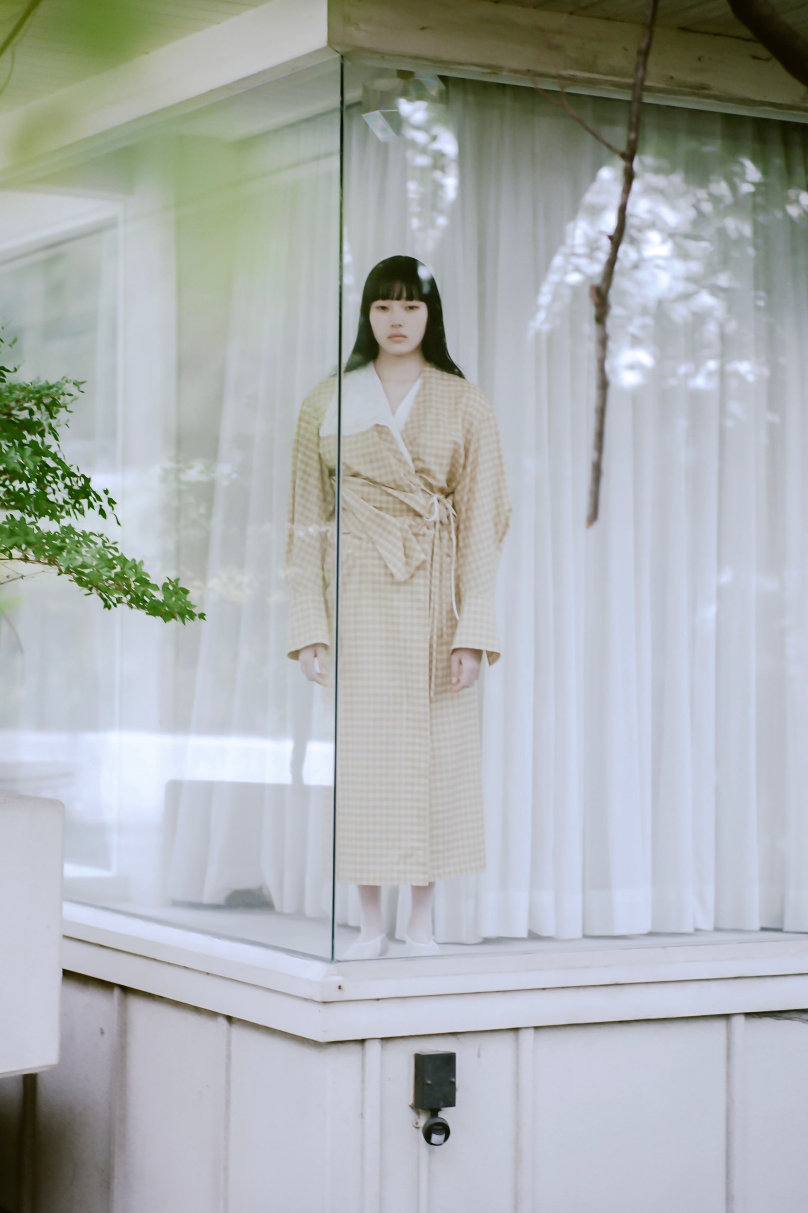 穏やかな時間が流れる中、毎日部屋の中から眺めていたのは、窓と窓から見える景色。窓と対話したり、買い物の帰り道に誰かの家の窓を眺めて想いを馳せたり。生活に根付くカーテンを窓に掛ける感覚でファブリックを選び、またカーテンをドレスのように身体に巻き付けるなど、子どもの頃に戻ったかのような純粋な気持ちでコレクション制作に臨むことができたという。