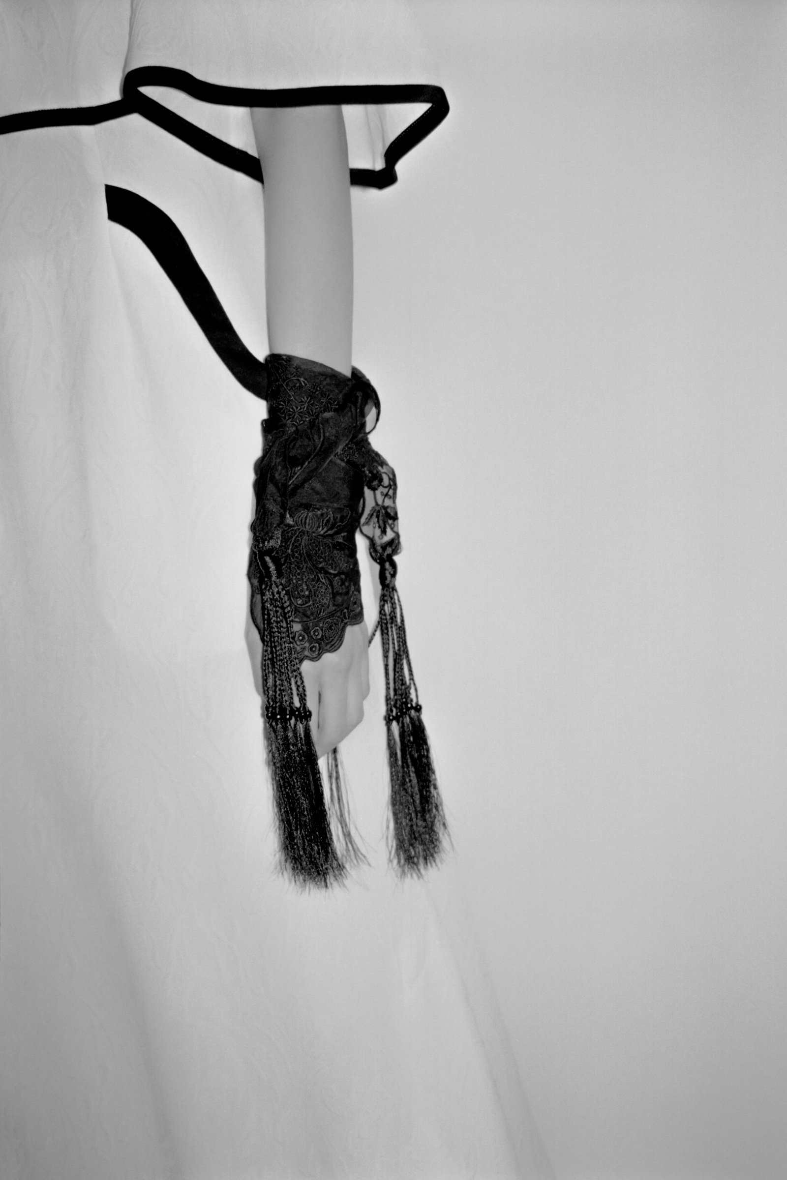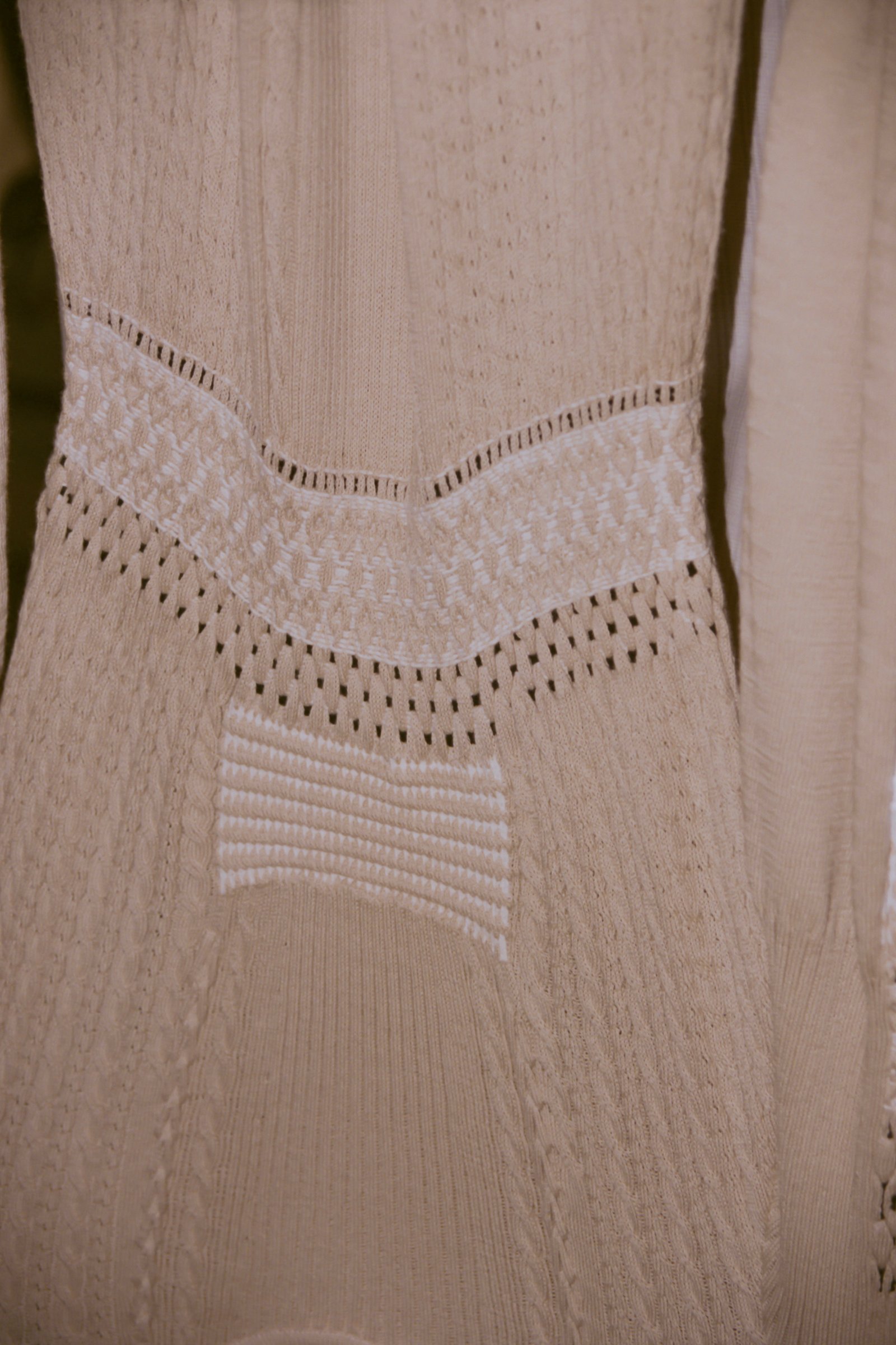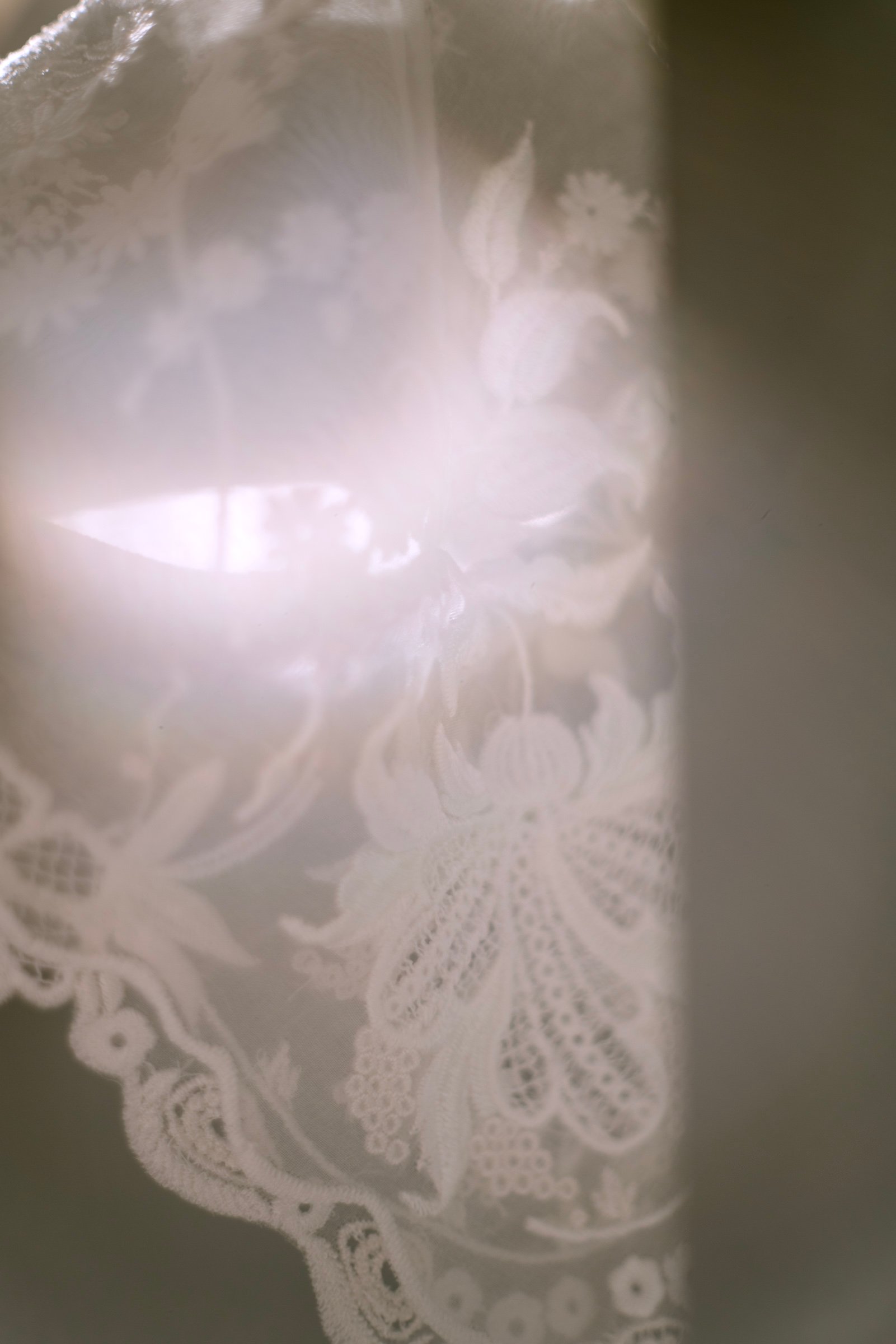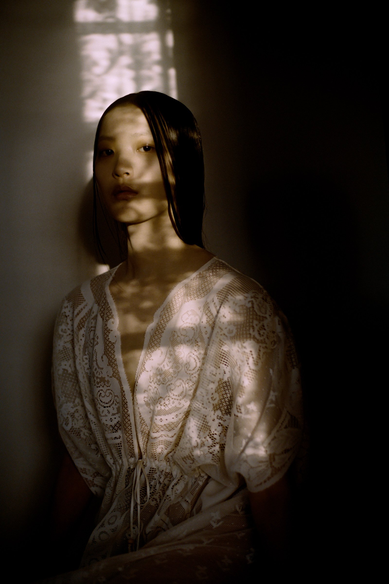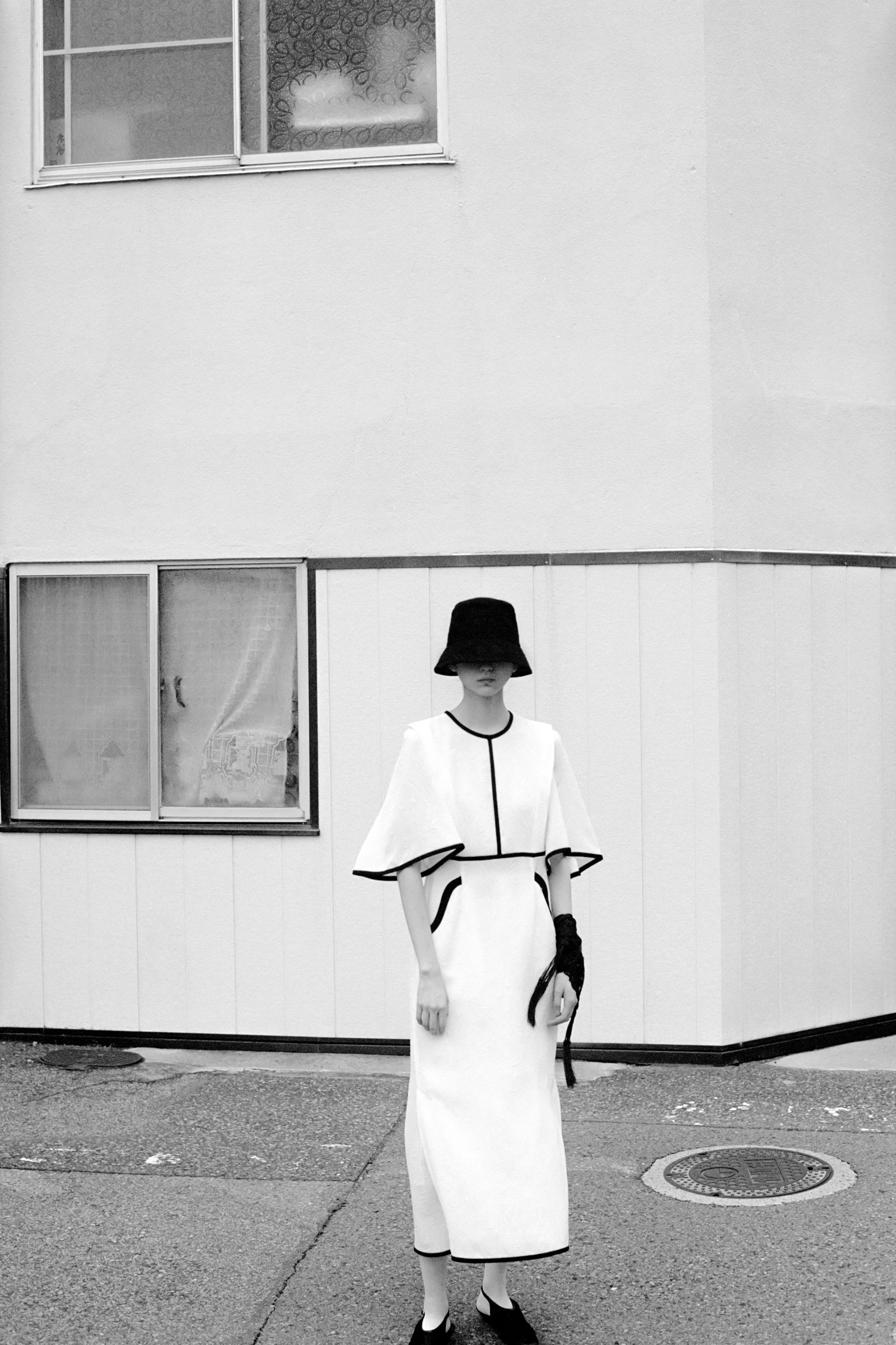 ルックブックは計48枚の写真で構成されたストーリーテリング仕立て。キーカラーの白は、ナチュラルなエクリュや陽に焼けたようなパステルイエローなど、バリエーション豊かに展開されている。町工場の窓枠や無人の部屋に忘れ去られたカーテンといったこれまで撮りためていた写真やスケッチから、柔らかなテクスチャーや身体を包むボリューム、豊かなタックといったファブリックやディテールが生まれた。随所に散りばめられた花のモチーフは、部屋で生けていたアヤメやユリなどの押し花や、窓際に飾られた花束などを編み地や刺繍などで描いている。