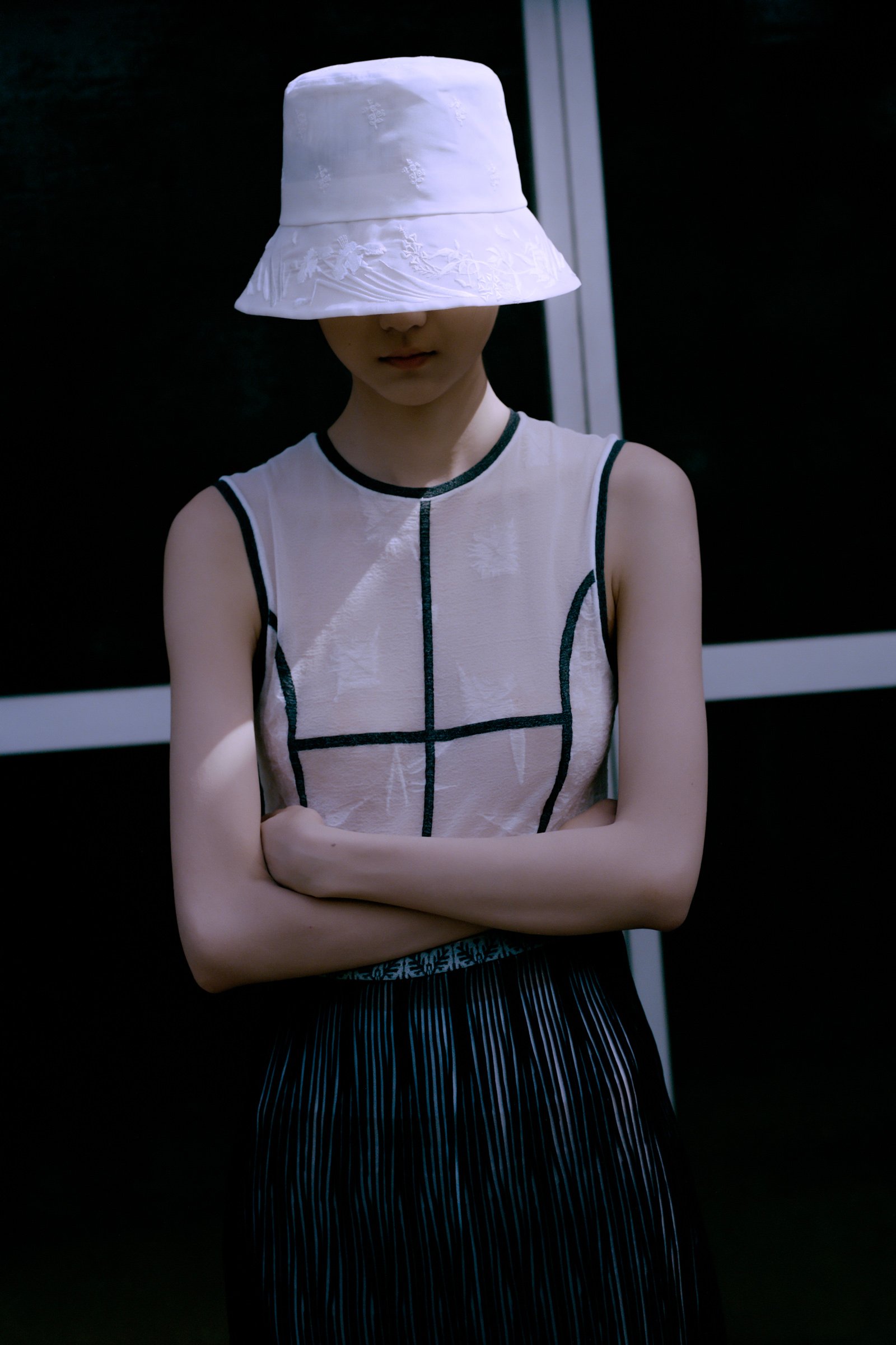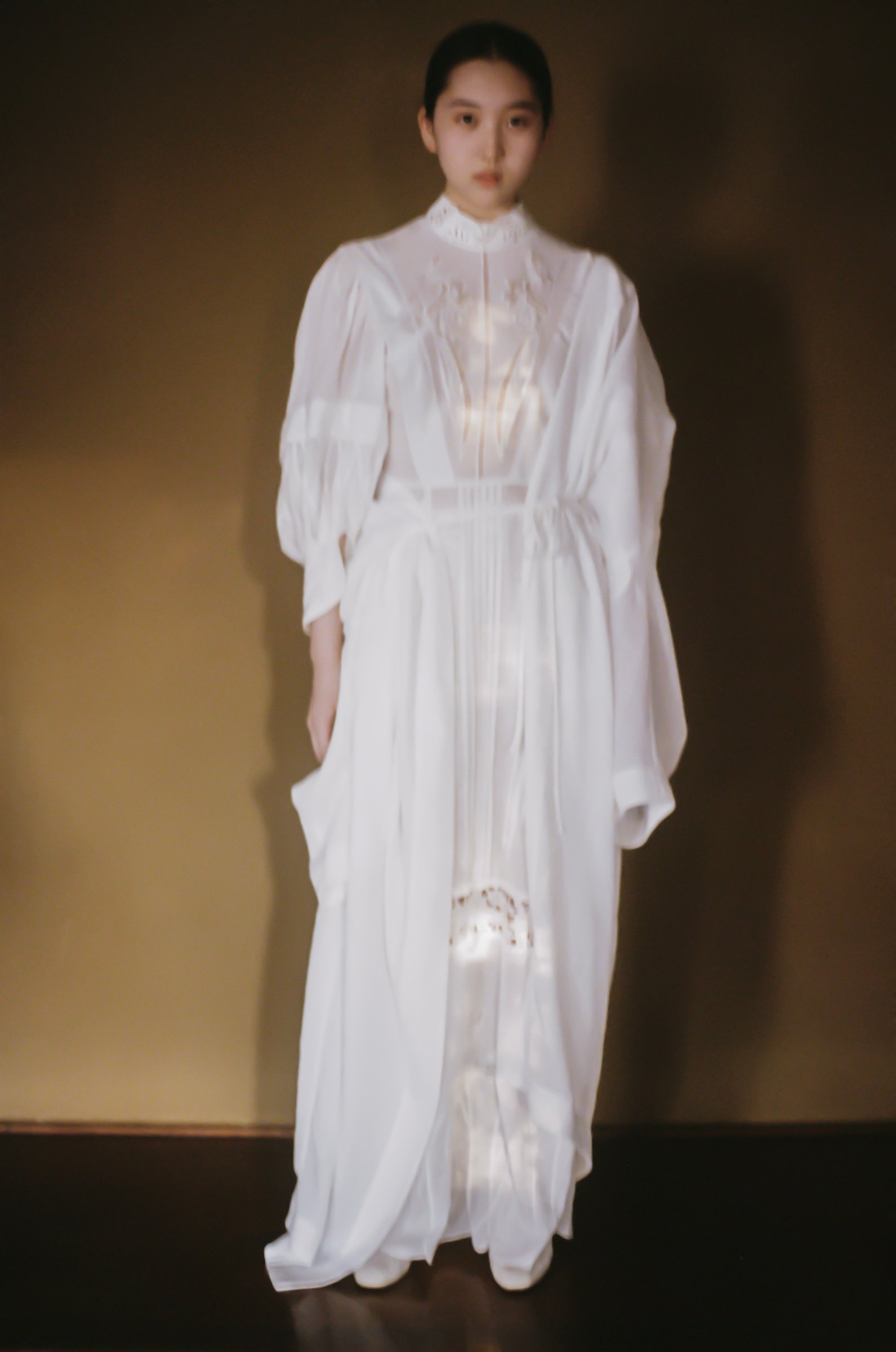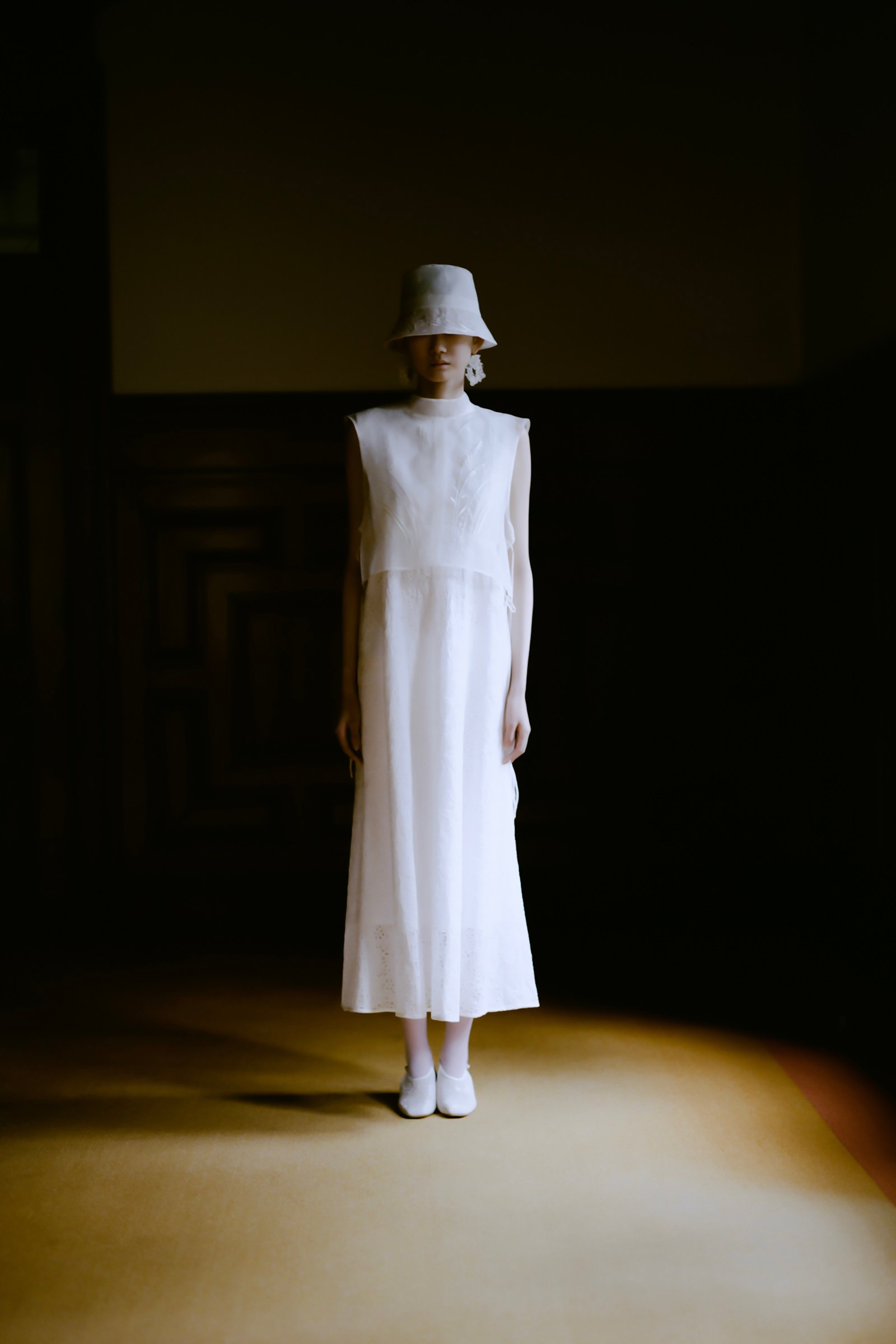透かし模様が懐かしさを呼び起こすレースカーテンをそのまま着ているようなドレスをはじめ、網戸や磨りガラスをモチーフとしたシアーな素材がノスタルジアを感じさせる。一方で、窓枠を想起させる格子柄や片襟のみのアシンメトリーデザイン、目深なバケットハットといったスタイリングはモダンな印象だ。刺繍が施されたバッグやシューズ、そして腕に巻かれたシルクオーガンジーのスカーフがアクセントとなっている。