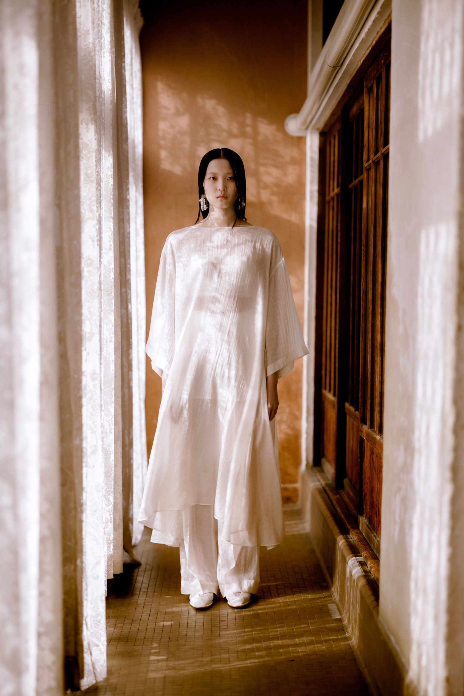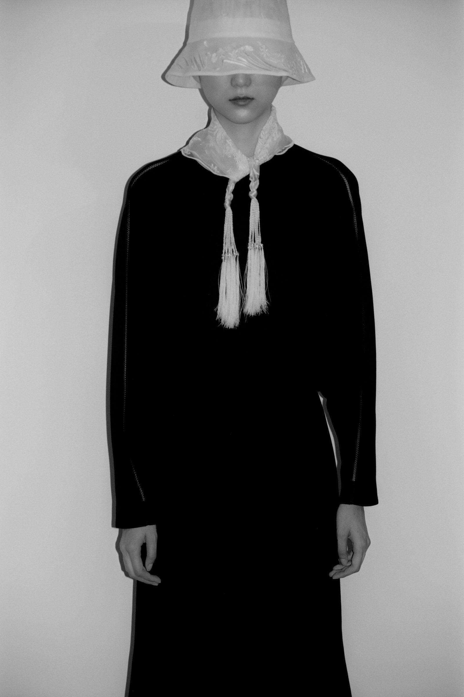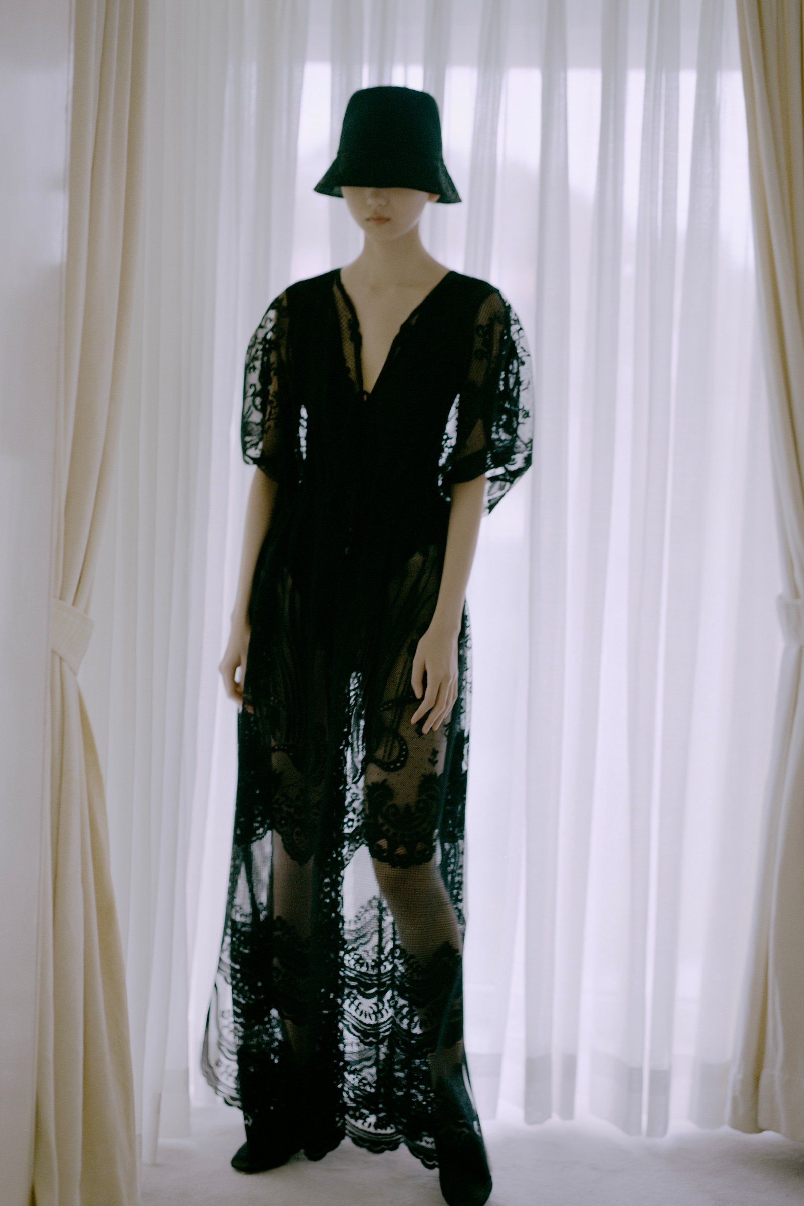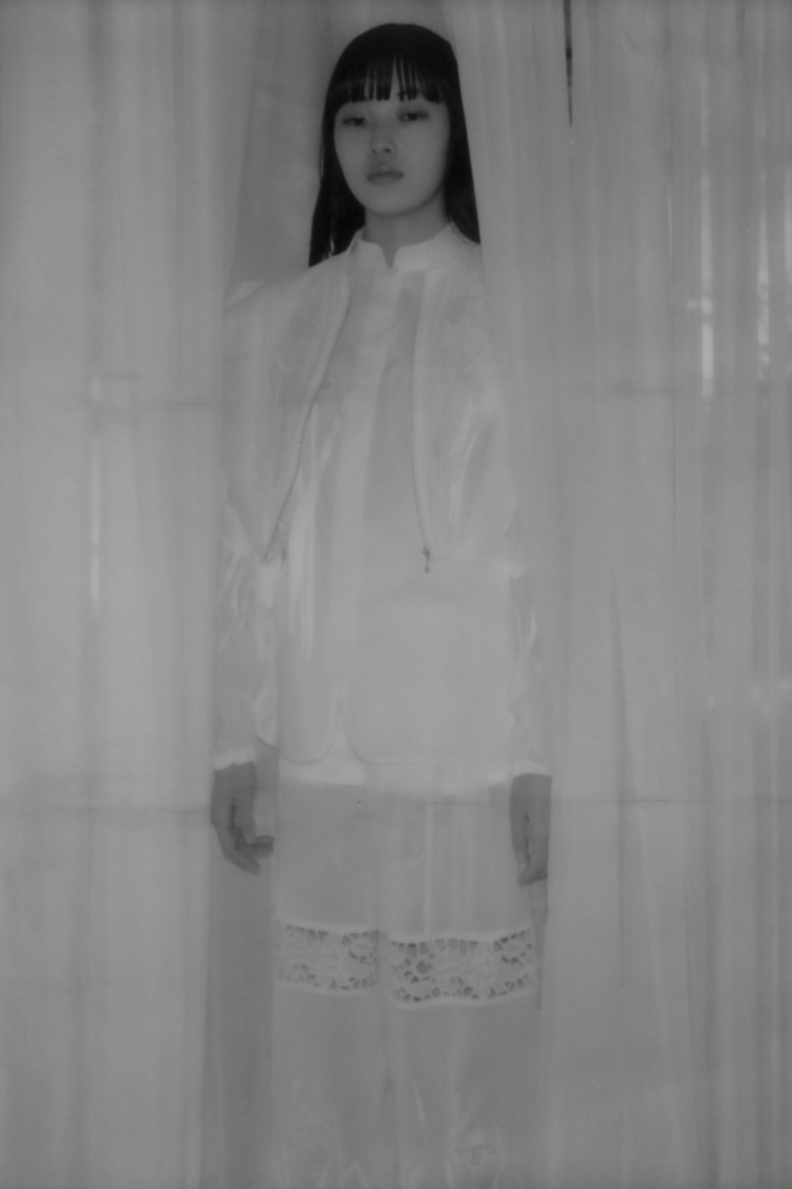 透かし模様が懐かしさを呼び起こすレースカーテンをそのまま着ているようなドレスをはじめ、網戸や磨りガラスをモチーフとしたシアーな素材がノスタルジアを感じさせる。一方で、窓枠を想起させる格子柄や片襟のみのアシンメトリーデザイン、目深なバケットハットといったスタイリングはモダンな印象だ。刺繍が施されたバッグやシューズ、そして腕に巻かれたシルクオーガンジーのスカーフがアクセントとなっている。