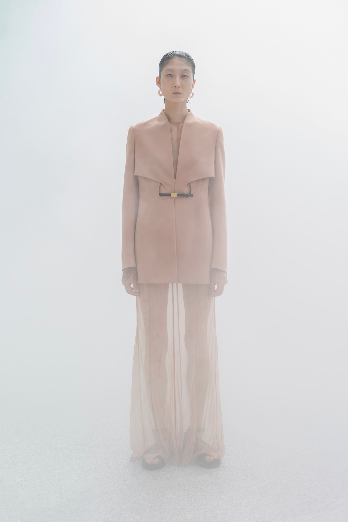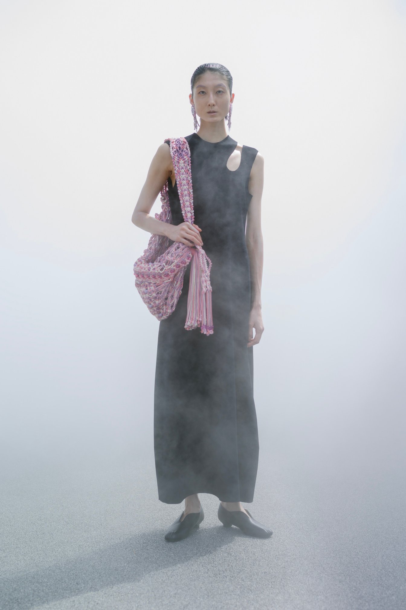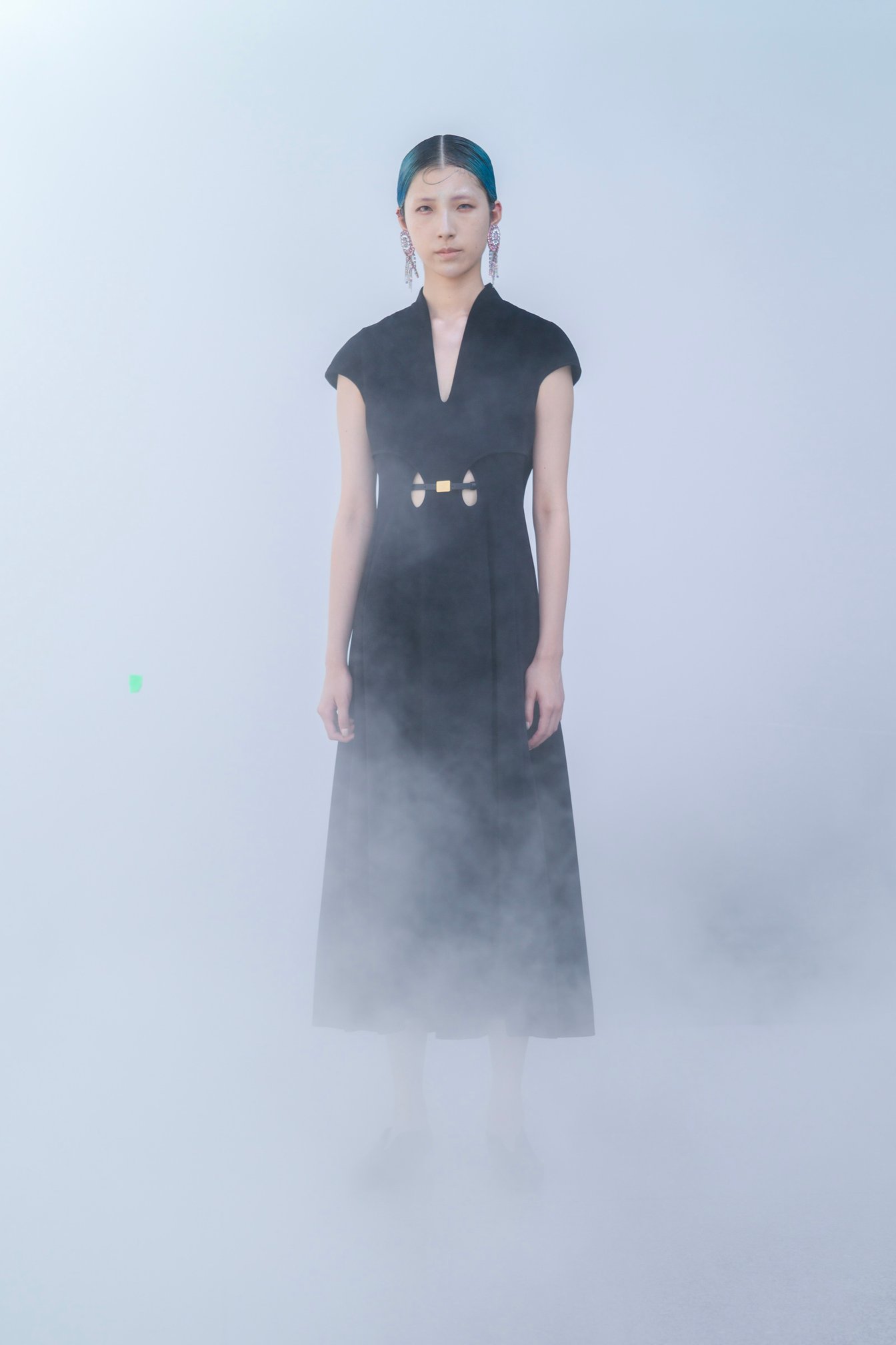 マメ クロゴウチのルーツを見つめ直し辿り着いたのは、デビューコレクションで発表したキャップスリーブのドレス。今ではブランドの象徴となっている曲線のカッティングと、特徴的な穴の空いたデザインを現代にアップデートし、ジャケットやドレスなどを仕立てた。