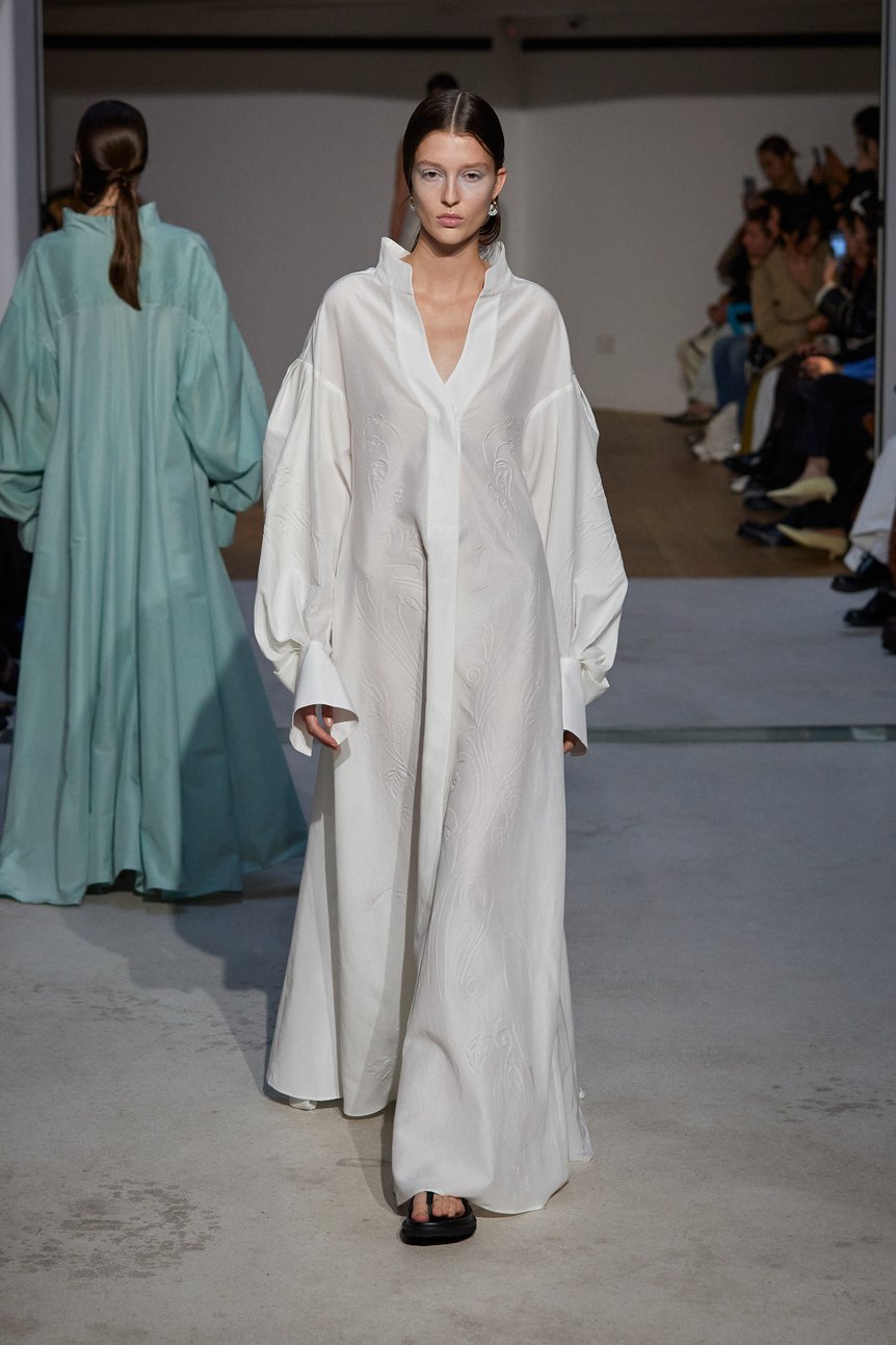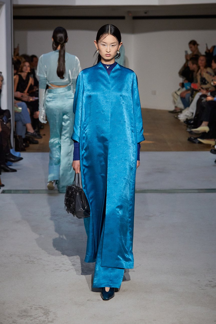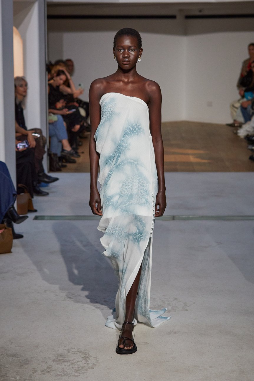 さらに、自身が繰り返し訪れた佐賀の景色を投影した、草花モチーフのジャカードが、ドレスやジャンプスーツで登場。シルクのコートやセットアップに織り込まれた唐風の模様も、パーソナルな記憶のかけらの投影だという。