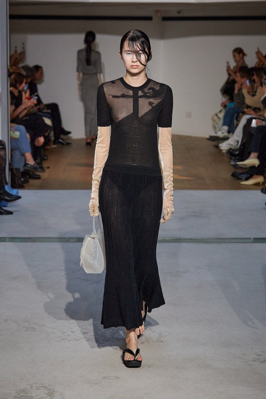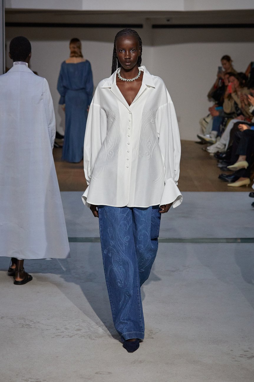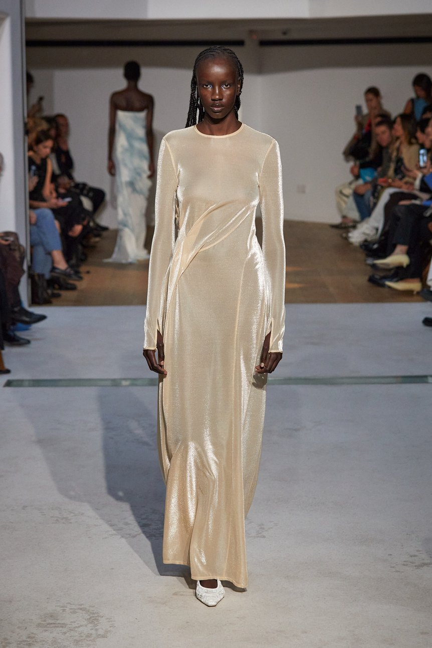 さらに、自身が繰り返し訪れた佐賀の景色を投影した、草花モチーフのジャカードが、ドレスやジャンプスーツで登場。シルクのコートやセットアップに織り込まれた唐風の模様も、パーソナルな記憶のかけらの投影だという。