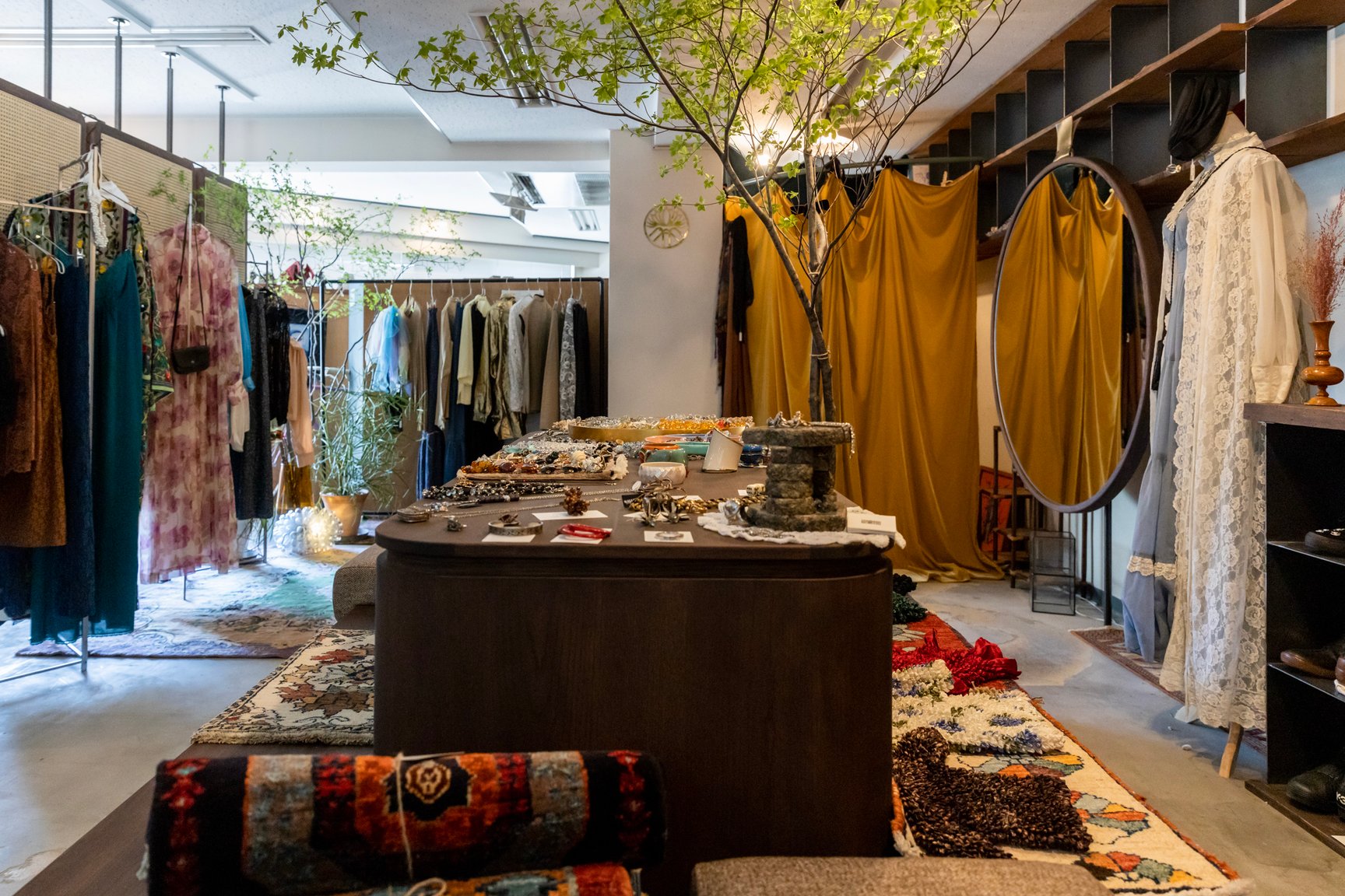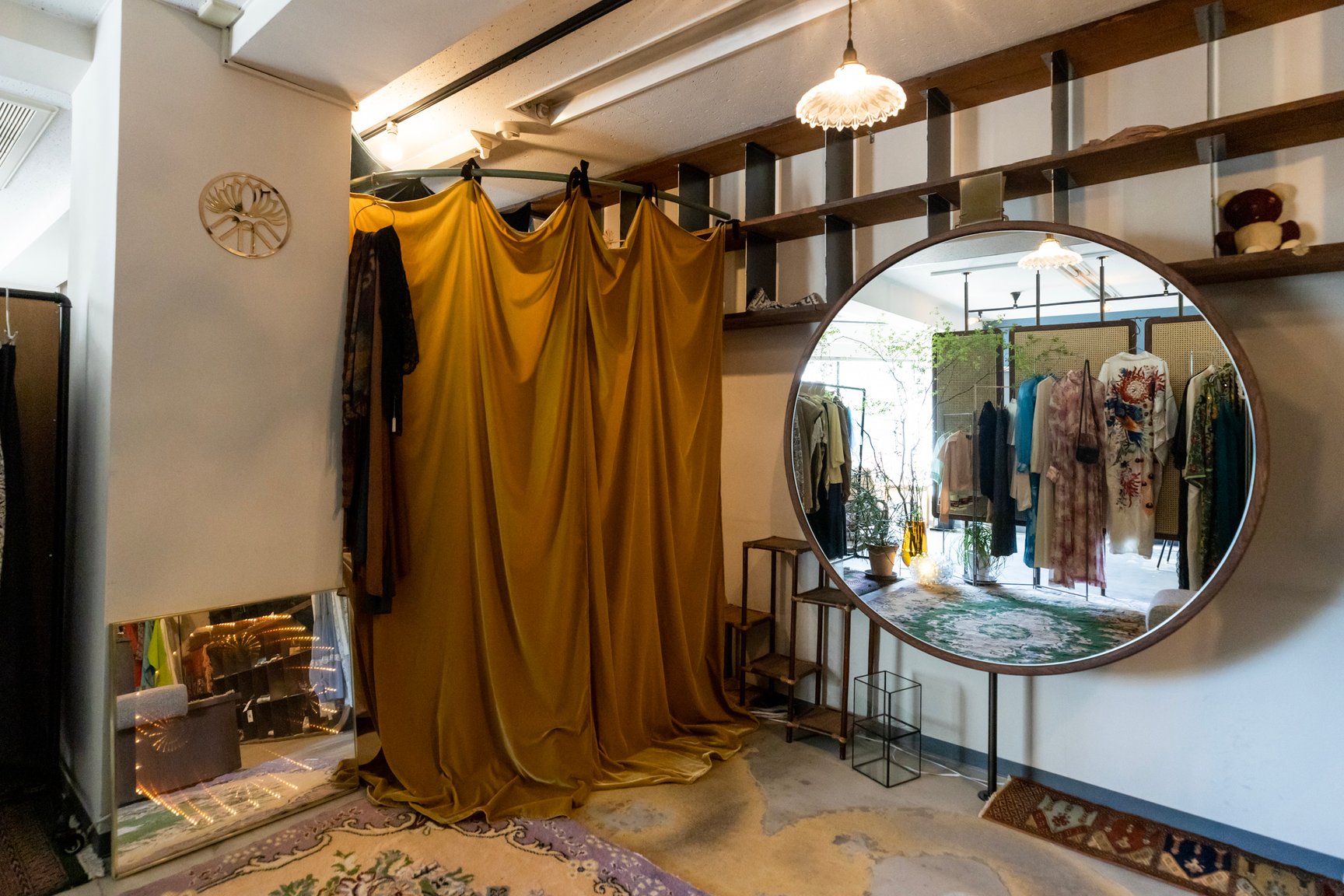 移転後の新店舗は、代々木八幡駅から徒歩1分程のビルの2階フロアに入居。営業は基本的に金曜から火曜までで、今後はナイトマーケットなどさまざまなイベントを企画していくそう。アイテムを買い付ける地域は主にアメリカ、カナダ、ヨーロッパ。店内には色彩豊かなロングドレスやローブ、ユニークなアニメTシャツ、ブランド古着、ラグ、雑貨など多岐にわたるアイテムを展開し、メンズアイテムも取り扱っています。