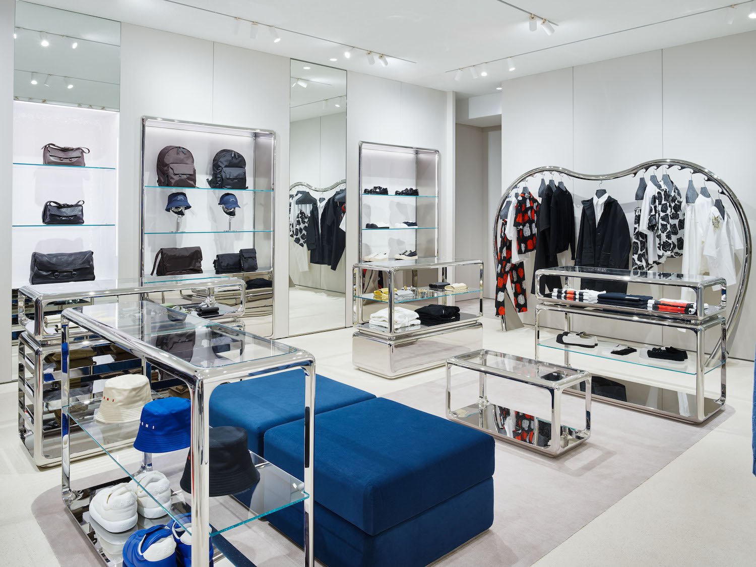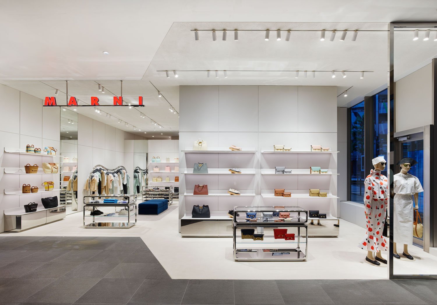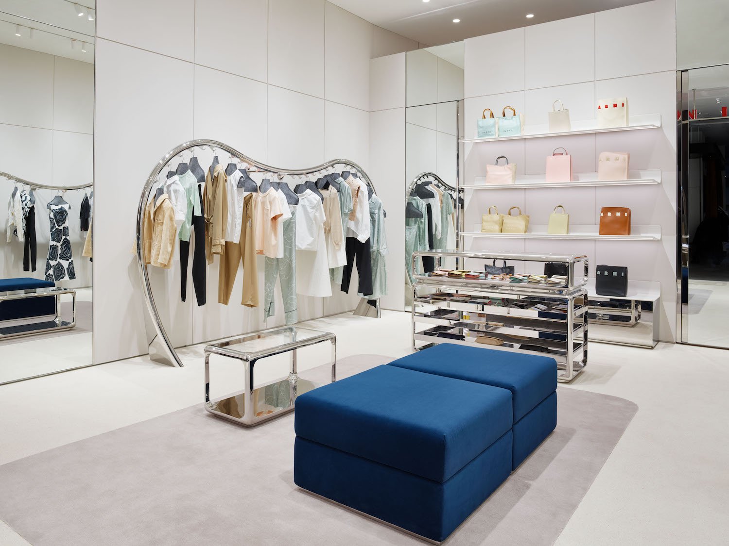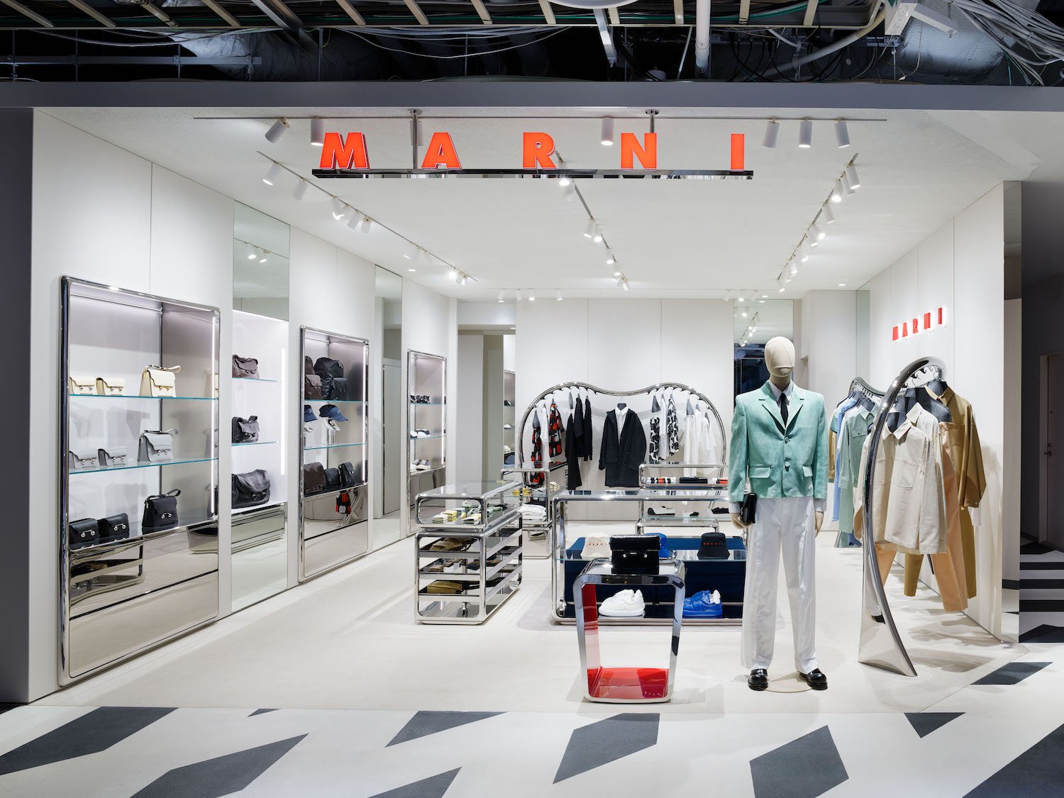 輝きと彫刻的なデザインの新コンセプトを取り入れた「マルニ 渋谷パルコ」は、1階にウィメンズ、2階にメンズを展開する2フロア構成。アルミ素材の曲線が美しい什器や、テラゾー仕上げのグレーの壁面、プルシアンブルーのベルベットソファなど、1960年代の美学を現代的に再解釈したディテールがちりばめられている。質感のコントラストが特徴で、メタリックの輝きがアクセントに。温かみのあるグレーを基調とした床と、水面のような波打つ凹凸感のある壁に、豊かな色彩が溶け込み、洗練されたショッピング体験を演出する。