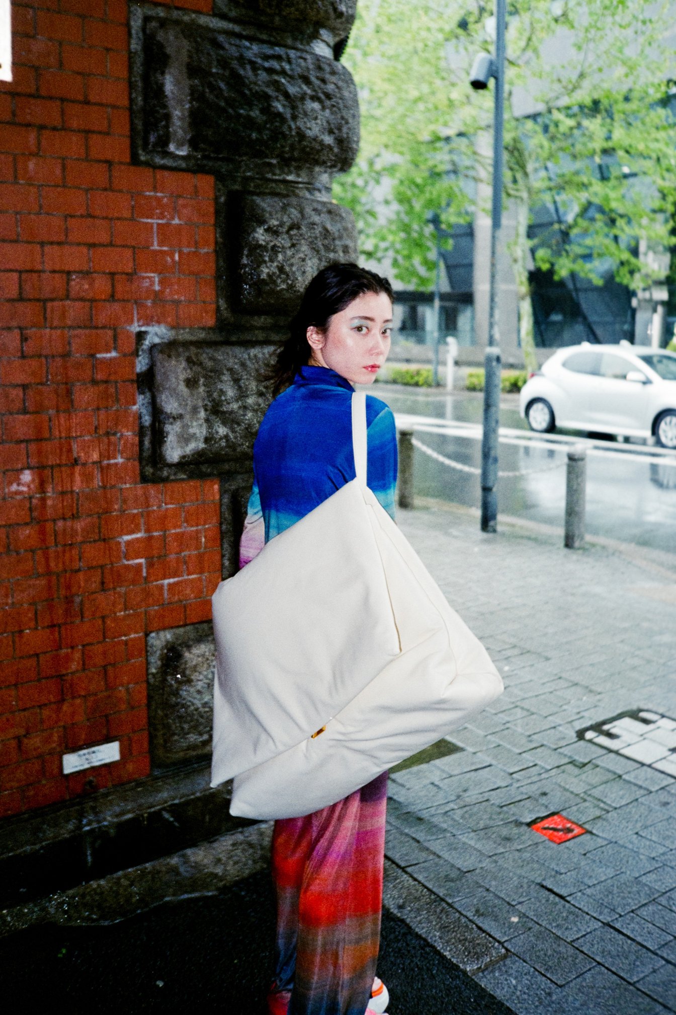 ふかふかの枕のような触り心地と、印象的なボリュームが魅力のマキシバッグは、銀座三越で開催中のポップアップ限定アイテム。大容量のコンパートメントと長めのストラップが特徴で、ボディバッグとして身に着けることができる。カラーはアイボリーとサンの2色展開。街の視線を集める主役級アイテムで、自分らしい個性を発揮して。