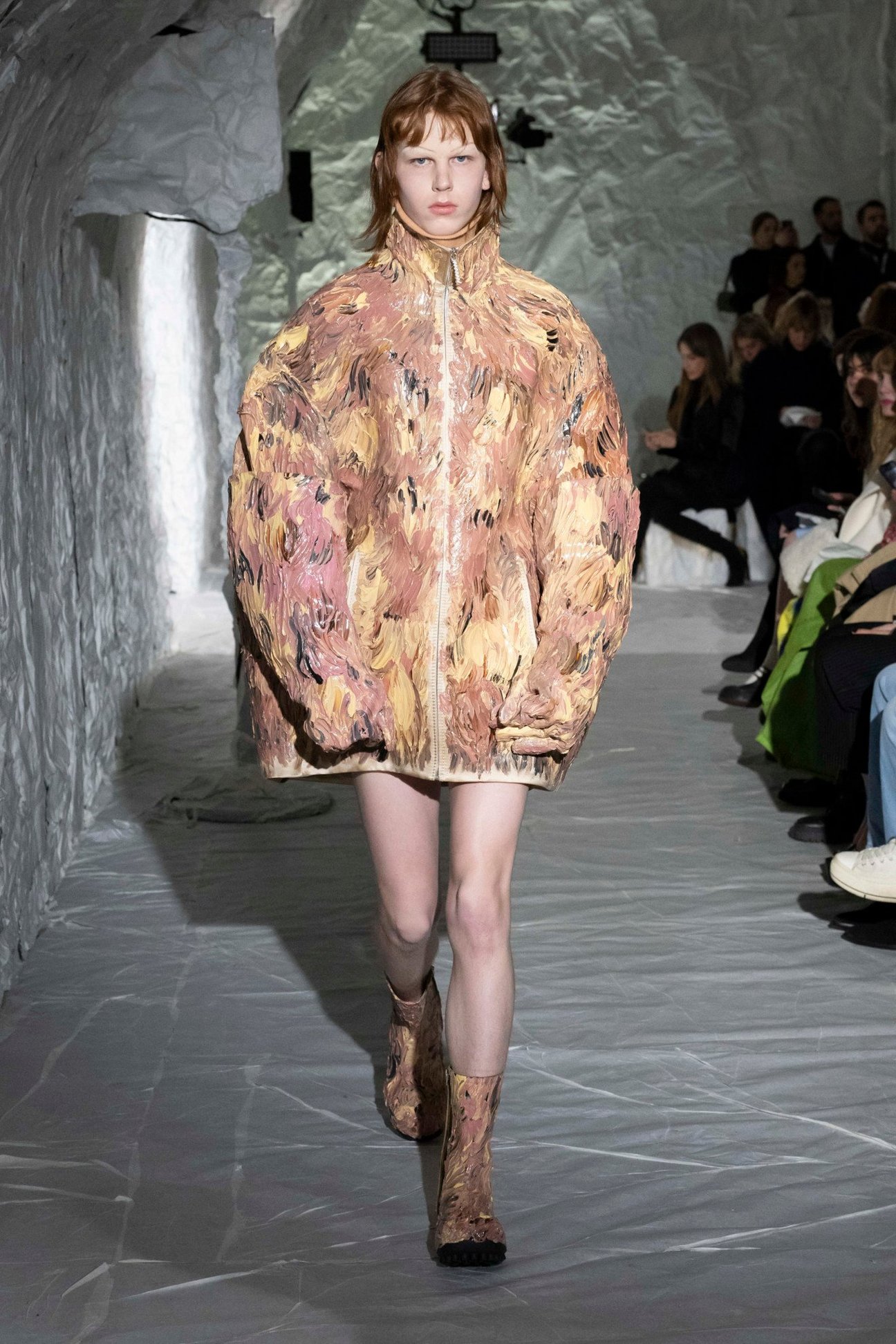 黒から一転、動物と同様の状態に戻って思考したという思いと共に、さまざまな固有の色を持つ動物にプリミティブさを感じたからか、後半はレオパード柄やシアリングなど動物を連想させるデザインがコレクションを彩った。油絵のようなレザーにアクリル絵具を塗ったジャケットはアブストラクトそのもので、リッソが幼少期に感じた"何かが作られる前の状態"の素晴らしさ、コンテクストがなく何物からも解放された自由な表現を、30周年を迎えたマルニの指針として改めて示した。