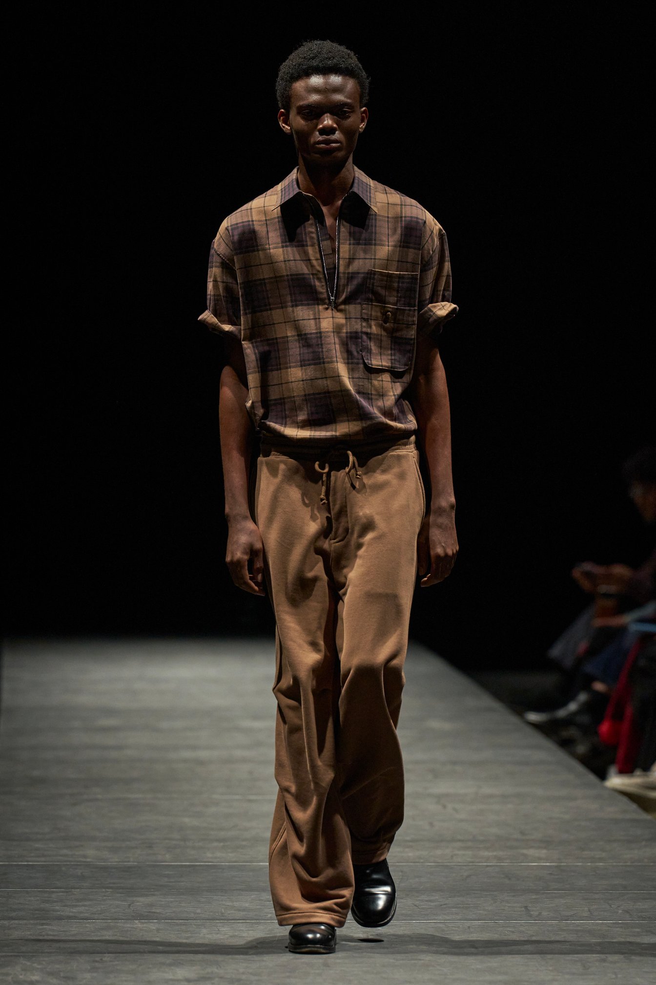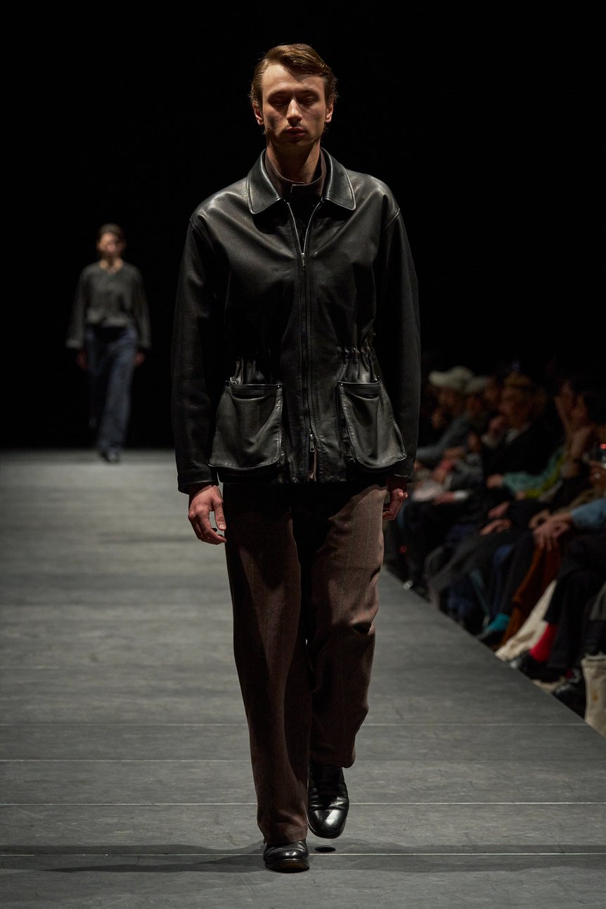 中盤には作業着から着想したジャンプスーツが披露。ラフな表地に対比するように、光沢のあるシルク混のテキスタイル裏地に採用し、労働者の内面に秘めた“誇り”を表現したという。このほか、堅牢なウールやコットンにカシミア混の素材を組み合わせたルックも披露。チェックのシャツとショーツのセットアップにラウンドネックのカーディガンを合わせたルックなどがその例だ。松藤は「日常の中にある静かな強さを表現するために、異なる質感の素材を組み合わせ、無骨さと繊細さの両立を目指した」と語った。