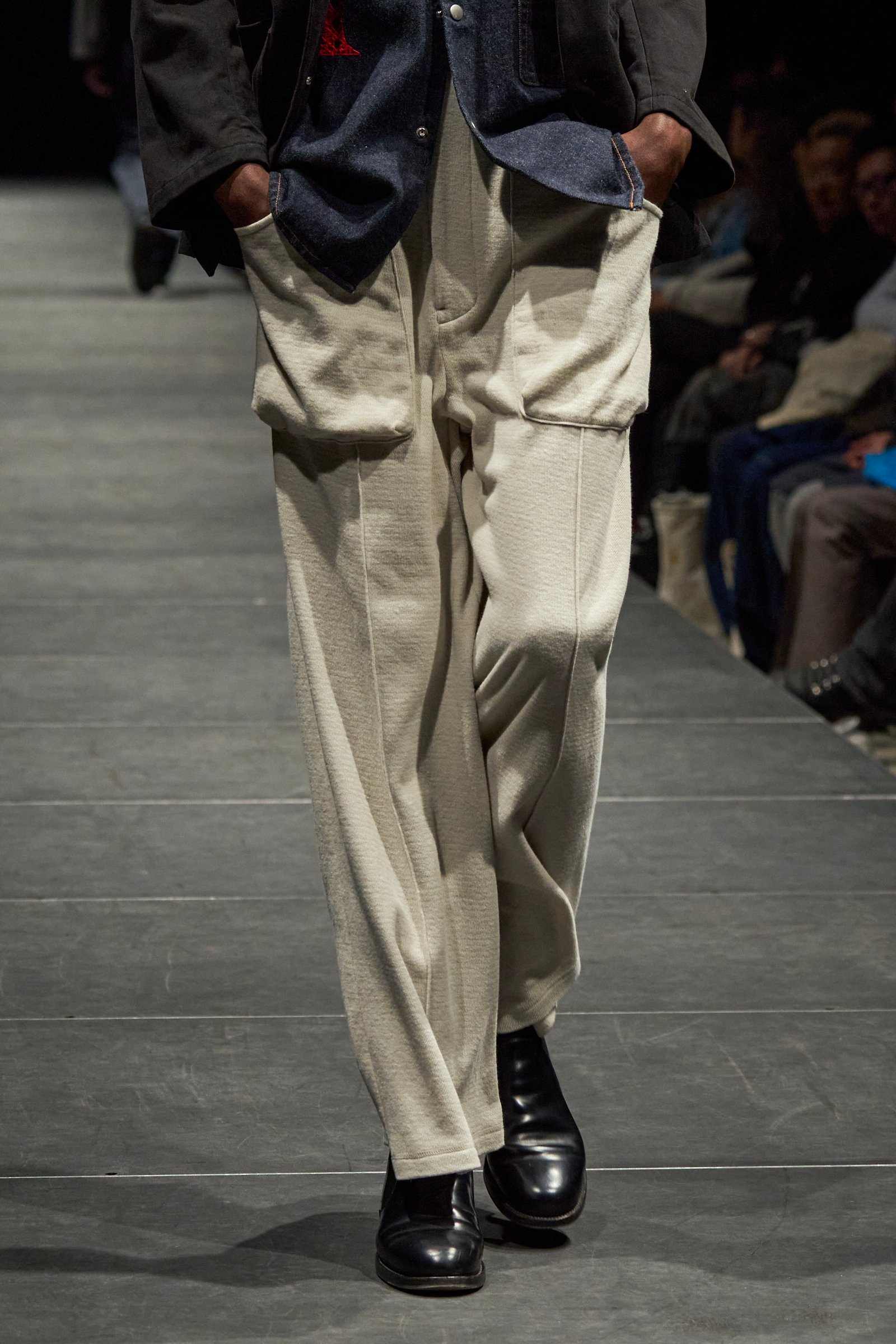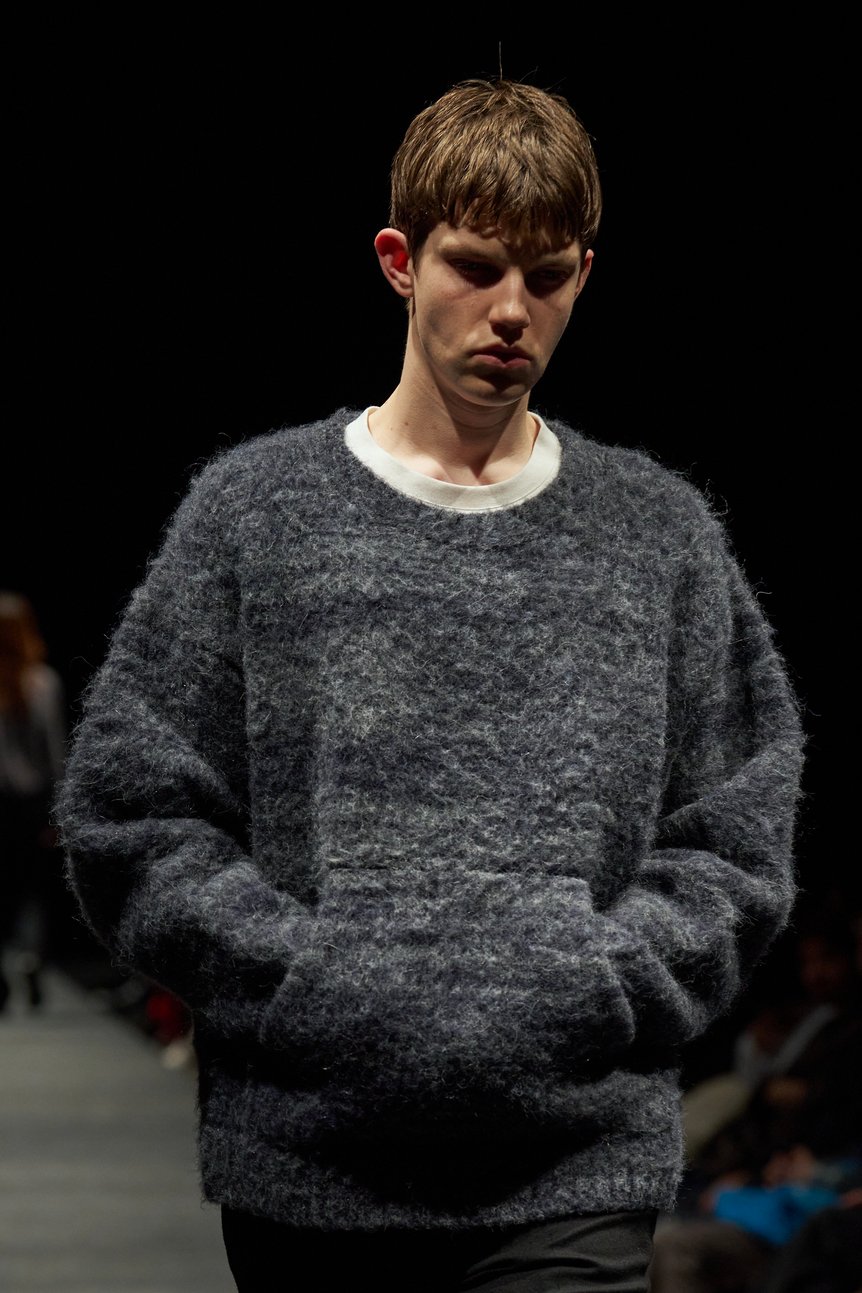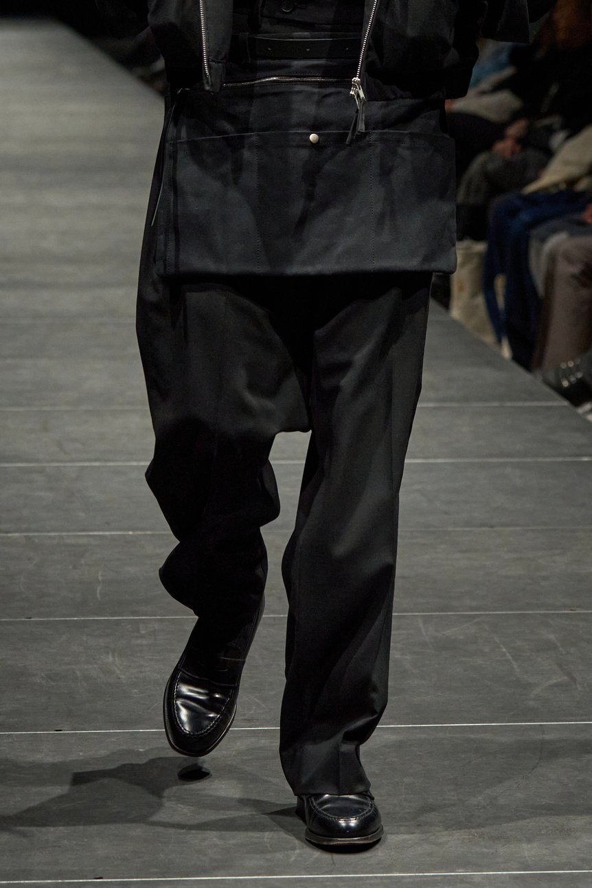 ディテールについて、作業に適したビッグサイズのポケットは随所で散見された。スウェットパンツの前面や、レザージャケットなどに配されている。パーカから着想したカンガルーポケットも目立つ。ニットやステンカラーコート、ストライプシャツに採用されている。また、アノラックのハーフジップを落とし込んだチェックシャツも登場。ボトムスには光沢感を湛えたスウェットを合わせ野暮ったくなりすぎないバランスに仕上がっている。
