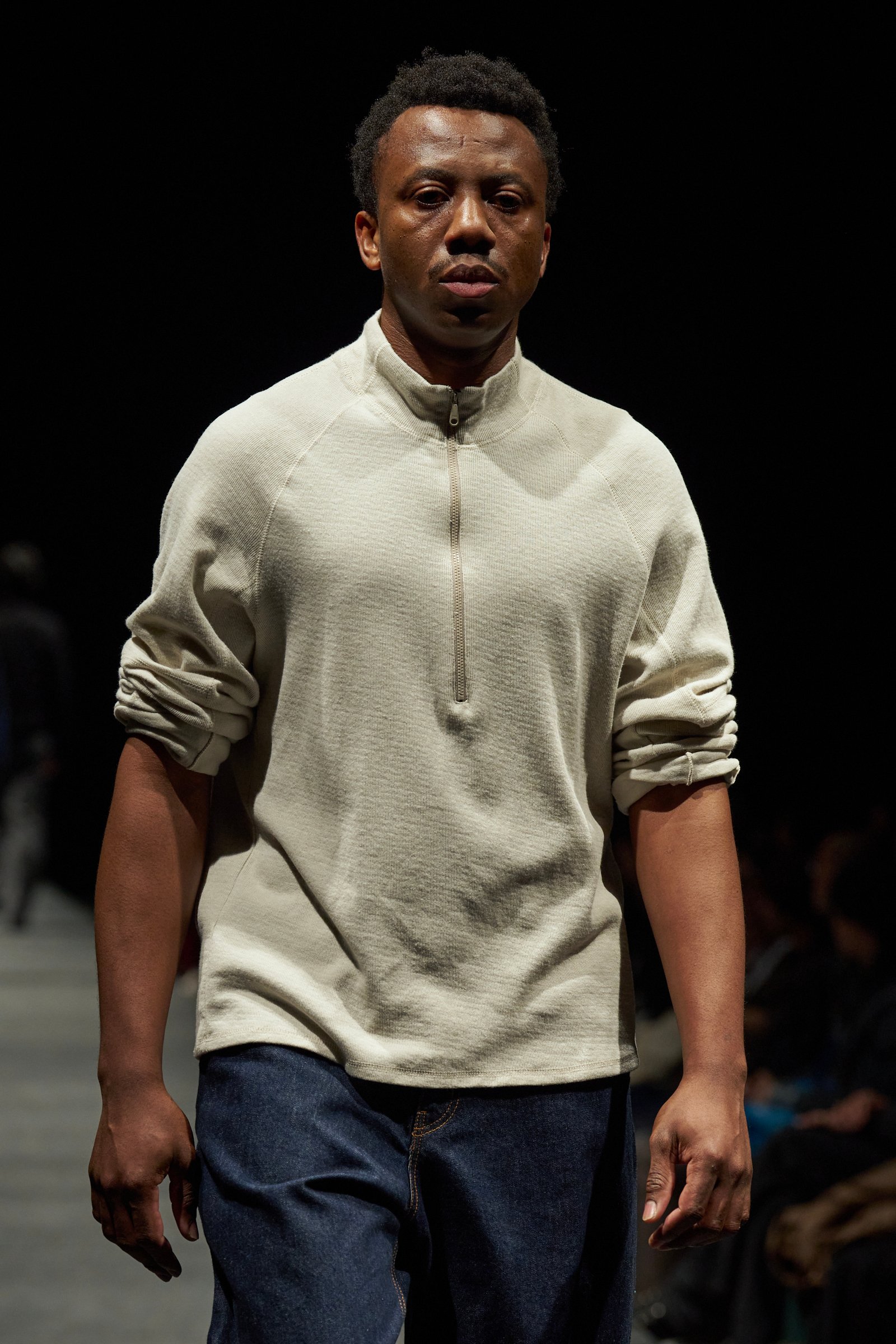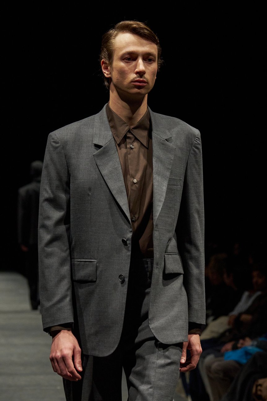 松藤が着目したのはフィンランドの映画監督 アキ・カウリスマキ(Aki Kaurismäki)が手掛けた「労働者三部作」と呼ばれる貧しい労働者の生活を描いた連作。作中で描かれているのは、単調な労働や沈黙の時間。そしてそんな日々の中でささやかな希望を持って生きる労働者の姿。そこには、飾り気のない素朴な毎日と、誇りを手放さない“普遍的な美しさ”がある。会場となった渋谷ヒカリエホールAに、心臓が震えるような重低音が鳴り響く中、ショーが幕を開けた。