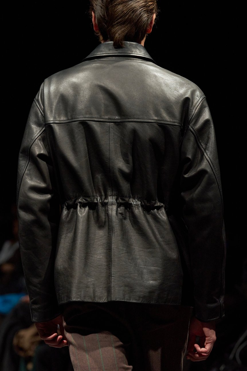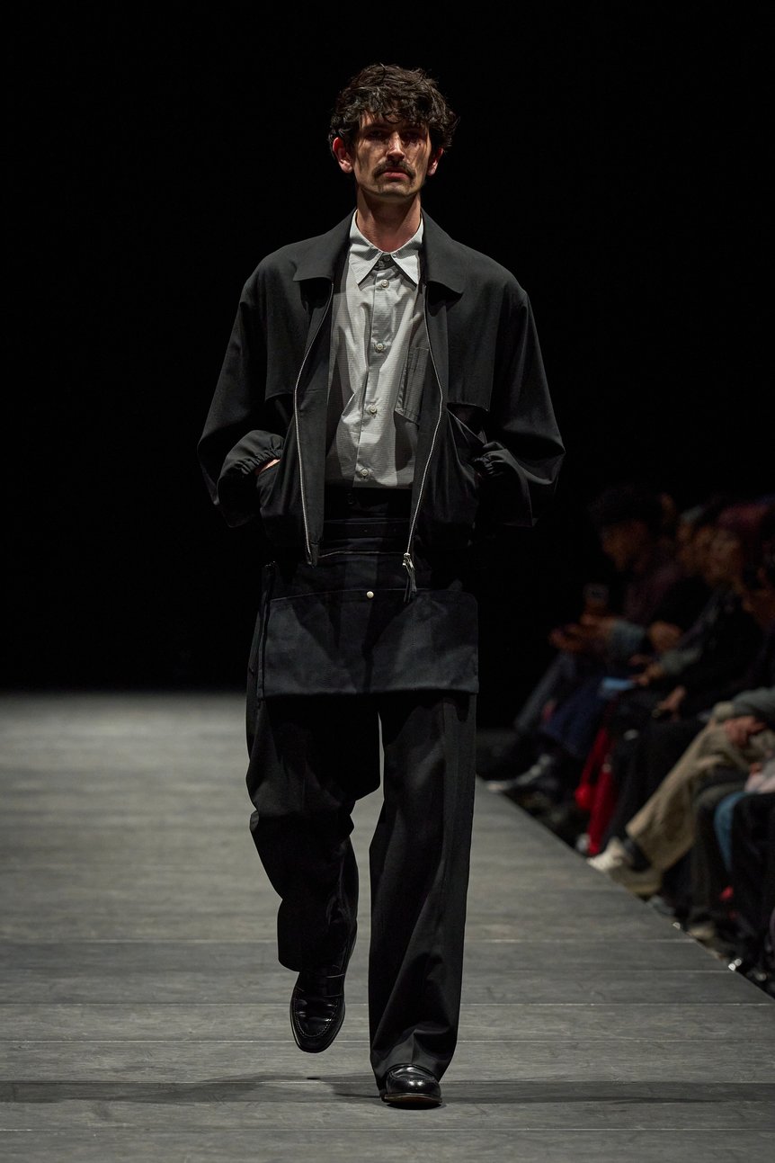 ランウェイで目を引いたのは、ワークウェアを引用しながらも、現代的に仕上げたスタイリングの数々。ファーストルックでは、工具や部材を携行するための腰巻き型のワークエプロンに、ギンガムチェックのシャツやローファーといったドレス要素を重ねた。続くルックで登場したのは工場を思わせるマットな質感なヌバックレザージャケット。作業服やジャンプスーツなどで見られるウエストギャザーを採用しながらも、ボトムスはストライプのスラックスを合わせることで巧みにバランスを保っている。このほか、作業服などに用いられるアクションプリーツを背面に採用したジャケットも登場した。