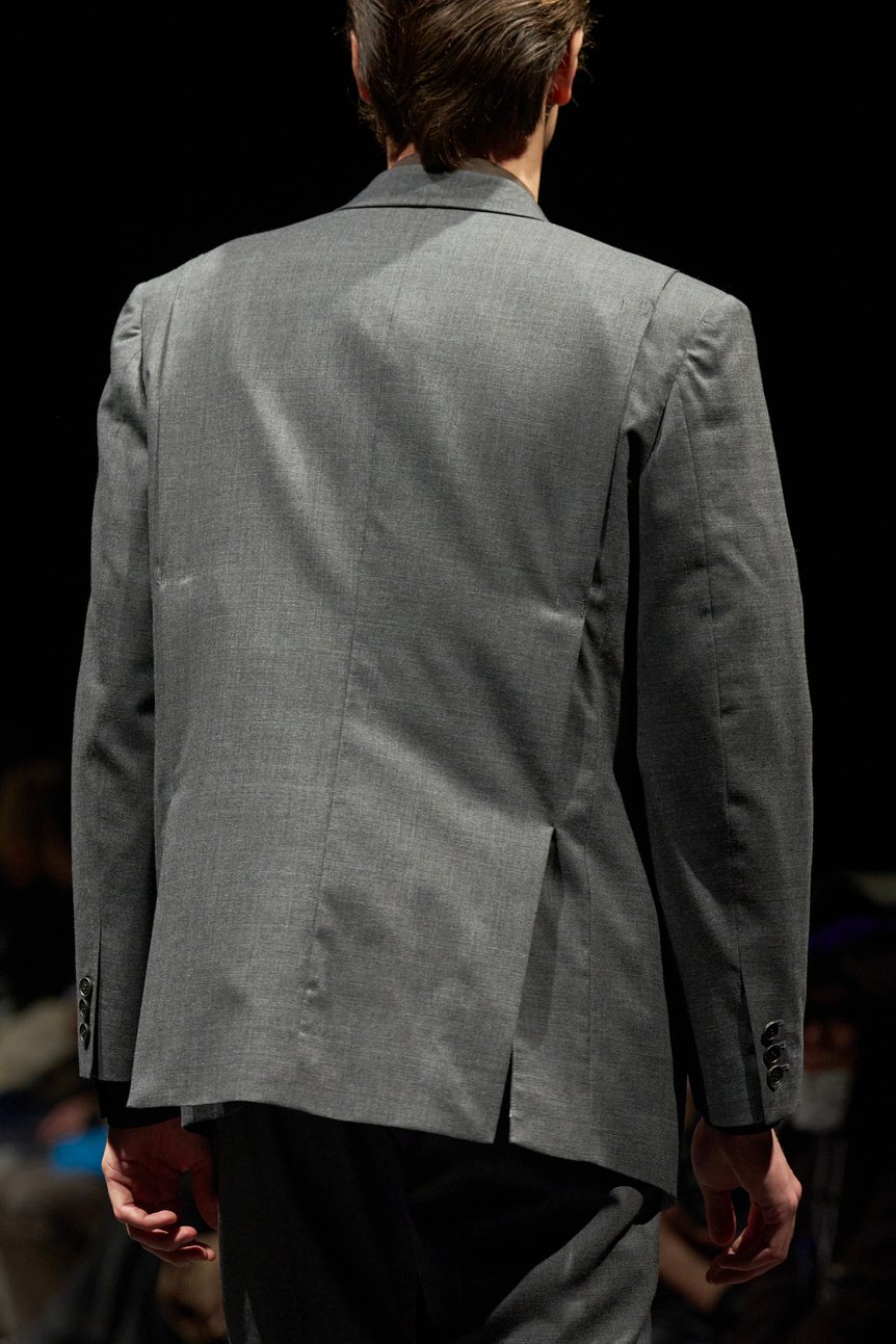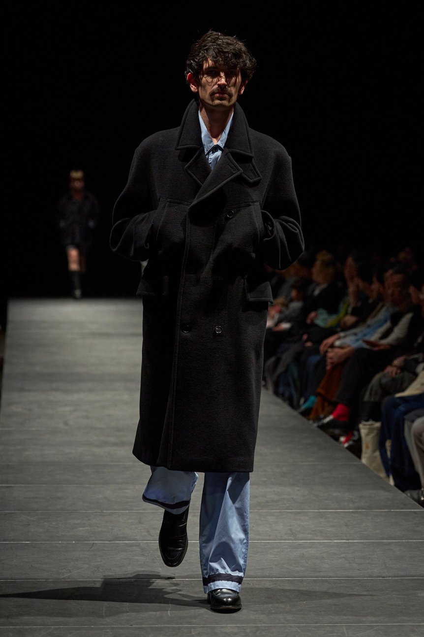 このようなコントラストを通じた表現は素材に留まらない。カラーパレットは、ダークトーンでまとめたルックや、グレーのセットアップなどを基調として構成した一方で、インナーにホワイトを差し込んだコーデも提案されている。ラストルックは、その代表例でブラックのステンカラーコートのインナーにはシャツを組み合わせ、袖からそれを覗かせた。「重めの色の中に、無垢な印象のホワイトを差し込むことで、内に秘めるささやかな希望を表現した」と松藤。