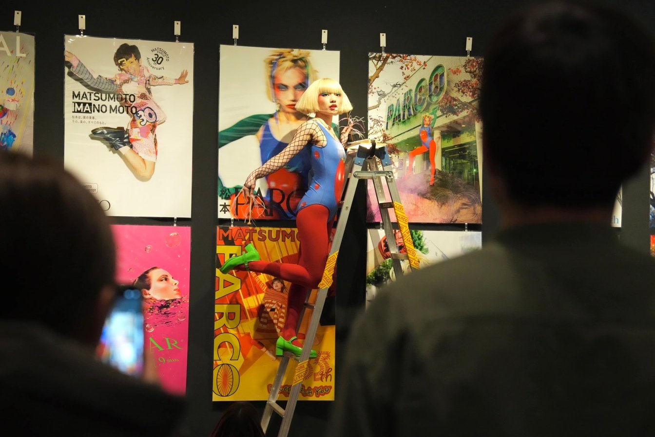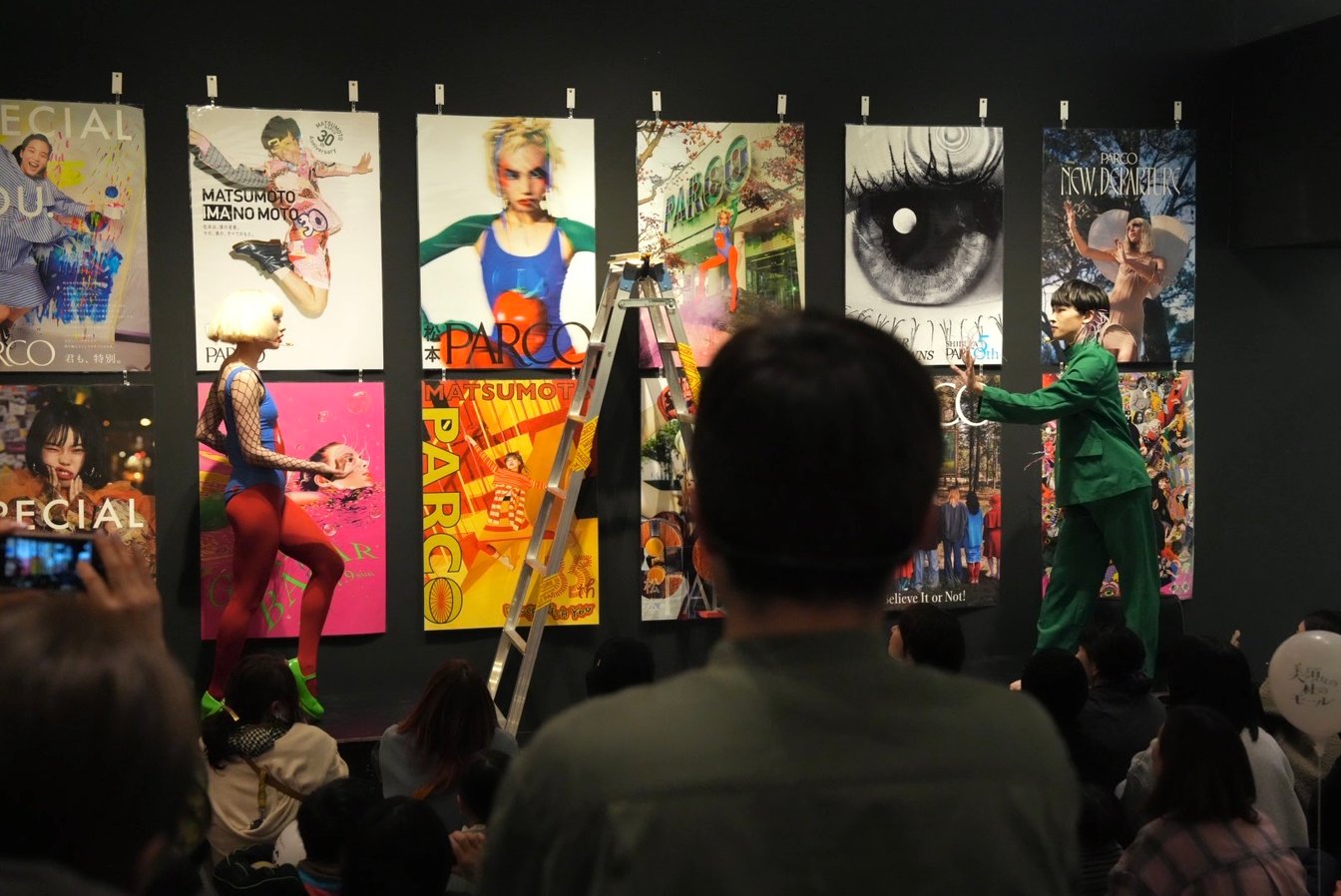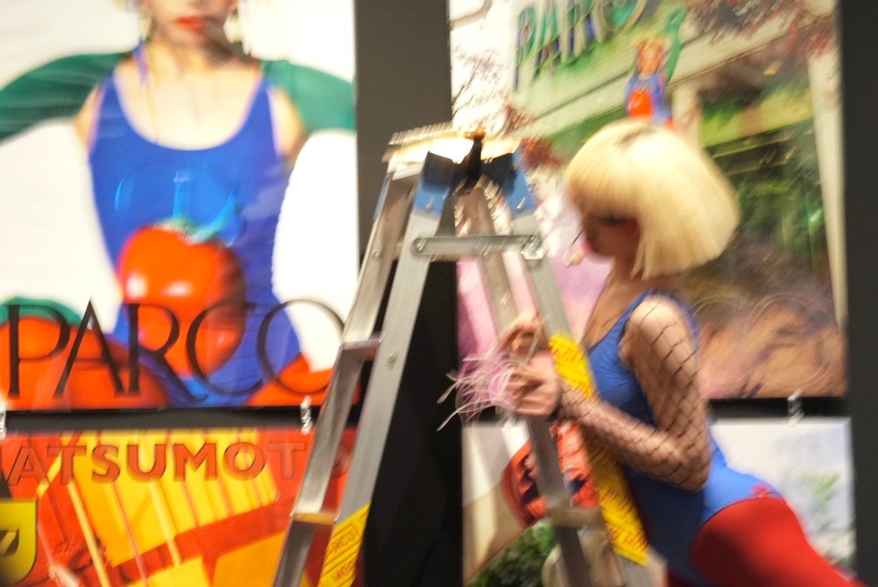 同じく6階の特設会場では、1969年から現在に至るまでのパルコのB全ポスター約100枚を展示するポスター展も開催。そして同会場では18:00から行われる、松本市出身のアーティスト アオイヤマダと高村月によるユニット「アオイツキ」のパフォーマンスのリハーサルが行われていた。