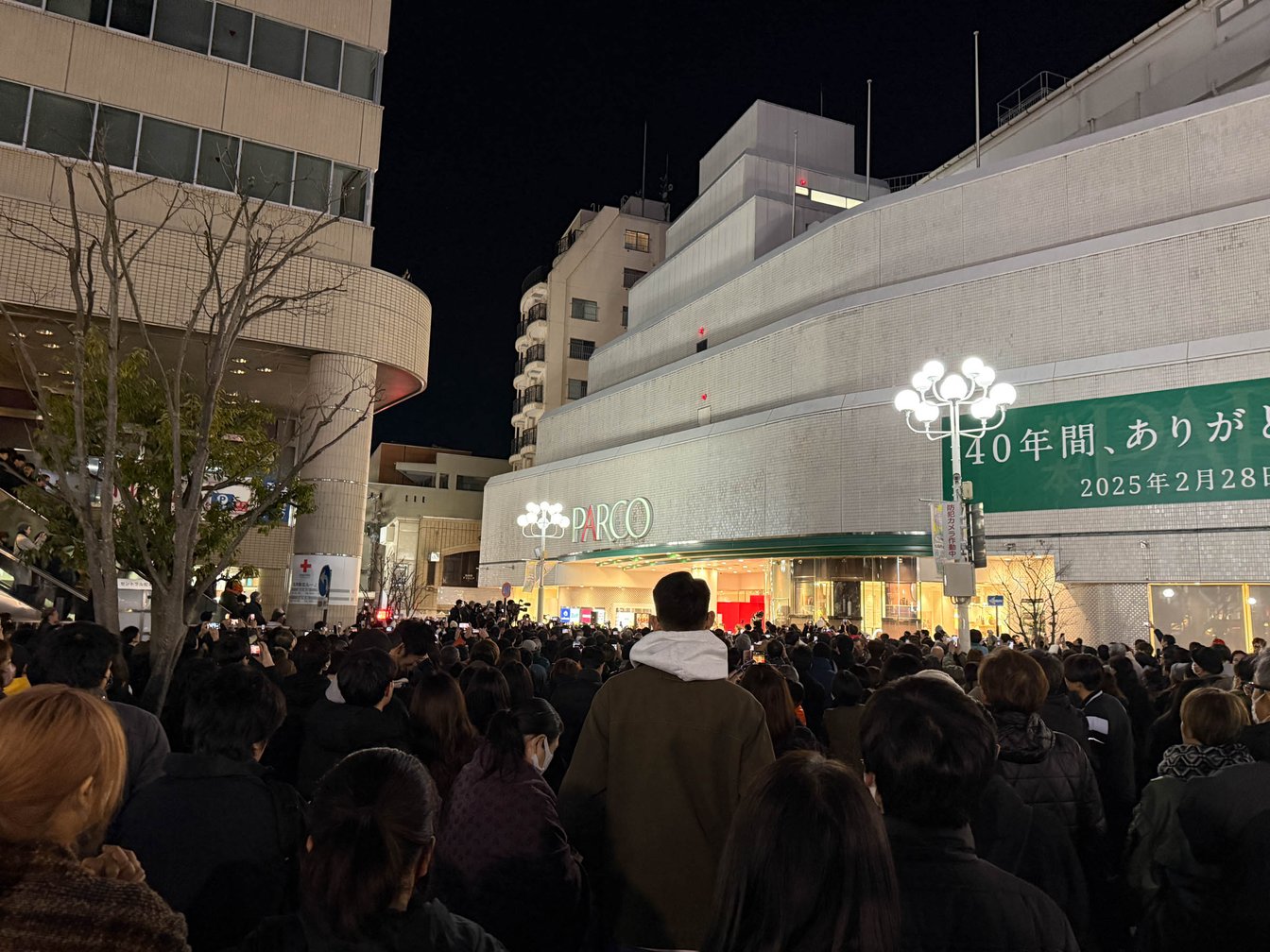 セレモニーの最後には、斉藤店長が登壇。「これほど深く愛されたパルコはないと感じております」と集まった住民たちに直接感謝を伝えた。シャッター代わりの垂れ幕が下りると、観衆からは拍手喝采と「ありがとう!」という力強い感謝の声が相次いだ。セレモニー後には、パルコを呼ぶ“パルココール”が自然と発生。パルコの最後の姿を写真に収めようと、人だかりの熱はなかなか冷めなかった。