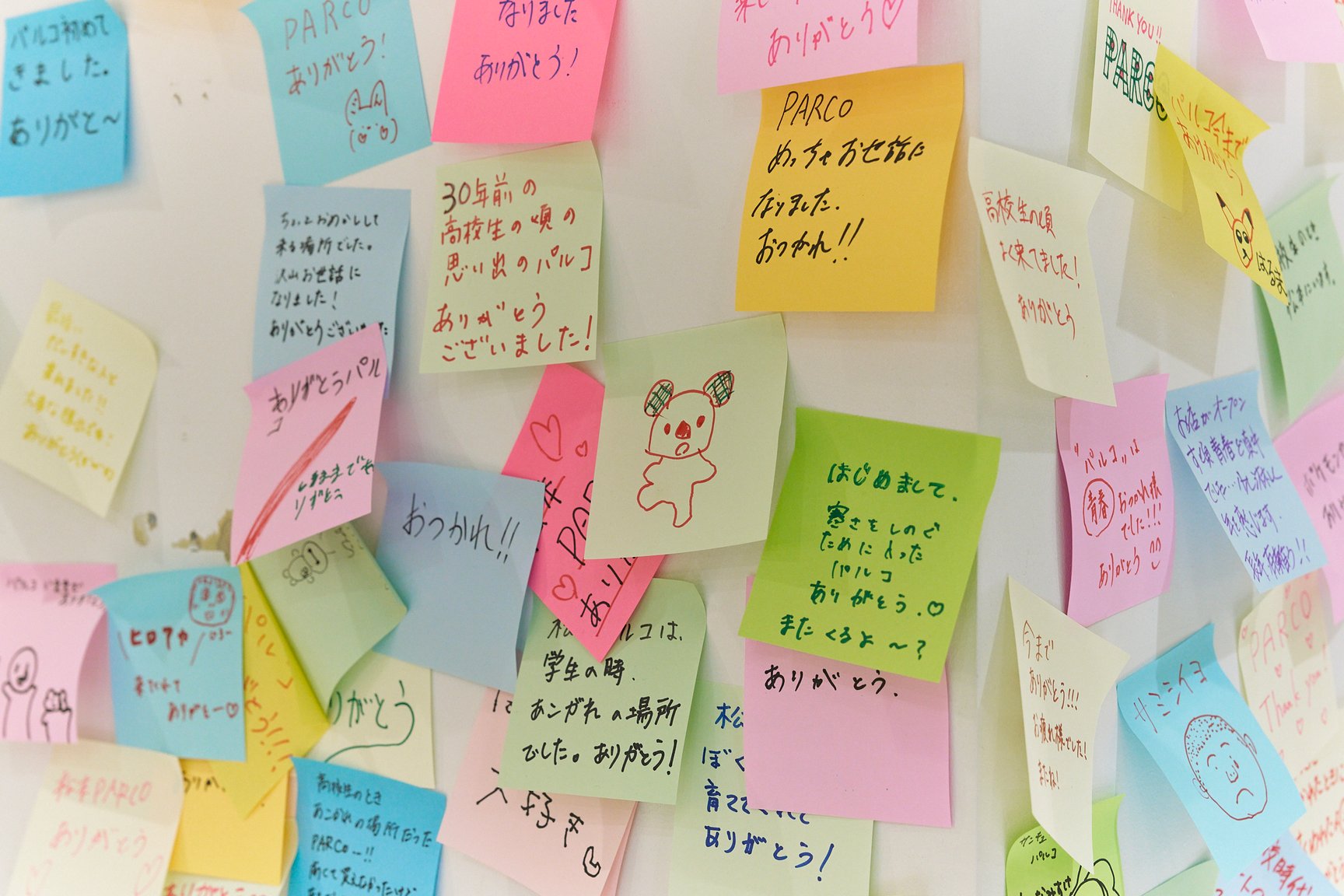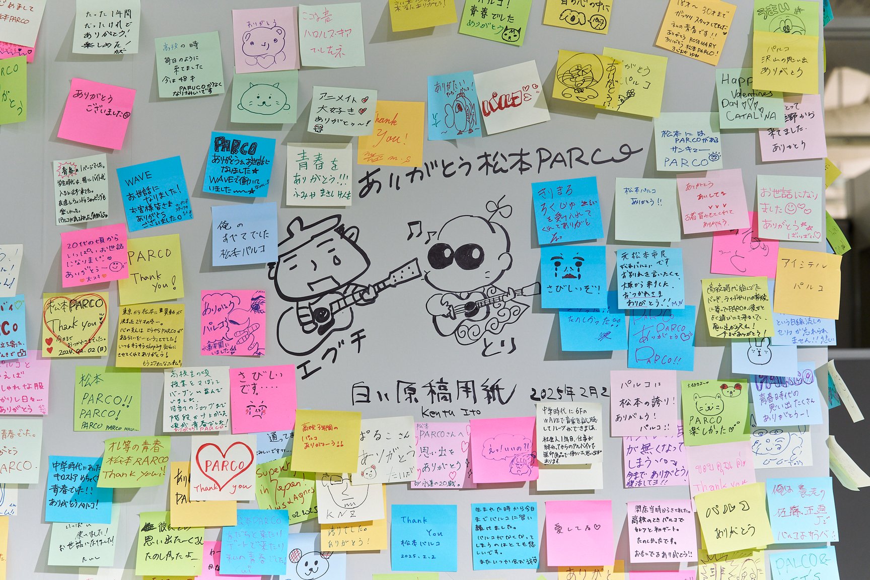 4階特設会場には、2月1日からメッセージボードが設置されている。付箋に寄せられたメッセージには、様々な来店者からの松本パルコへの感謝や同店の思い出が綴られていた。会場では、メッセージを書き添える人や懐かしそうにメッセージを読む来店者の姿が見られた。