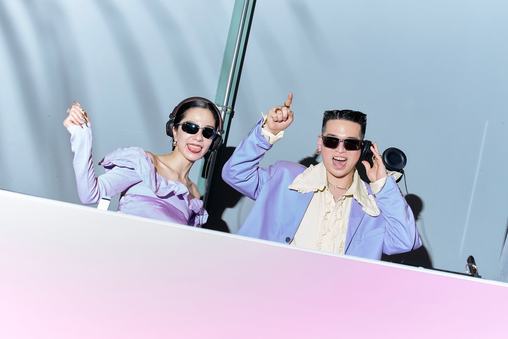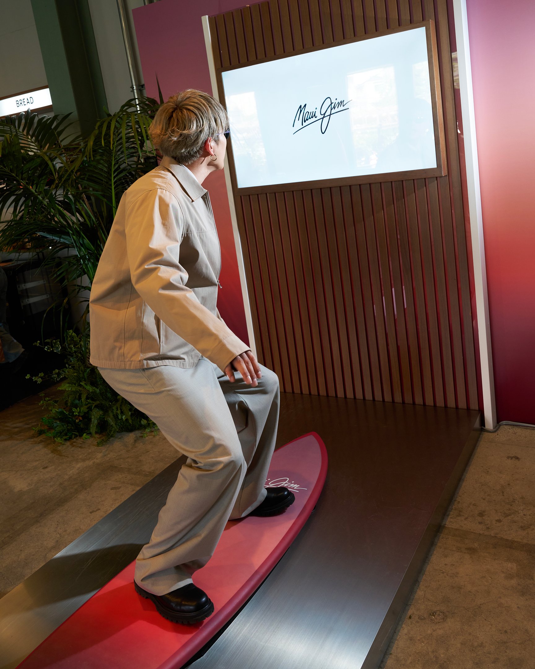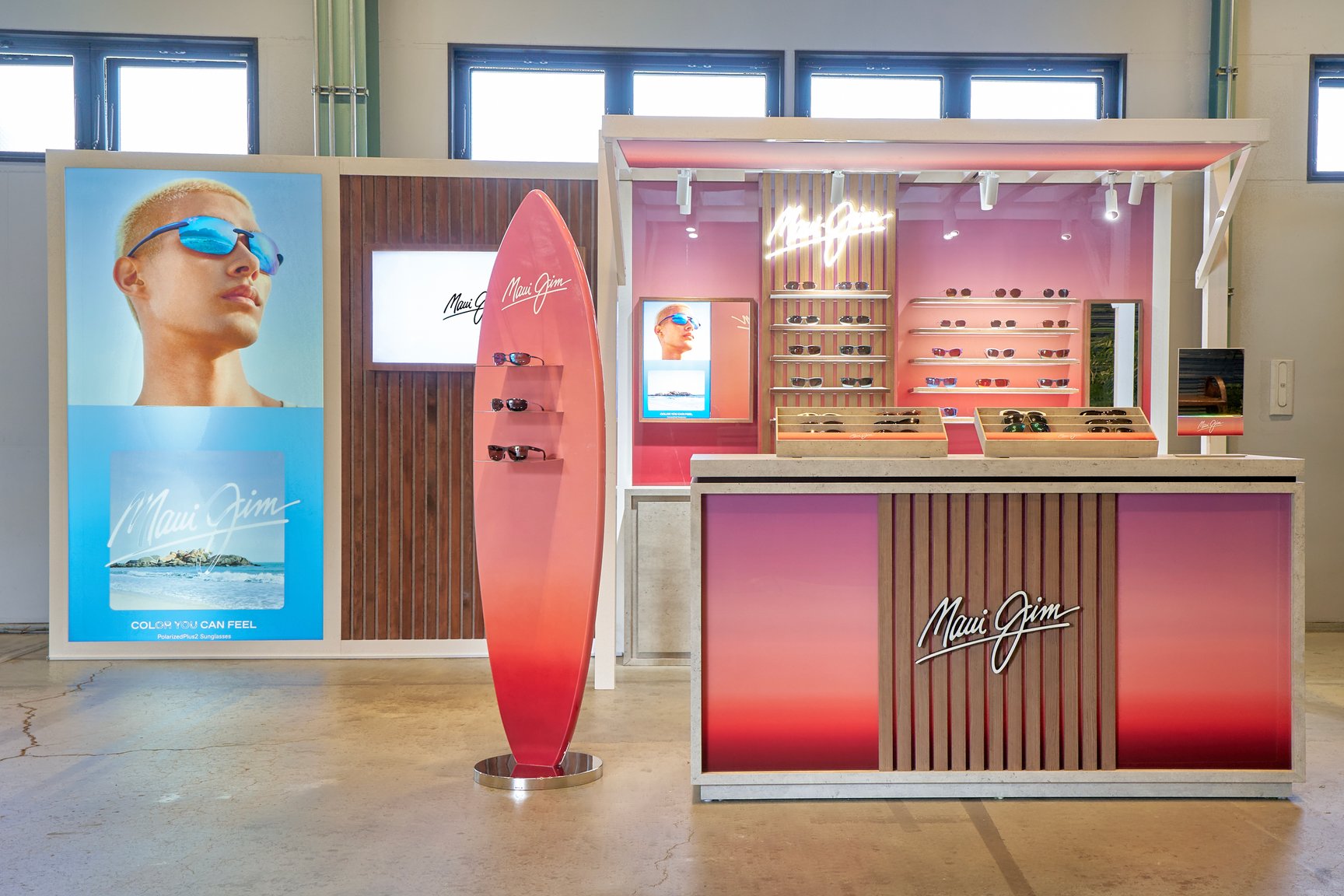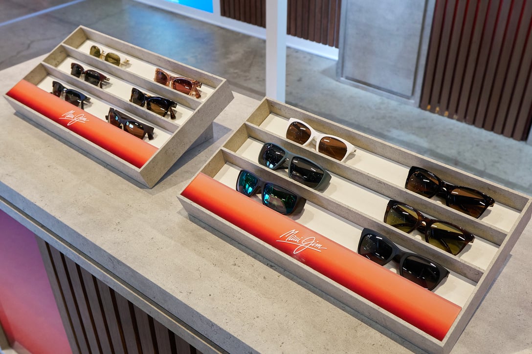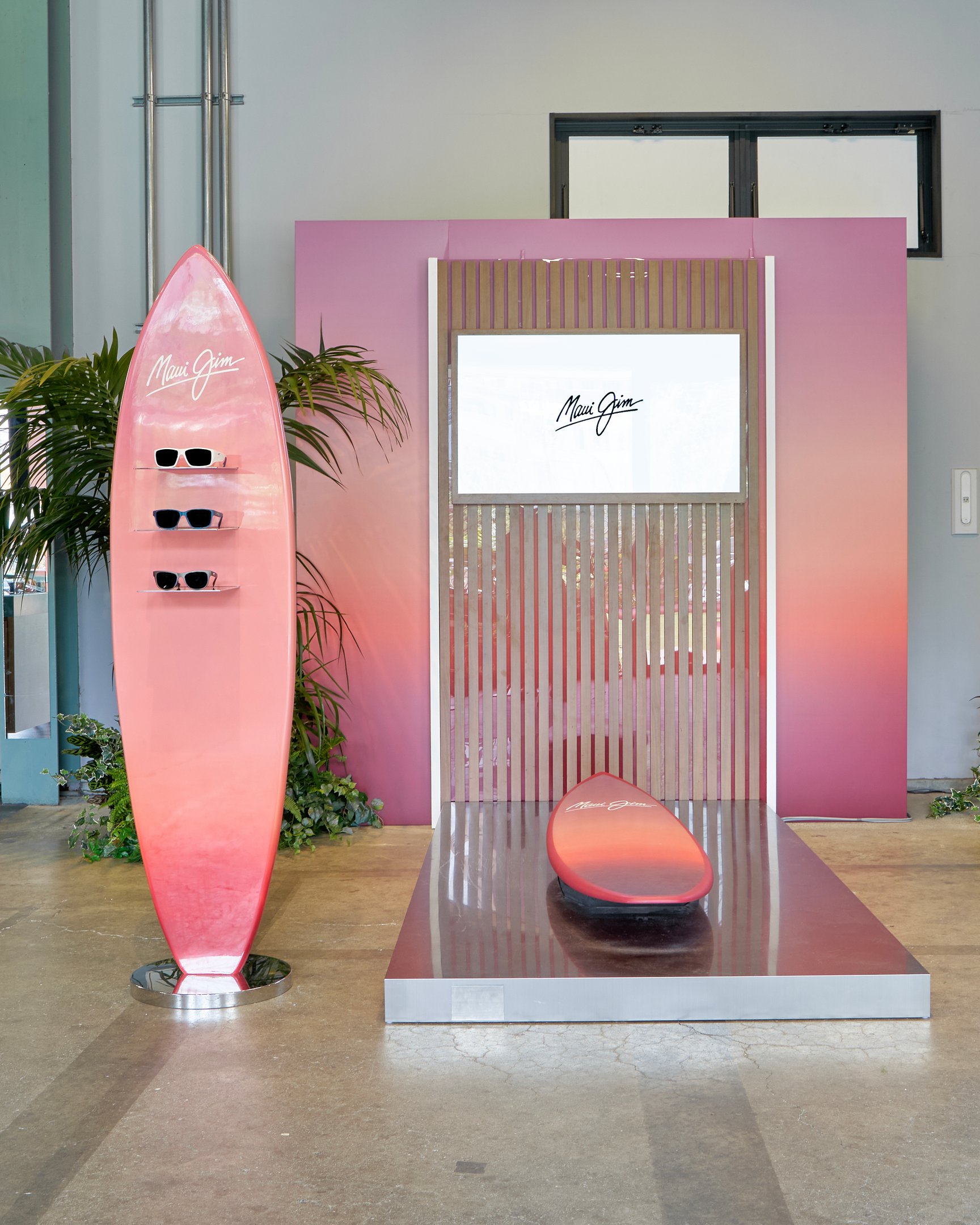 イベント会場では、ブランドのルーツであるハワイの自然を思わせるグリーンやサーフィンをモチーフとしたセットアップなど、ブランドの世界観を体感できる空間がお出迎え。DJデュオのUNA+MATCHAさんが多彩な音楽でイベントを盛り上げる中、南国ムードが漂う空間で2025年春夏コレクションの新作アイウェアの試着や、マウイジムのサングラスの持ち味である「偏光レンズ」の機能性の体験などを楽しみました。