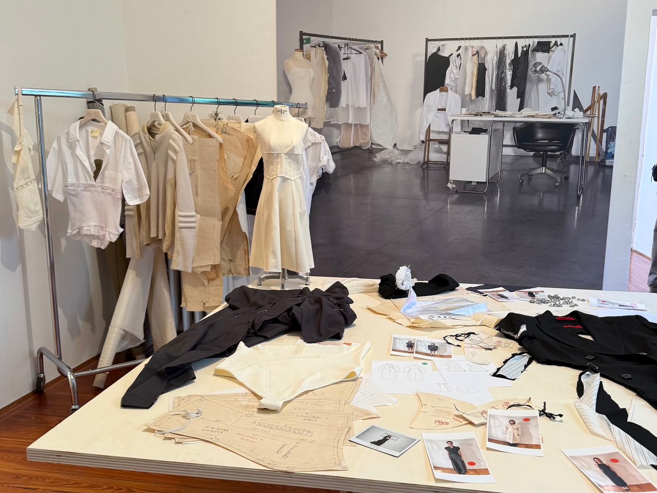 本コレクションは、マックスアンドコーのコラボレーション企画「アンド コラボレーション(&Co.LLABORATION)」の最新作として、2026年春夏シーズンのミラノ・ファッション・ウィーク期間中に発表された。会場はアトリエを思わせる空間で、実際に使用された型紙やトワル、サンプル、制作過程の写真が展示され、ものづくりのプロセスそのものを体感できる演出が施されていた。
