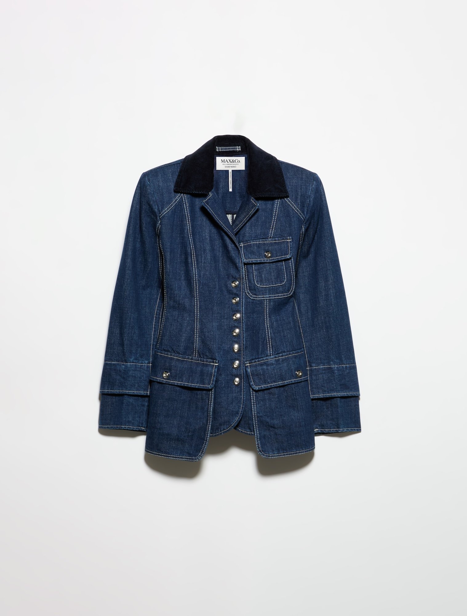 コートは伝統的なテーラリングをベースにしながら、異素材のラペルやスナップボタンで新鮮な表情を演出。デニムブレザーやデニムビスチェ、デニムパンツやスカートは、ホワイトステッチで縫い目を目立たせながら、裾をリメイクしたような切りっぱなしのディテールを施すなど、マックスアンドコーの職人技によって品よく仕上げられている。
